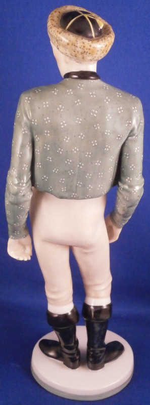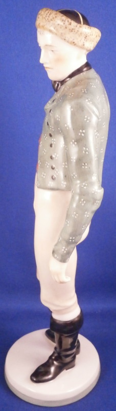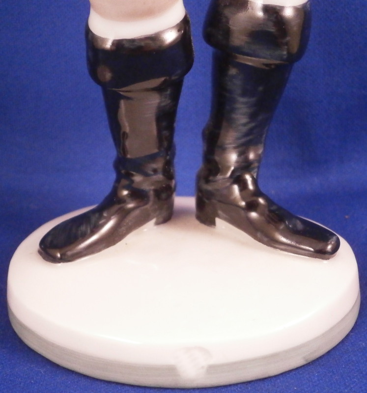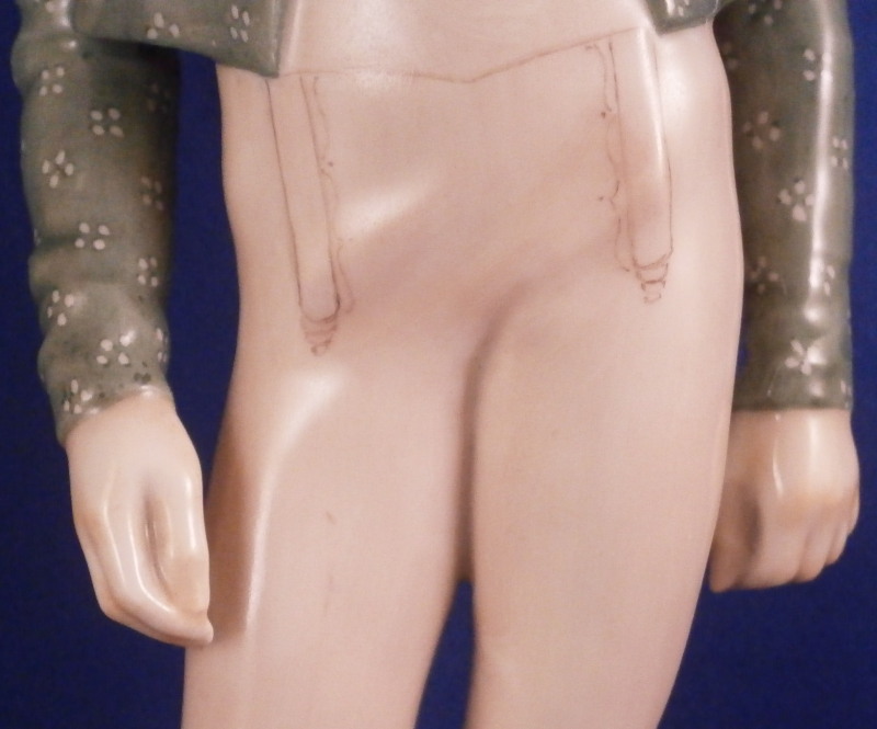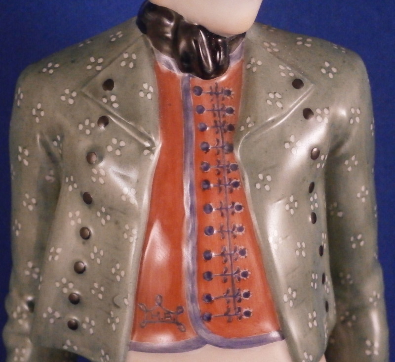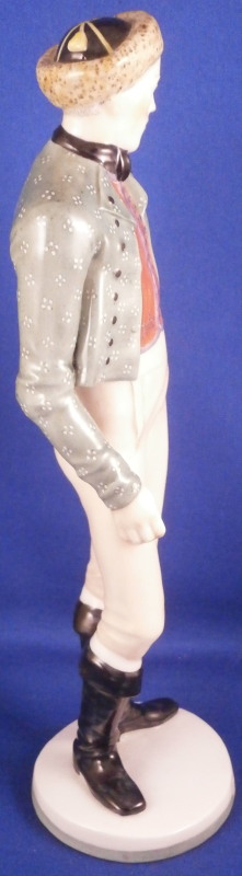 This is a figure of a Franconian gentleman made by Nymphenburg in the early 20th century. Originally modeled by model of Resl Schröder-Lechner , the gentleman is nicely dressed in a traditional Frankonian outfit including a nice hat with a tassel on it, a green jacket and red shirt and some sort of tan pants which might be a type of lederhosen plus black boots while standing on a simple base with a light green trim to the bottom edge. The figure is 8.625 inches tall, 2.875 inches wide and 2.25 inches deep. Marked with the impressed shield mark to the front edge of the base as well as on the underside, the impressed numbers 847 over 0 and the green shield mark with the word Nymphenburg underneath. Germany in black under the base as well. Looks to be from the original period and much nicer than most one sees plus he in perfect condition which is always a plus. Please email me for more information or other pictures.