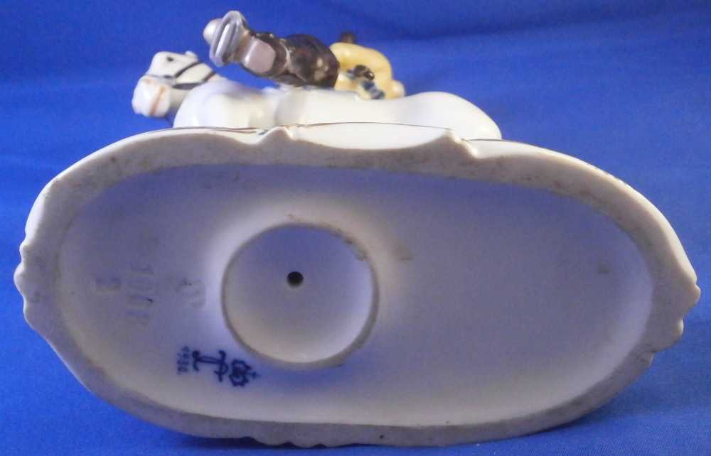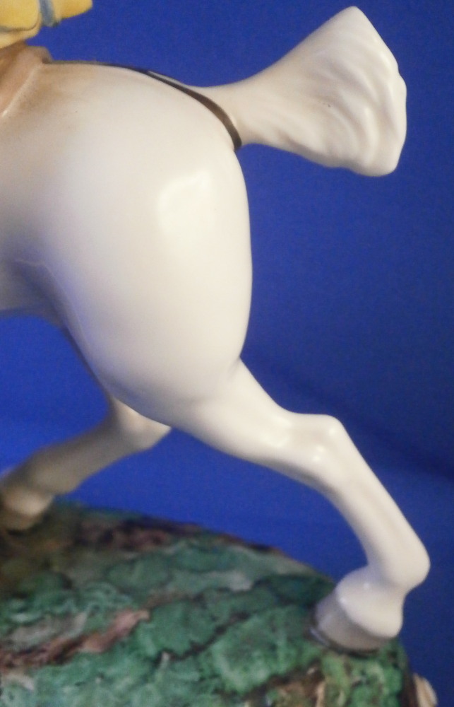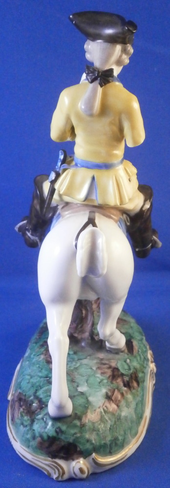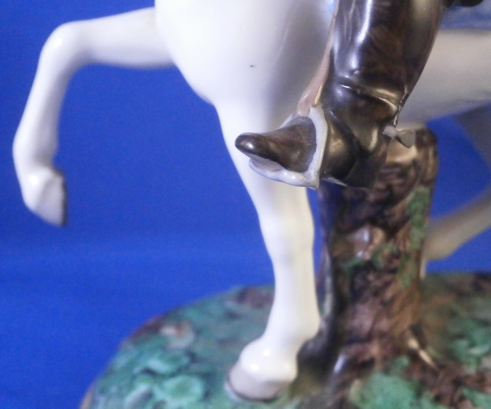 This is a figure of a horse and rider made by Nymphenburg in the earlier 20th century - 1930 to be exact. So almost a true antique! This is a model from the hunting series originally designed by modeled by Carl Gottlieb Lück for Frankenthal in the 1760s. The 18th century pieces are amazing but also impossible to find. They come in three different colors - red, green and yellow as is the case with this figurine. The hunter here is nicely dressed in a typical outfit. He is sitting on his white horse. The horse is modeled with a tree stump under it to support the figure during the firing process and a typical base with gilded scrolls all around. The figurine is 7 inches tall, 2.75 inches wide and 5.25 inches long. Marked with the impressed shield mark underneath as well as the impressed numbers 1063 over 2 and the blue monogram CT for it being a Frankenthal model originally with the year mark 1930 under that. Sadly the piece has seen better days. It displays superbly from one side but the other shows a chip to the top of his boot, a missing right arm and a missing piece of the reigns. Still worth displaying and could be restored though it would not be an easy job. I do have another figure of this exact model that is in perfect condition if that is something you are looking for. Please email me for more information or other pictures.