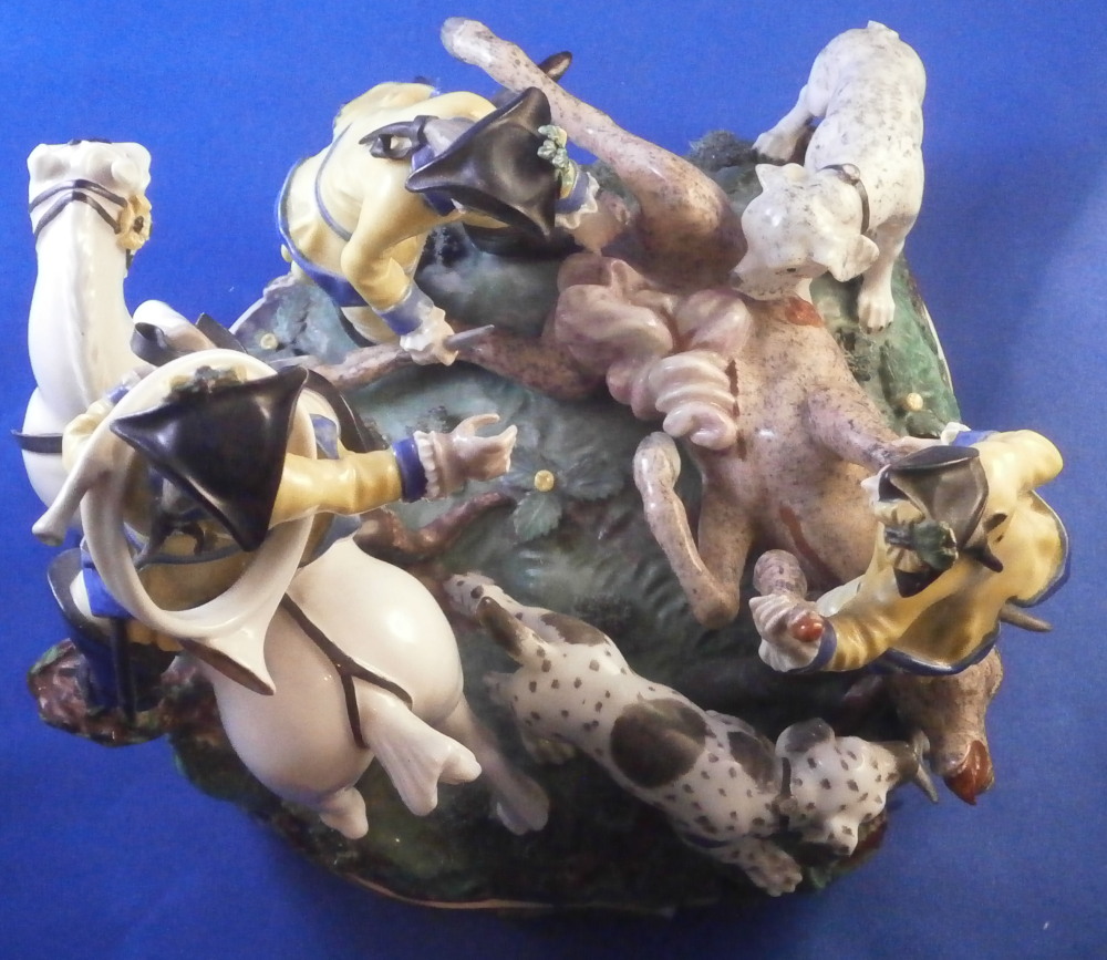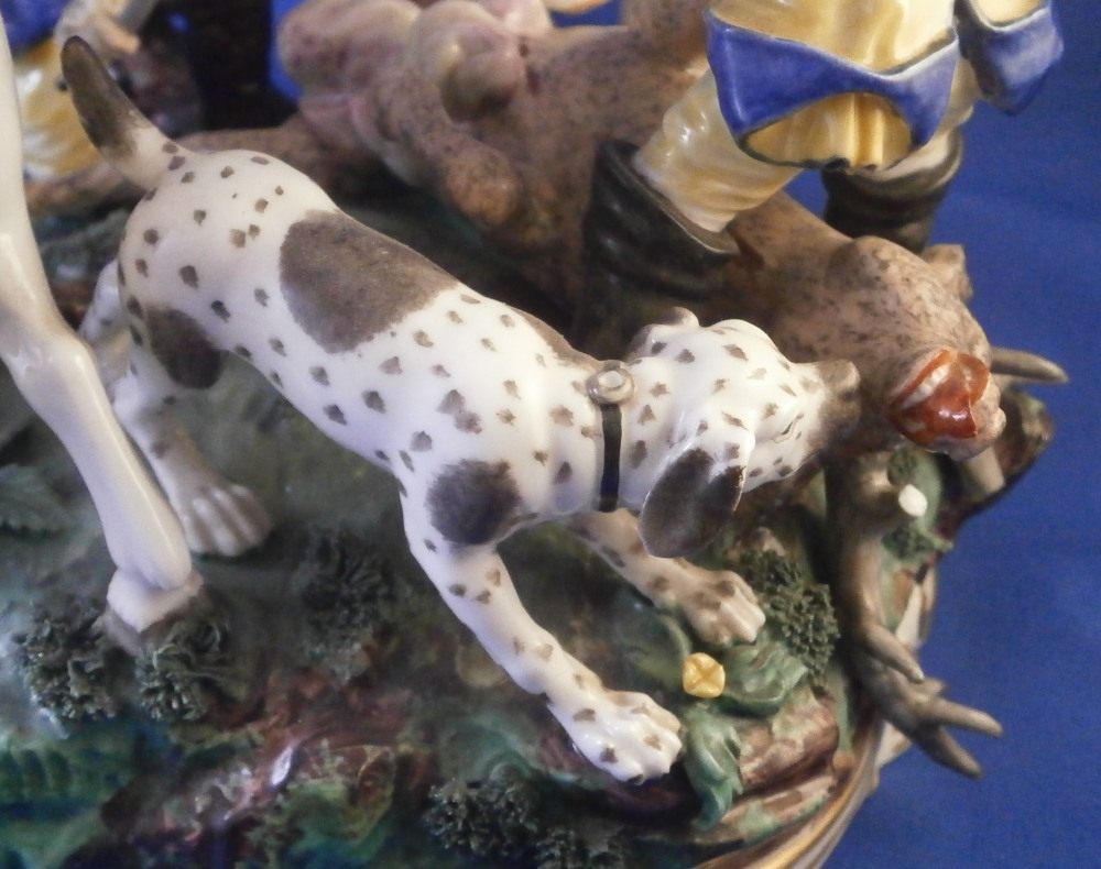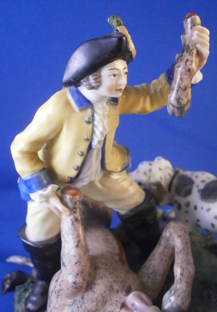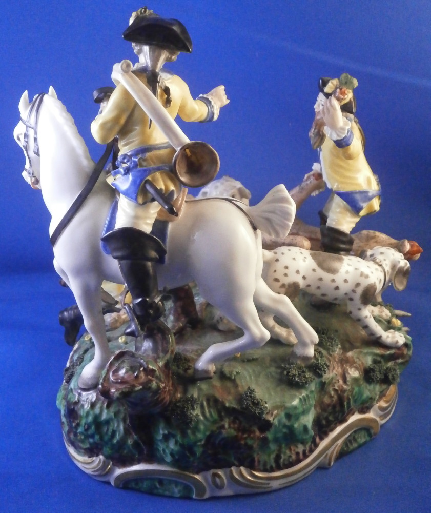 This is a larger figure - the rare center piece to the " Nymphenburger Jagd " group of figurines made by Nymphenburg in the early 20th century. The figure was made by Nymphenburg in the earlier 20th century - 1930 to be exact. So almost a true antique! This is a model from the hunting series originally designed by modeled by Carl Gottlieb Lück for Frankenthal in the 1760s. The 18th century pieces are amazing but also impossible to find. They come in three different colors - red, green and yellow as is the case with this figurine. There are quite a few figures to this hunting table decoration but the center pieces one never sees so I was excited to find it! The figure includes a dead stag deer on the ground that was cut open through the belly with some guts spilling, a hunter standing on the base next to the deer with a cut off leg in his hand, another hunter kneeling on the ground with a knife in his hand, a hunter riding his horse with a hunting horn over his shoulder as well as two hunting dogs standing on the base. The base has a green and black color to it with lots of relief detail and some applied grasses and green flowers. Gilded scrolls all around the bottom edge. As nice a figure as you will find from this set with an amazing amount of detail to it. The piece is marked with the impressed shield mark as well as the number 1067 over 1 and the blue monogram CT for it being a Frankenthal model originally with the year mark 1930 under that as shown. The figurine is about 7.25 inches tall, 7.5 inches wide and 6.5 inches deep. This is the smaller version of this group as they also made a larger one that is exactly the same but the size. The figurine is in great condition, a tail of one of the dogs missing, an oak leaf design on the hat of the rider missing, the reigns going from the horse's belly to his head missing, one yellow blossom missing and two pieces of the stag's antlers missing and another piece reglued. That damage is to be expected after it being almost 100 years old. A very fragile piece that still displays perfectly! Please email me for more information or other pictures.
