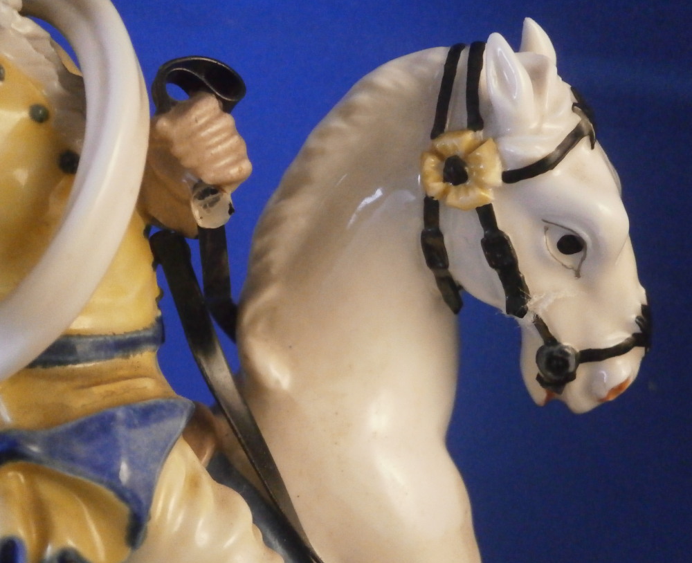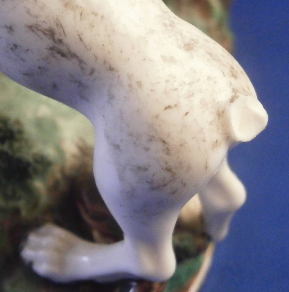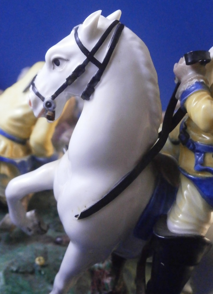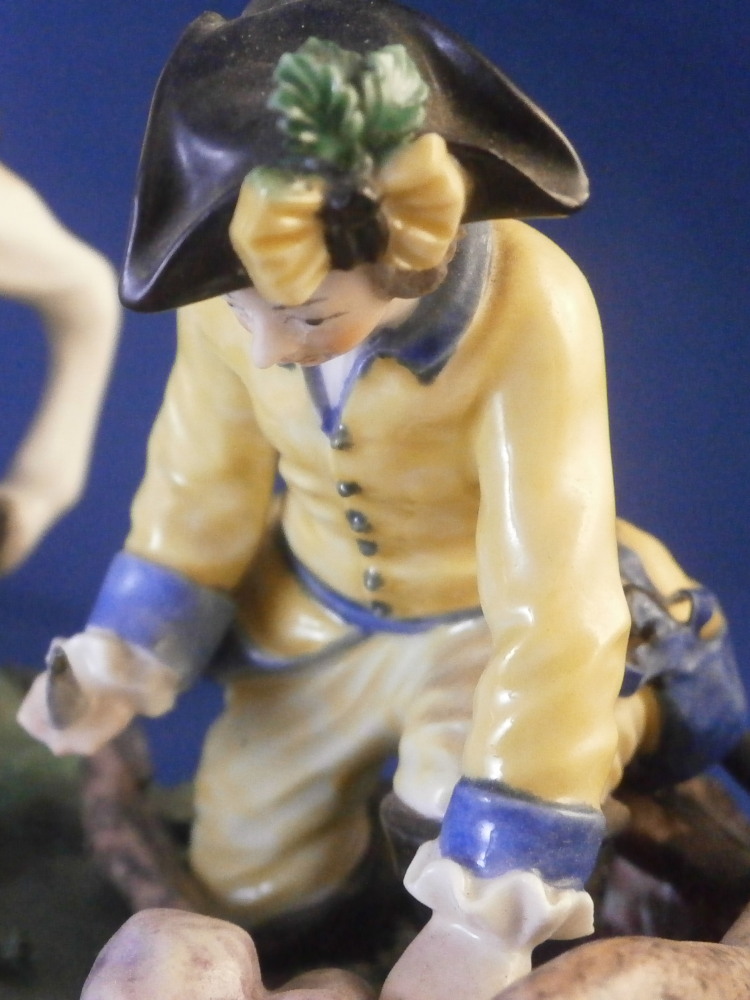 This is a larger figure - the rare center piece to the " Nymphenburger Jagd " group of figurines made by Nymphenburg in the early 20th century. The figure was made by Nymphenburg in the earlier 20th century - 1930 to be exact. So almost a true antique! This is a model from the hunting series originally designed by modeled by Carl Gottlieb Lück for Frankenthal in the 1760s. The 18th century pieces are amazing but also impossible to find. They come in three different colors - red, green and yellow as is the case with this figurine. There are quite a few figures to this hunting table decoration but the center pieces one never sees so I was excited to find it! The figure includes a dead stag deer on the ground that was cut open through the belly with some guts spilling, a hunter standing on the base next to the deer with a cut off leg in his hand, another hunter kneeling on the ground with a knife in his hand, a hunter riding his horse with a hunting horn over his shoulder as well as two hunting dogs standing on the base. The base has a green and black color to it with lots of relief detail and some applied grasses and green flowers. Gilded scrolls all around the bottom edge. As nice a figure as you will find from this set with an amazing amount of detail to it. The piece is marked with the impressed shield mark as well as the number 1067 over 1 and the blue monogram CT for it being a Frankenthal model originally with the year mark 1930 under that as shown. The figurine is about 7.25 inches tall, 7.5 inches wide and 6.5 inches deep. This is the smaller version of this group as they also made a larger one that is exactly the same but the size. The figurine is in great condition, a tail of one of the dogs missing, an oak leaf design on the hat of the rider missing, the reigns going from the horse's belly to his head missing, one yellow blossom missing and two pieces of the stag's antlers missing and another piece reglued. That damage is to be expected after it being almost 100 years old. A very fragile piece that still displays perfectly! Please email me for more information or other pictures.