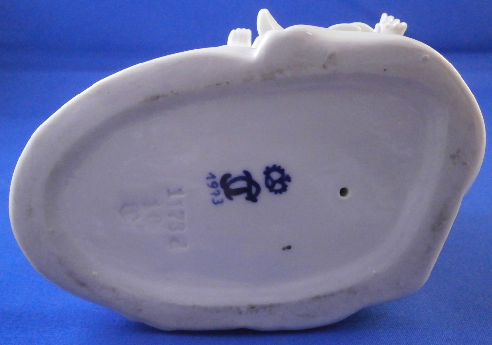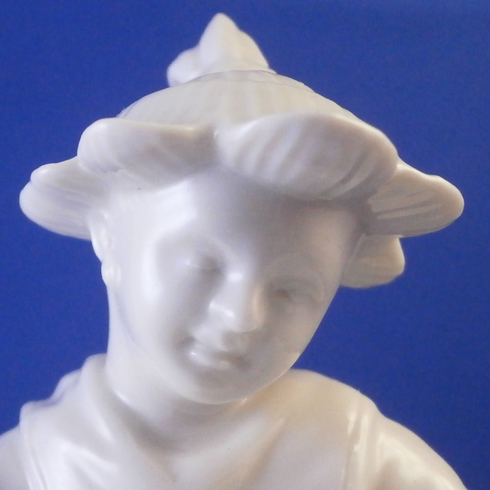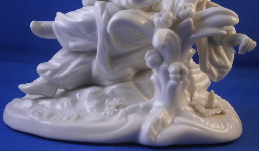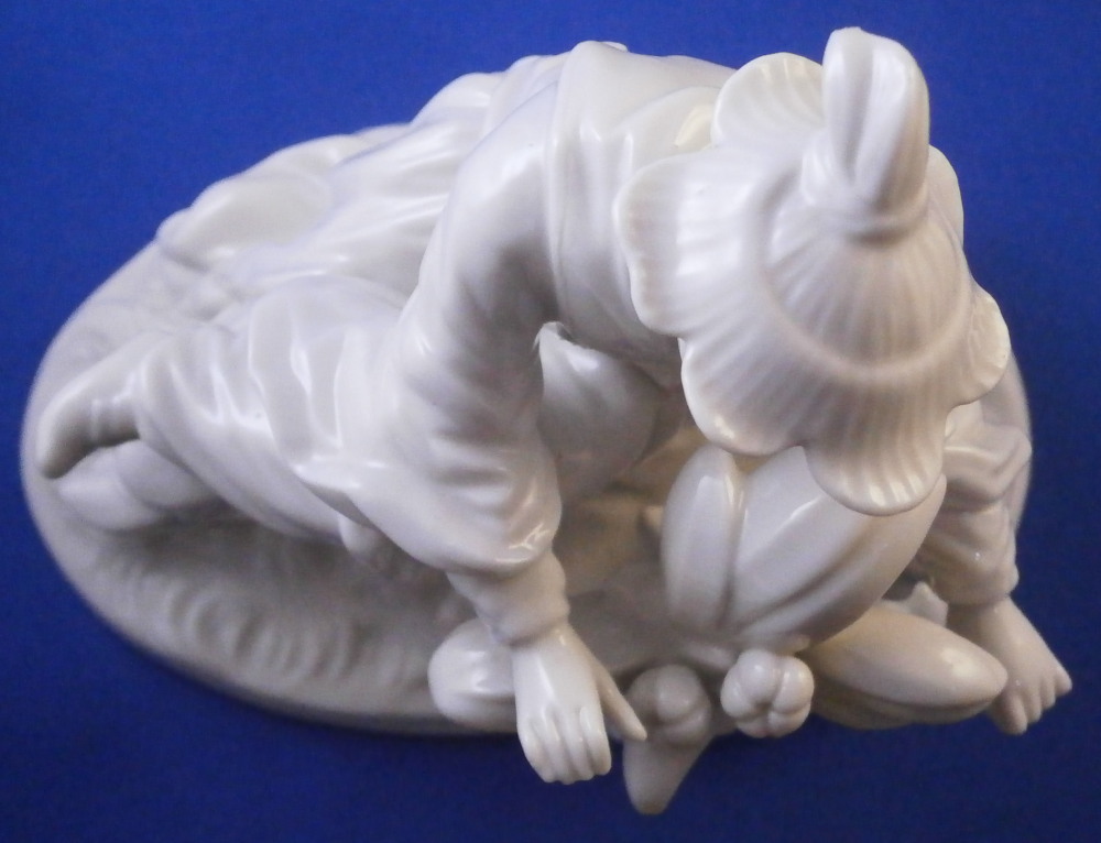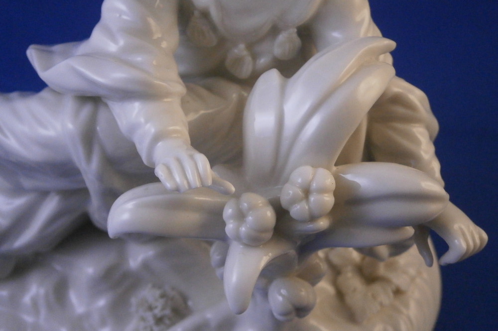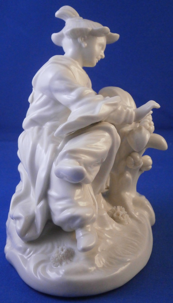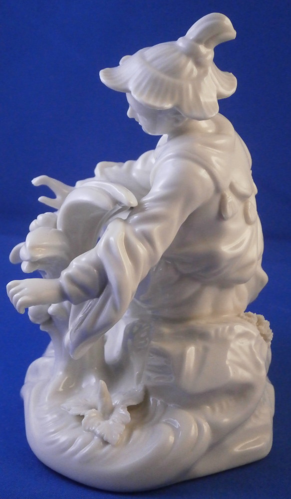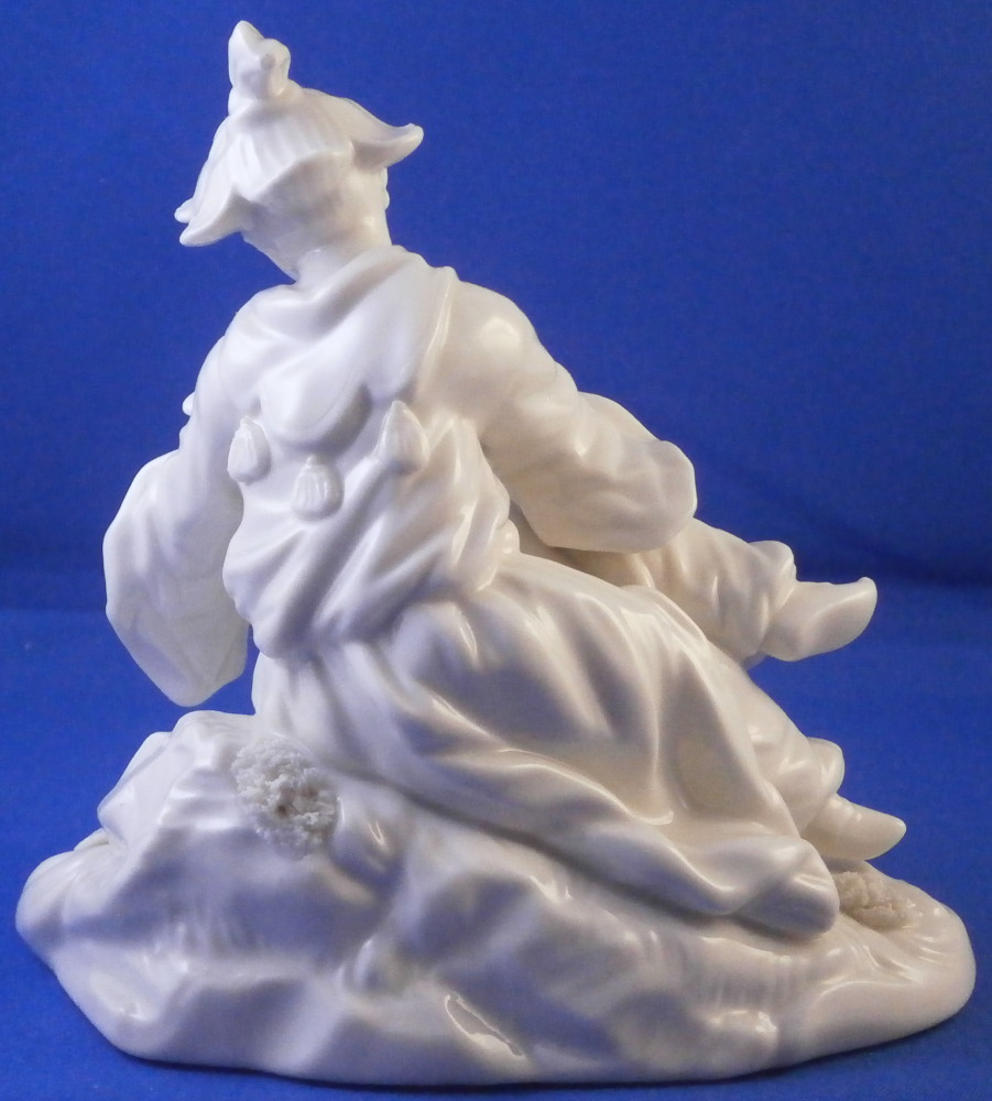 This is a Chinoiserie style figurine made by Nymphenburg from an original Frankenthal model in the 20th century - 1973 to be exact. Described as an Asian gentleman sitting behind a palm tree. He is nicely dressed in a flowing outfit while wearing a hat and sitting on a typical base for this maker with some grasses on it. The palm tree with fruit on it in front. It's a really nicely modeled piece left in the white to show off all that amazing detail. Originally this was modelled in Frankenthal in the 18th century. One rarely ever sees this model. The figure is 4.5 inches tall, 4.75 inches wide and just over 3 inches deep. It is in perfect condition! The figurine is marked underneath with the impressed shield mark as well as the impressed numbers 1173 d over 10 and the under glaze blue CT under a crown mark with the year mark 1973 as shown. Please email me for more information or other pictures.