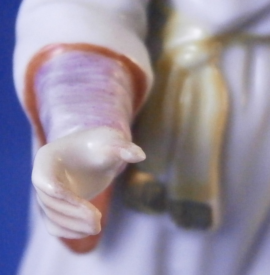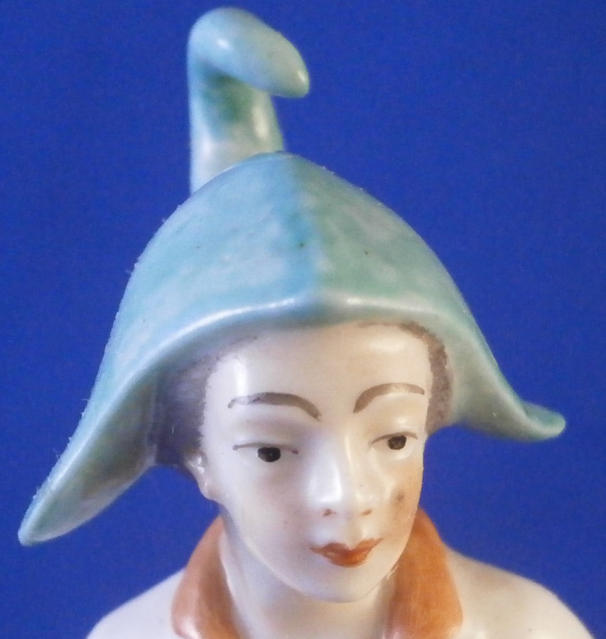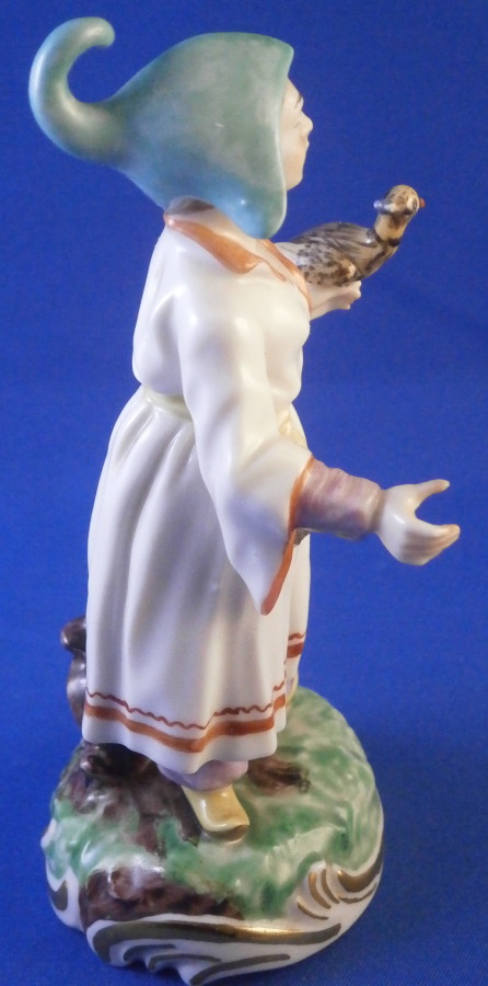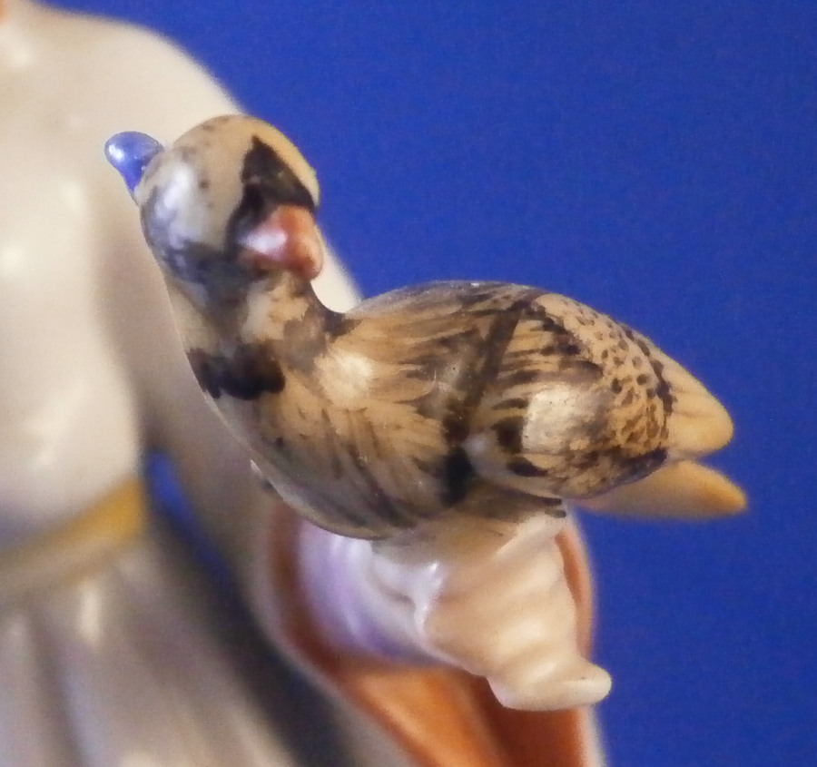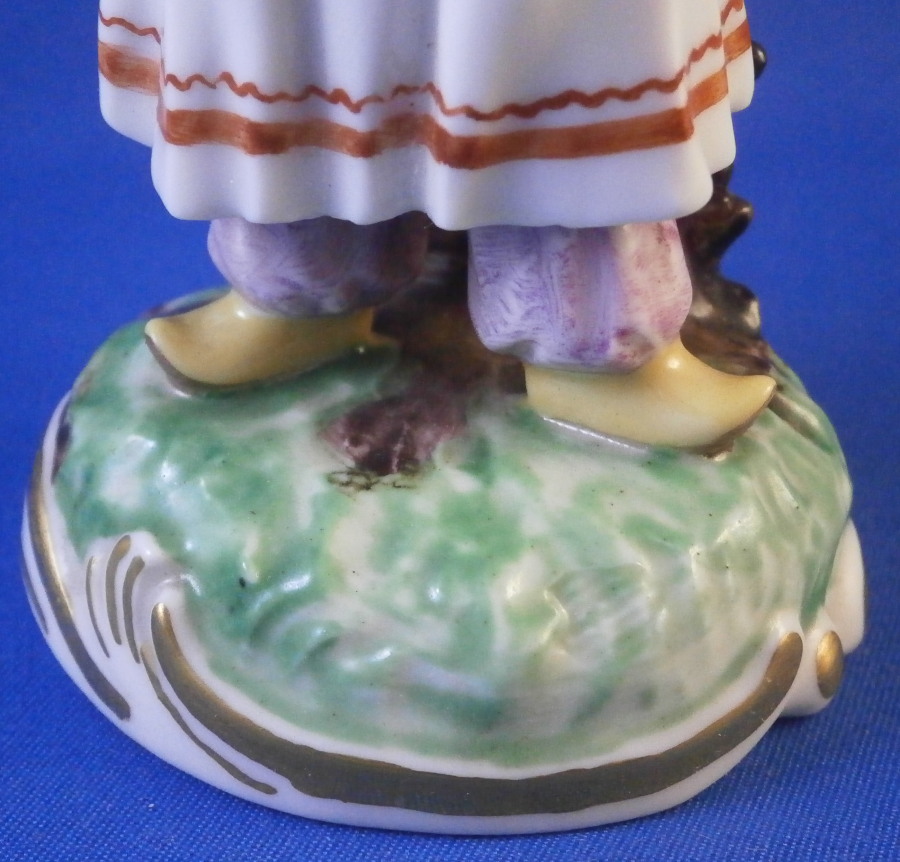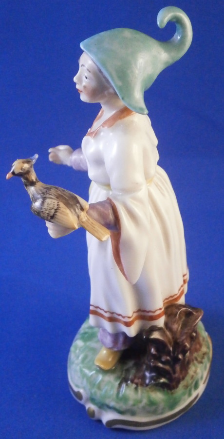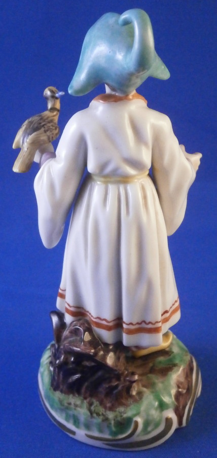 This is a figure of a Asian / Oriental lady made by Nymphenburg in 1929. Nymphenburg made a whole series of these and they are really nice and one does not see them often at all, I ahve not seen this model before. It is of a lady dressed in Oriental clothing holding a bird in her left hand. I easpecially like her hat and the bird. She is standing on a nicely done base with some gold scrolls to the edge. Off course based on an 18th century Frankenthal model hence the CT mark as well as their mark. The figure is 4.875 inches tall, 2.25 inches wide and 2 inches deep. Marked with the impressed shield mark to the front base by her left foot though it is almost impossible to spot because it was painted over. Marked underneath with the numbers that are covered up by a sticker and the CT monogram under the crown as well as the year mark for 1929. The figurine is in perfect condition which is always a nice bonus! Please email me for more information or other pictures.