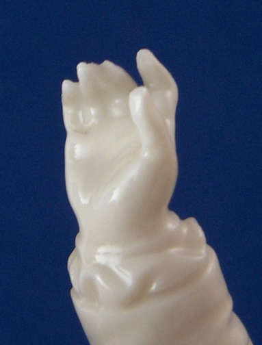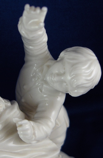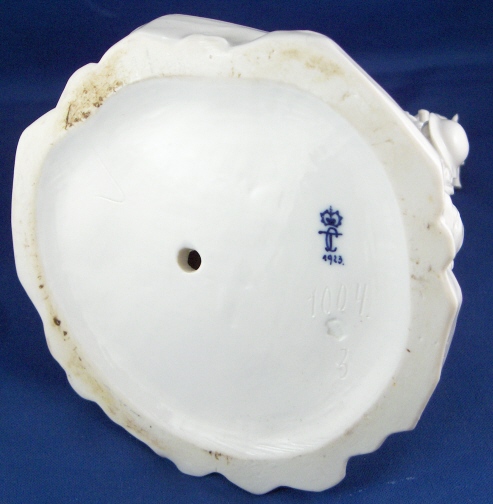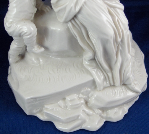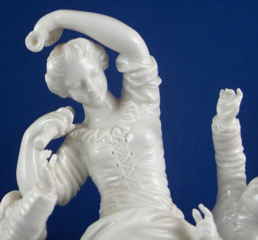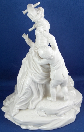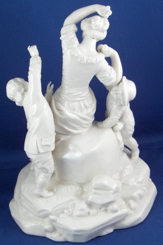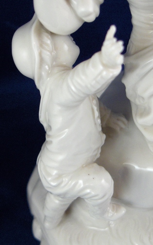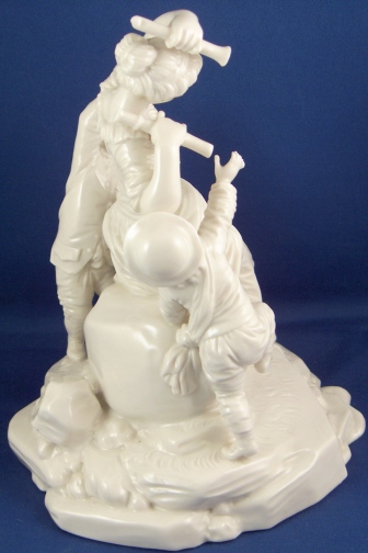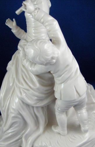 This is a large figure of a lady holding two flutes awau from two kids made by Nymphenburg in 1923. It was originally an 18th century Frankenthal model but most of their models moved to Nymphenburg somewhere along the way. The figurine is very well modeled and left in the white to show off all the detail! Really a fun piece and I know exactly how she feels :) Except I got three kids! The figure is 7 inches tall with a base diameter of about 5.75 inches. The piece is marked underneath with the impressed shield mark and the numbers 1004 and 3 incised. It also has the CT mark under a crown in blue with the year mark 1923. There is an impressed shield mark on the front corner of the base as well. The piece is in superb condition with the finger tip of middle finger of the upper hand of boy on the right missing a tiny piece. Not obvious nor does it distract whatsoever. Please email me for more information or other pictures.
