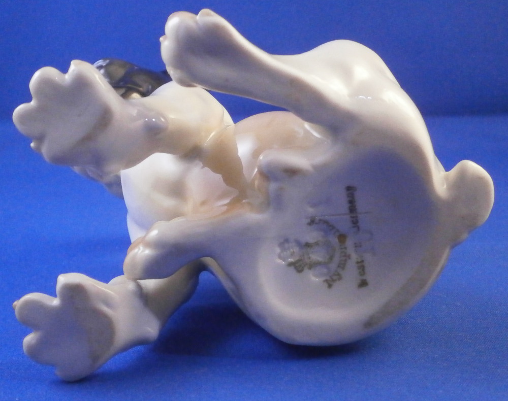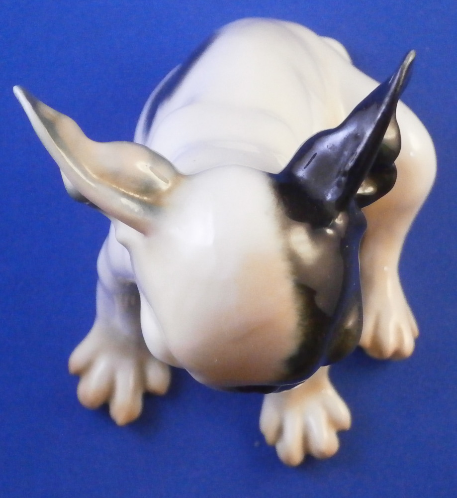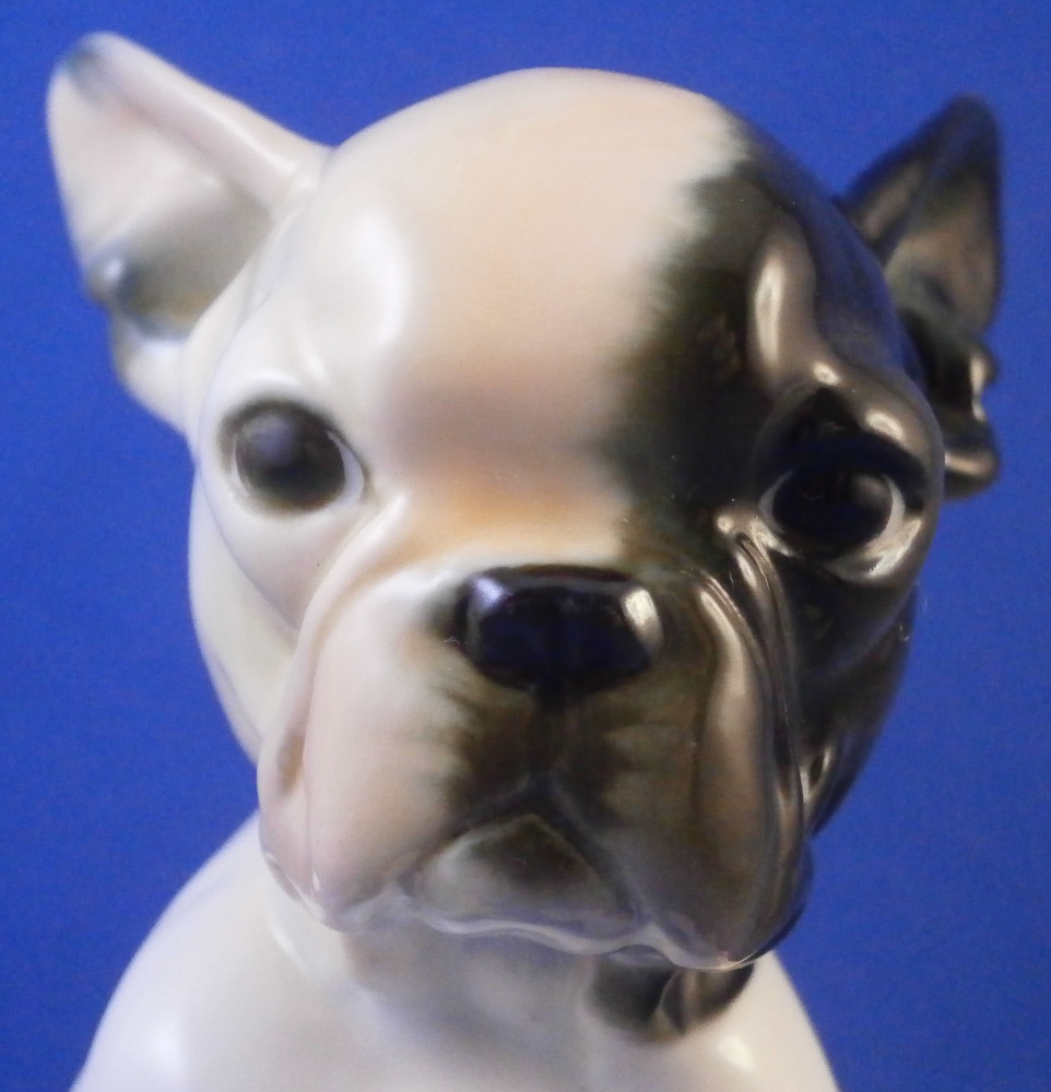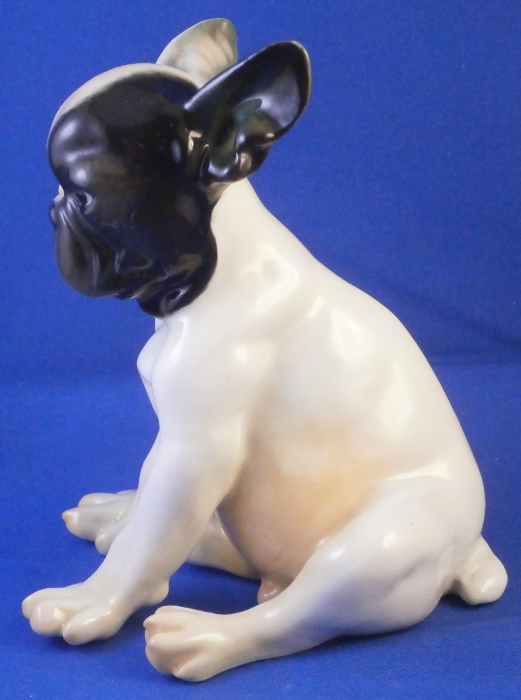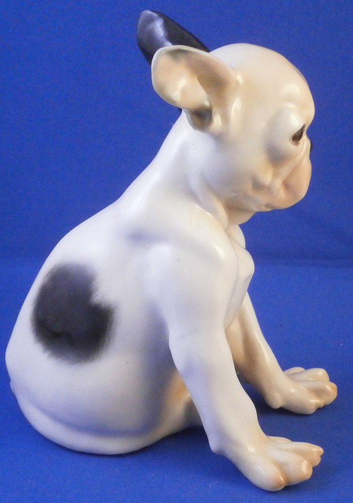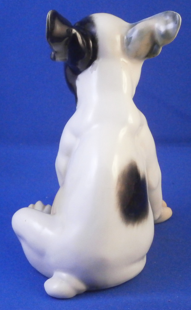 This is a figure of a little french bulldog or pittbull puppy (at least I think it is a puppy) made by Nymphenburg in the mid 20th century. A truly cute dog and not one you see often at all! The figurine is superbly modeled and hand painted to perfection! It shows why Nymphenburg dog models are the ebst out there! The piece is 4 inches tall, 3.875 inches long and 3 inches wide and in perfect condition, same as the day he was made. The dog is marked underneath with the impressed shield mark as well as the incised numbers 649, 1 and 16 as well as the green shield mark with Nymphenburg underneath and Western Germany so it was made right after WWII. Please email me for more information or other pictures.