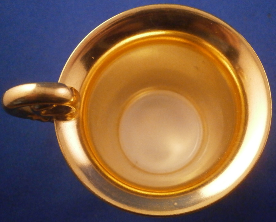 This is an amazing demitasse sized cup and saucer made by Nymphenburg in the early 20th century. It is probably the nicest small set I have owned from this period with a perfect blend of a superb shape with a matte blue ground color and lots of superb tooled gilding. Truly a master piece! I always really like the matte ground colors but they are so rare that one does not see them often. I think they look much better with the nice gilding than a shiny ground color. The inside is fully gilded as is the handle. The cup is 2.75 inches tall including the handle with a diameter of 2.375 inches. The saucer is 0.875 inches tall and 4.125 inches in diameter. Both are marked with the underglaze green shield mark with the word Nymphenburg underneath, the usual impressed marks and some black letters and numbers under the cup as shown. The set is in perfect condition with just the tiniest amount of use marks to the gilding. A super cute set that looks much nicer in person! Please email me for more information or other pictures.