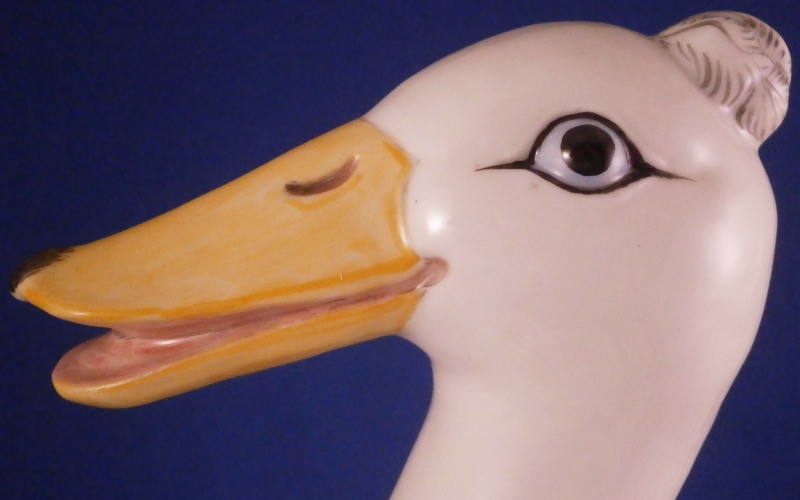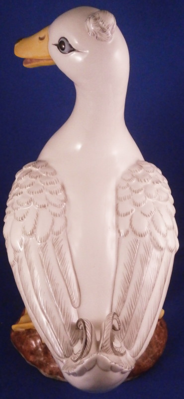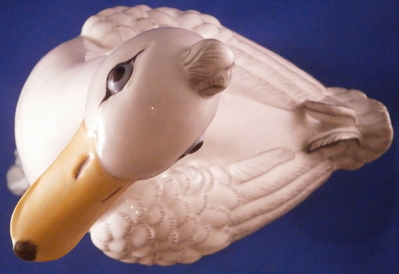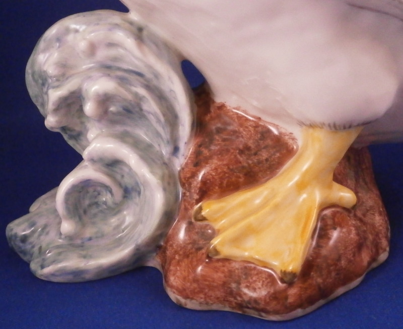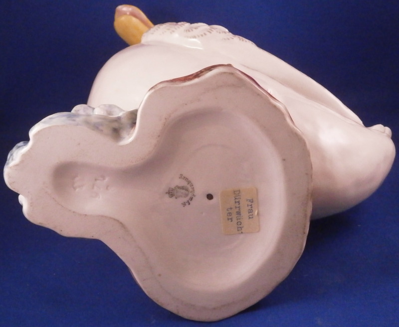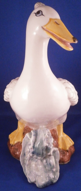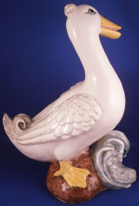 This is a really fun figurine of a duck made by Nymphenburg during the mid 20th century. This is a very rare model that I believe is one of the few also made in majolica though I am not totally sure. I have only seen a handful of these over the years if that. Nicely modeled in a very modern kind of way with superb coloring. Standing on a rock with a wave hitting the rock in the front. I am not sure who modeled this piece but it might have been Terletzki-Scherf since she liked the crazy animals :) The bird is 10 inches tall, 7.5 inches long and 4.75 inches wide so rather large. It is marked with the impressed shield mark underneath the base as well as the impressed model number 971 / a and the number 8. There is also the green shield mark under a crown with the word Nymphenburg underneath as as shown. The piece is in perfect condition. Please email me for more information or other pictures.