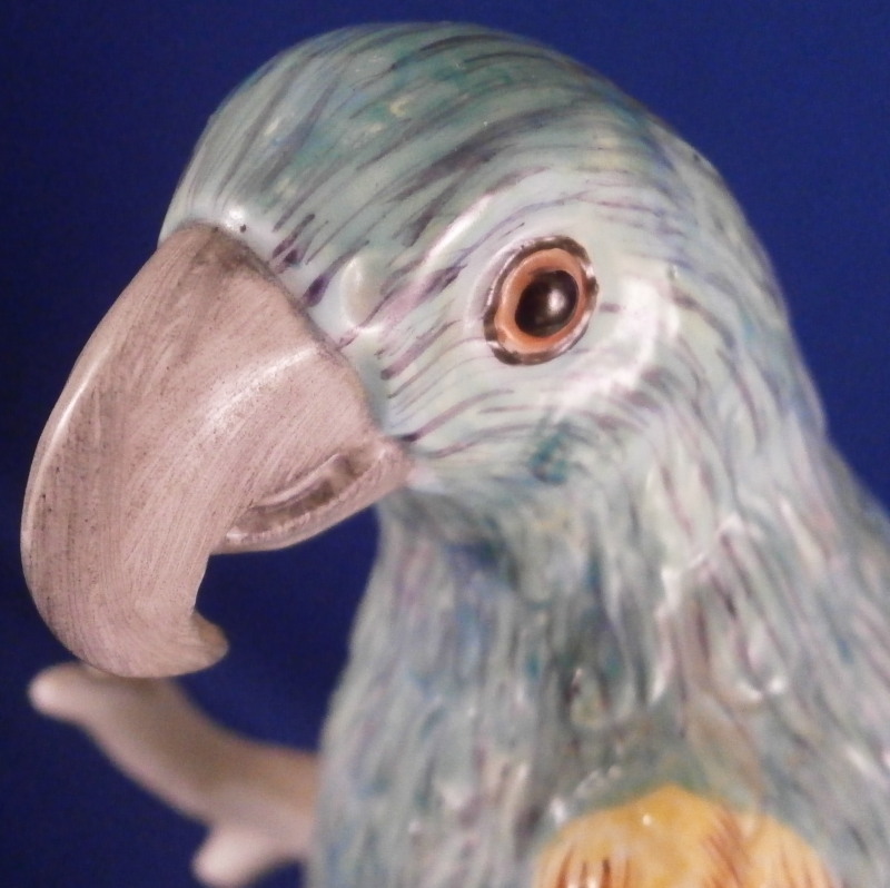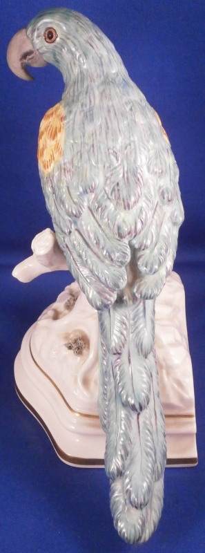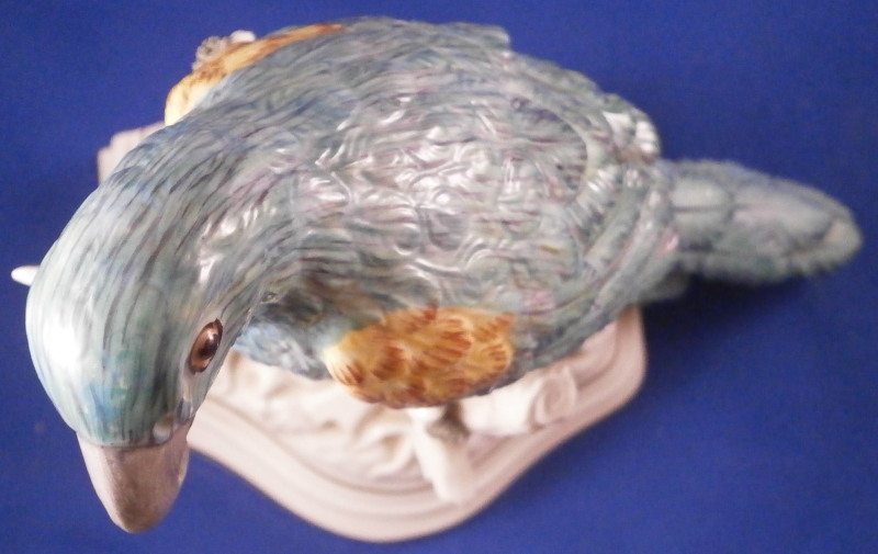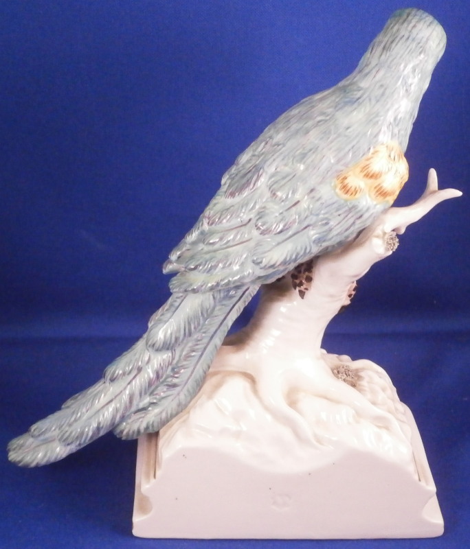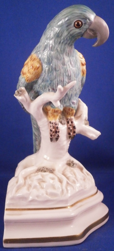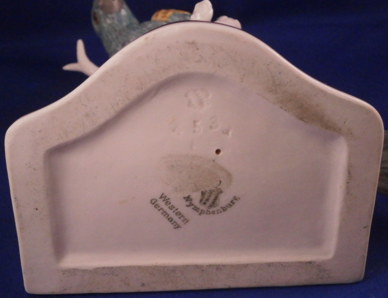 This is a really fun figurine of a parrot made by Nymphenburg around the mid 20th century right after WWII. The polychrome bird is nicely modeled and hand painted to perfection. It is sitting on a superbly modeled tree trunk on a nice base with a bit of gold trim to it. Some grasses scattered about the base and trunk. One of those pieces that just make you happy when you look at it displayed in your house! The figure is in perfect condition which is amazing given the fragile nature of some of the details. The piece is marked underneath with the impressed shield mark, the numbers 453a over 6 (I think - this number is hard to read!) and the green shield mark under a crown with Nymphenburg underneath it as shown as. Also in green are the words Western Germany. Another impressed shield mark to the flat back of the base as shown. The center of the base was ground flat a bit so it would sit better on a flat surface. The piece is 6.25 inches tall, 5.75 inches wide and about 3.125 inches deep. Please email me for more information or other pictures.