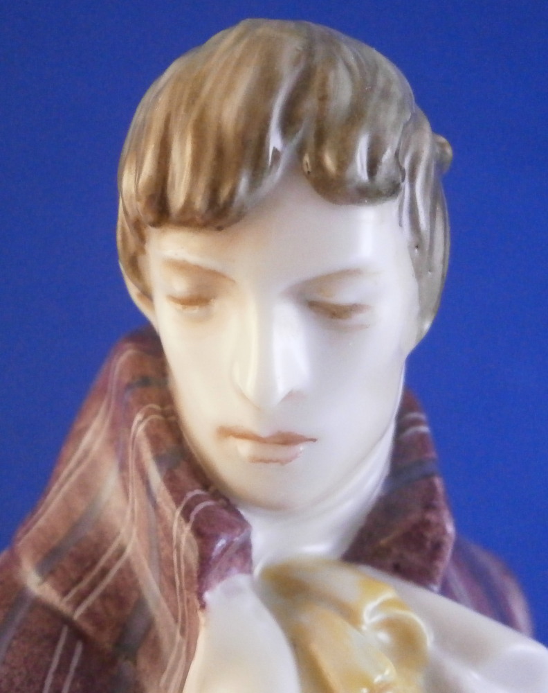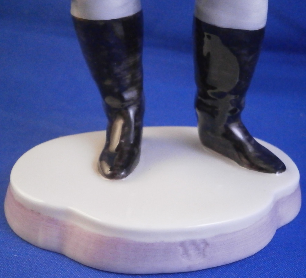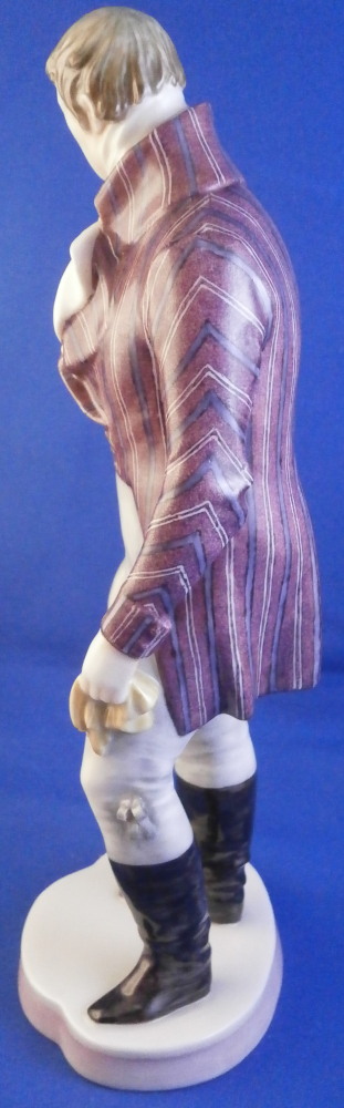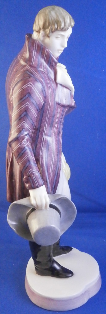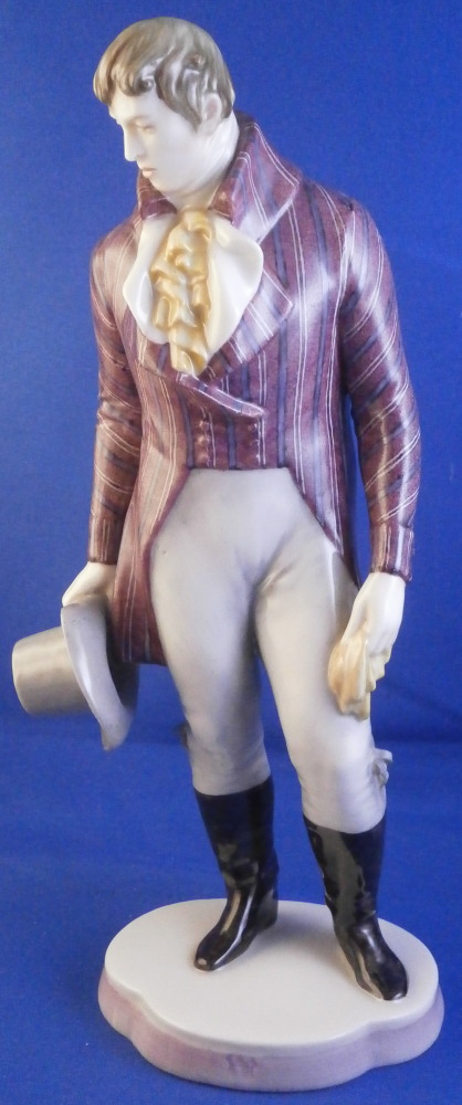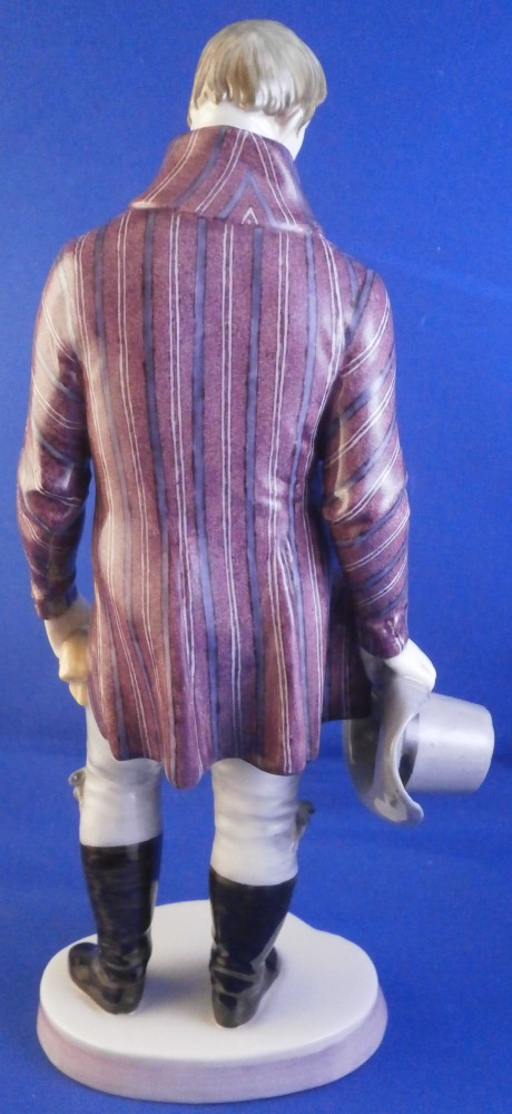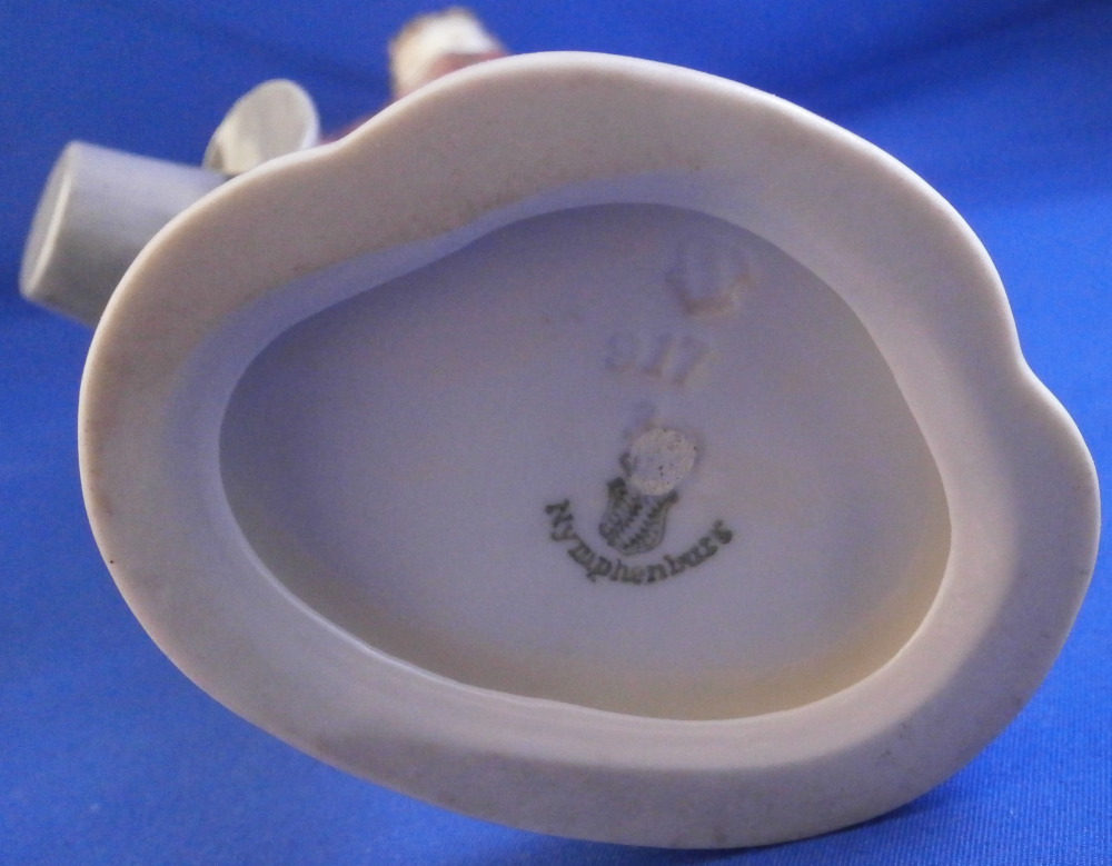 This is a figure of a gentleman made by Nymphenburg in the early 20th century. He is elegantly dressed in a long coat with a nice striped design to it, a big fluffy shirt showing in the center top of the coat while holding a hat in his right hand and a handkerchief in the left. Typical base for this period with a bit of pink trim to the edge. He is really looking sharp and ready to go on a hot date! I am not sure who modeled this figure as I cannot find it in my books and could only find one other which did not help any. I think he has the look of a Josef Wackerle piece but I might just be imagining things. Definitely a rare model! The figure is 8.375 inches tall, 3.625 inches wide and 2.5 inches deep. Marked with the impressed shield mark to the front of the base as well as to the underside , the impressed numbers 917 over 3 and the green shield mark with the word Nymphenburg underneath. The figurine is in perfect condition which is always a plus. Please email me for more information or other pictures.