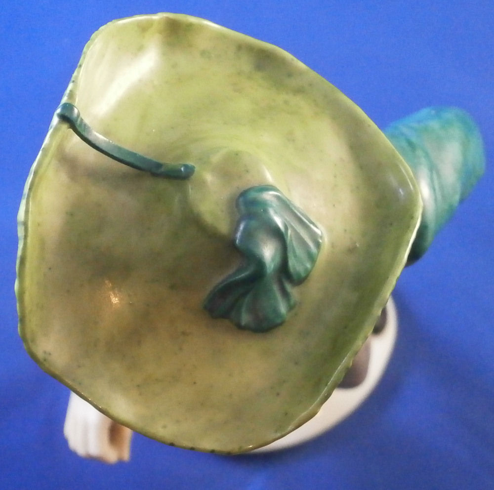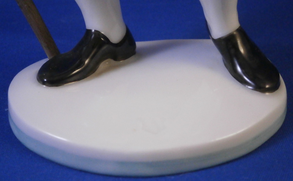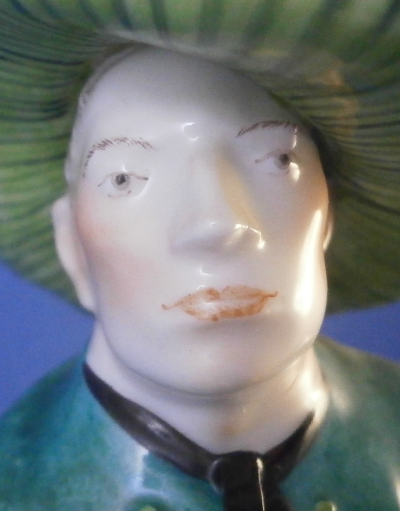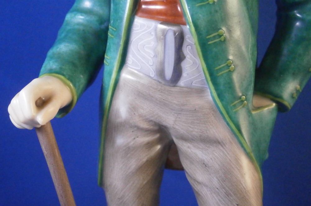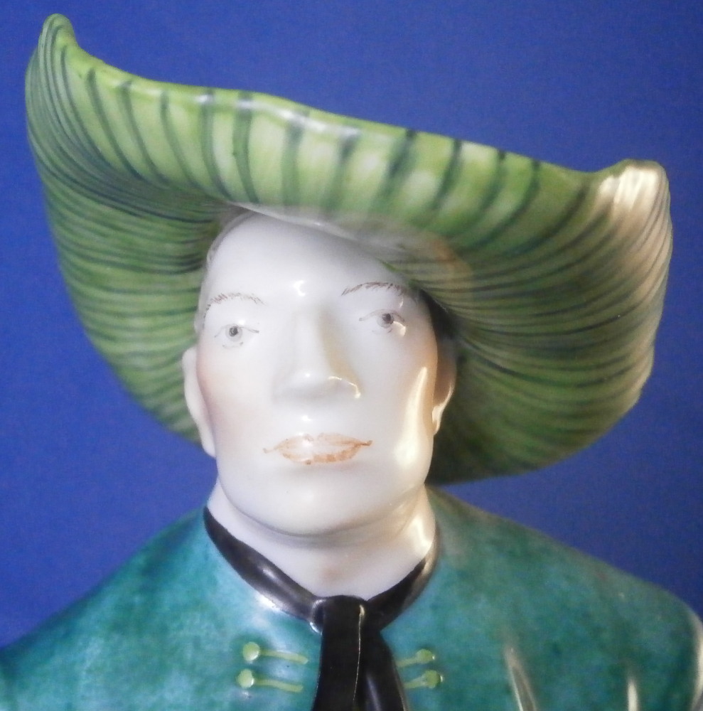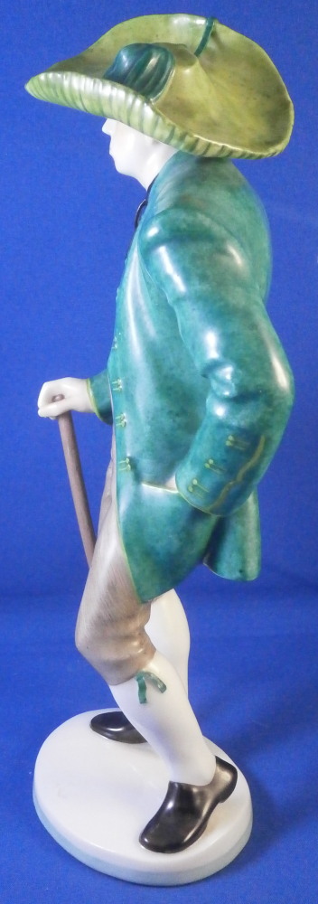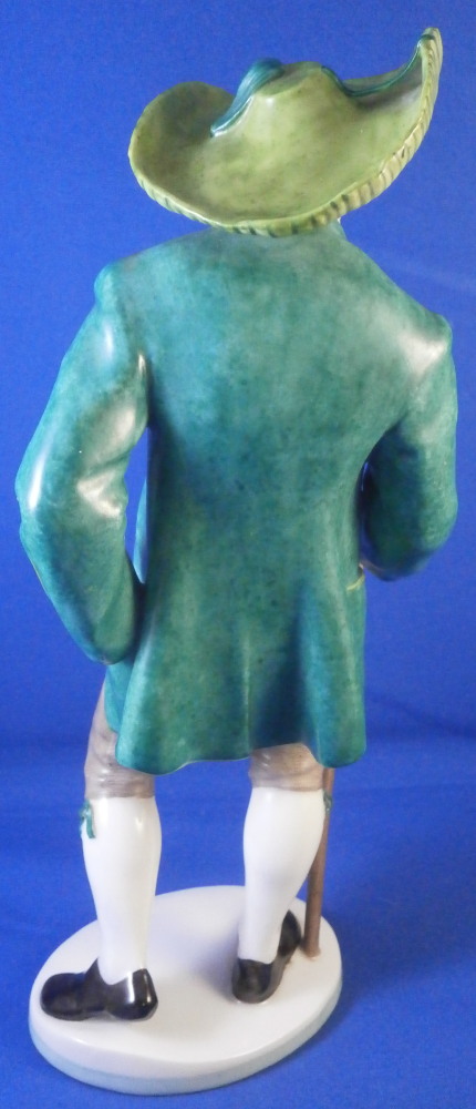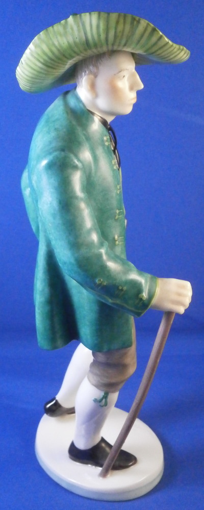 This is a figure of a Jauchenauer gentleman made by Nymphenburg in the early 20th century. From a series of people wearing tradional costumes from the Bavaria area. Originally modeled by model of Resl Schröder-Lechner around 1940 this figurine is from this period. The gentleman is nicely dressed in a traditional outfit from Jachenau a city between Munich and Inssbruck. The outfit includes a nice green jacket, a red shirt peeking out from under it, grey semi length pants, a cane and a funky large hat. When it comes to traditional outfits this one really is pretty tame :) The figure is standing on a simple base with a light green trim to the bottom edge. The figure is 8.25 inches tall, 3.375 inches wide and 2.375 inches deep. Marked with the impressed shield mark to the front edge of the base as well as on the underside, the impressed numbers 830 which is the model number over 0 and the green shield mark with the word Nymphenburg underneath. The figurine is in perfect condition which is always a plus. Please email me for more information or other pictures.