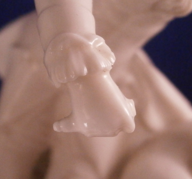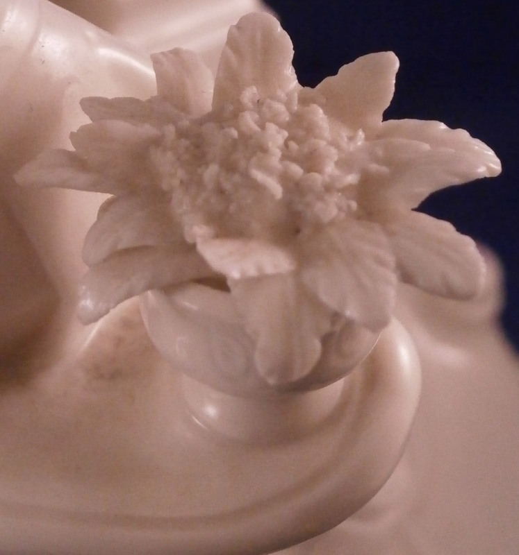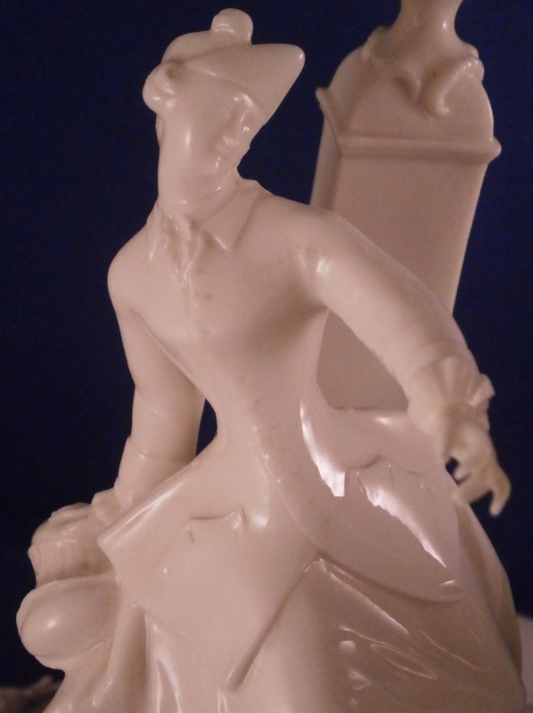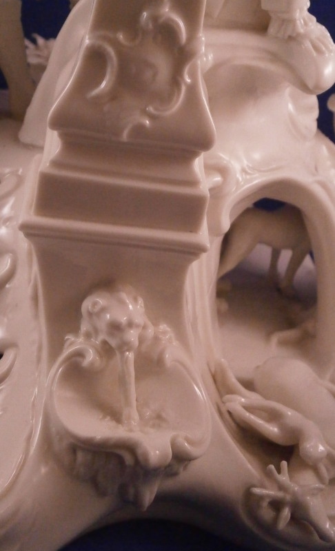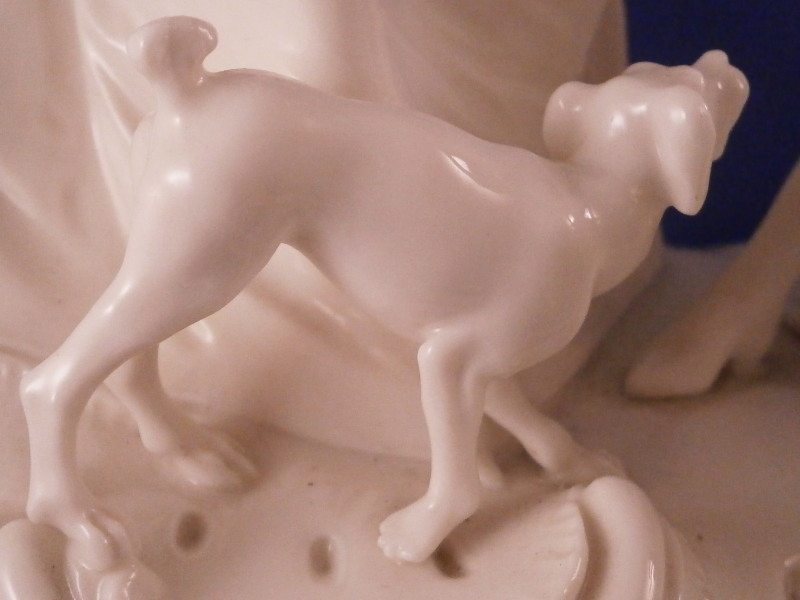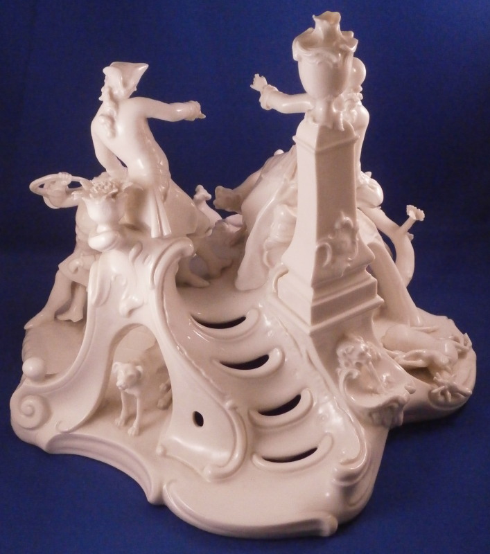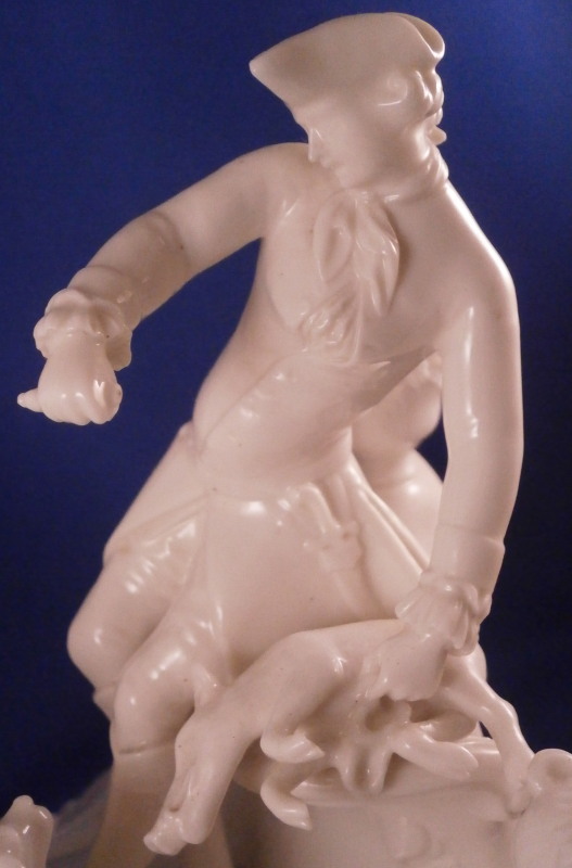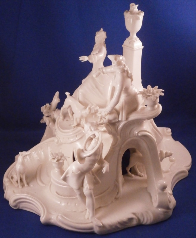 This is the rare center piece to the "Nymphenburger Jagd" group of figurines made by Nymphenburg in the early 20th century after 18th century originals. There are quite a few figures to this hunting group but the center piece one never sees so I was excited to find it! I already own the painted version but now managed to find it in white as well. The large figure has a lot going on that it is hard to describe it all but it includes a lady sitting in front of a column with a vase on top, a gentleman gutting a wild boar as well as a gentleman blowing the hunting horn as well as four dogs in different spots. The base is superbly modeled including tunnels as well as a fountain, a piece of a tree and some greenery in pots. There is lots of scroll work and even a dead dear and rabbit lying on the ground. Just an amazing amount of detail to this piece! The piece is marked with the impressed shield mark on the column over the fountain as well as on the underside with an incised number 90. as shown. The figurine is about 8.875 inches tall, 10 inches wide and 10.75 inches deep. It is amazingly in almost perfect condition with just the tip of the knife of the hunter gutting the boar missing and one leaf on a plant is chipped. It displays perfectly and is just amazing! Please email me for more information or other pictures.