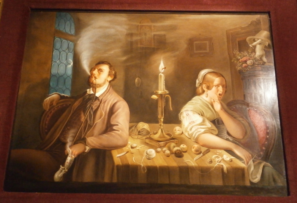 This is another one of those very special once in a lifetime kind of piece. It is a plaque made by Nymphenburg around 1850. After researching it for a while I found the original oil painting to it, titled "The sulking couple" (Das schmollende Ehepaar) by Johann Peter Hasenclever of Germany. It was painted by him in 1839 and was then part of the royal collection of King Ludwig 1st of Bavaria (grandfather of the Ludwig that build Neuschwanstein aka the Disney castle inspiration). This later became part of the Neue Pinakothek, a museum in Munich, Germany but has since been sold. The King initiated the copies of the original oil paintings onto Nymphenburg porcelain and from 1835 the paintings were copied onto plaques. So this is very likely one of those plaques from the royal collection. There were some other ones made for rich clients but usually from paintings outside the collection. Any plaque by Nymphenburg is very rare but one of this size and quality is almost never seen outside of museums. The quality is so fine I had to look with a magnifying glass to see the brush strokes. So many fine details! The painting is of a gentleman smoking a pipe typical of this period while the lady is sitting at the other end of the table quite obviously mad at him. My daughters were discussing it and since she looks madder, it is the gentleman guilty of something (which is pretty much always the case). I figured he was out too late with his buddies :) The plaque is in great condition - the area you see is perfect. on the back side you see that the plaque was cut a bit before being painted. One each side and there is some chipping with that but it was made that way so is not considered real damage. The piece is framed with a matt of some sort of velvet like material in a burgundy type color with a fancy gold frame that is stunning. The frame has some minor corner issues but displays perfectly and looks amazing on the wall. What a piece! As special as it comes! Very heavy though so I am not super comfortable hanging it on the wall though it obviously has done so in the past. For now it will reside in my office :) The back of the piece is marked with some numbers as well as the impressed shield mark with a star above it. Used from 1850 until 1862 according to some books, in others a bit longer. The scene has an artist signature as shown though I cannot make it out. I read it as Steiner my dad as Sturm. No idea. The visible part of the plaque is 16.25 inches wide and 12.5 inches tall and about 0.375 inches thick. The piece with the frame is about 2.5 inches deep, 26.625 inches wide and 21.75 inches tall. A truly superb piece! Please e-mail me for more information or photos.