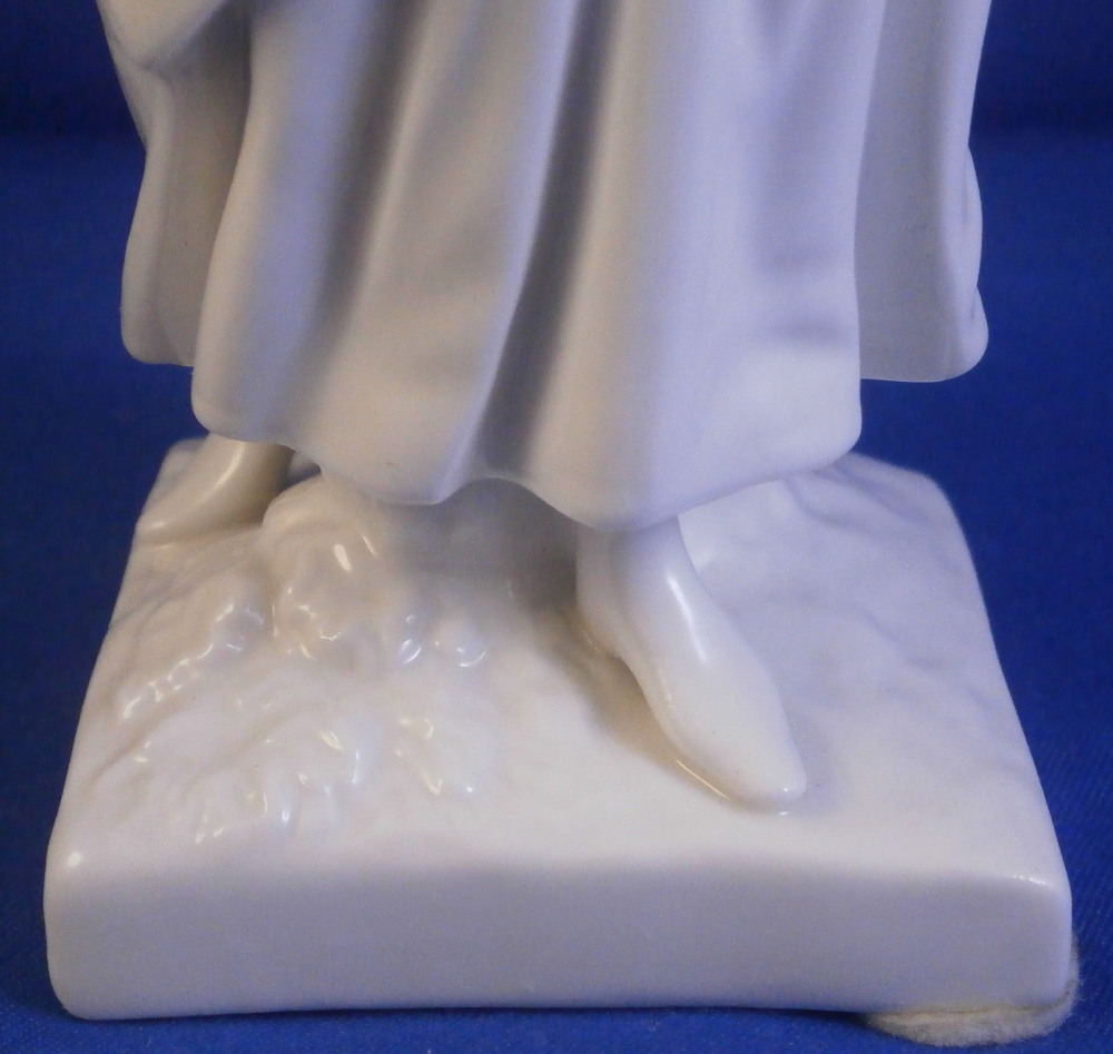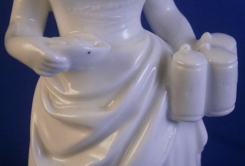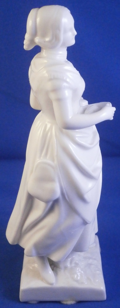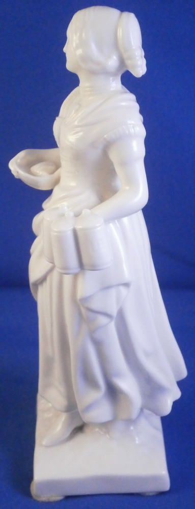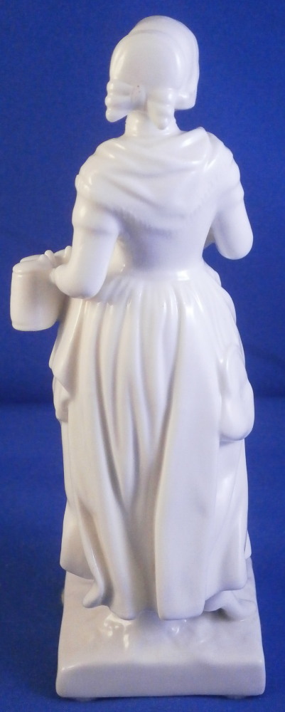This is a nice and fairly hard to find figurine of a Munich waitress first modeled by Neureuther around 1850. This here is the glazed version and sates to the late 19th or early 20th century. The figure is nicely modeled with good detail. It is of a lady holding three beer tankards in her left hand and a bowl with a roated ham hock in her right hand. She is wearing a traditional outfit and has an interesting hairstyle with a funky head covering in the back. The figure is standing on a square base. The piece is in perfect condition with one small black firing spot on the front of the bowl in her hand. The figurine is marked underneath with their impressed shield mark as well as an incised number 211 (I think) as shown. The piece is 5.625 inches tall, 2 inches wide and 2 inches deep. Please email me for more information or other pictures.