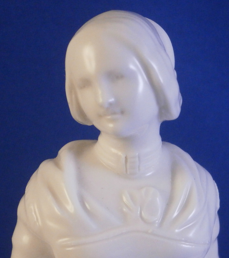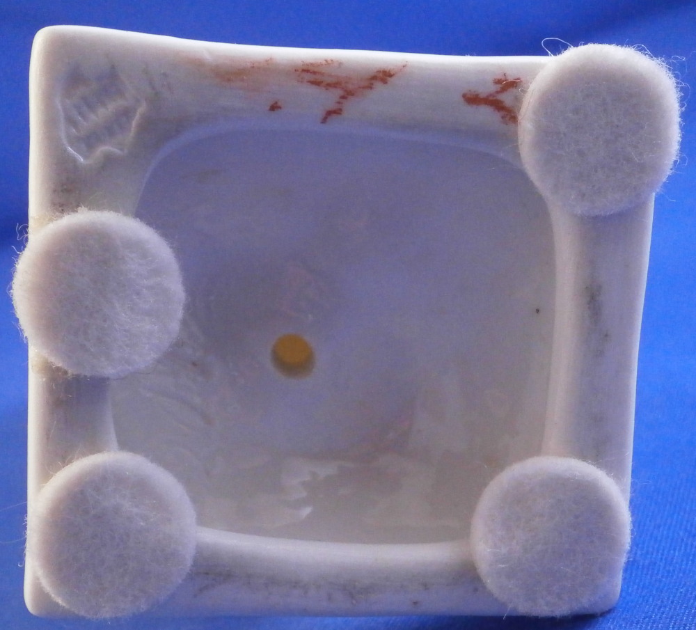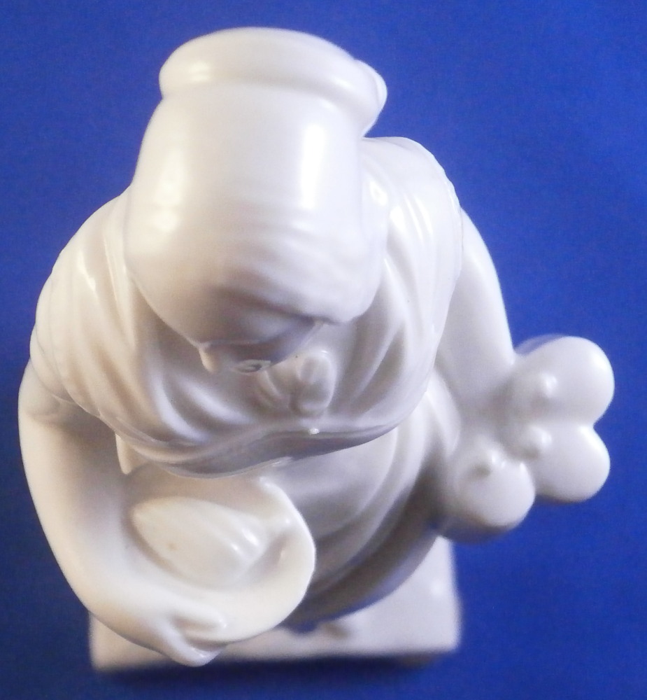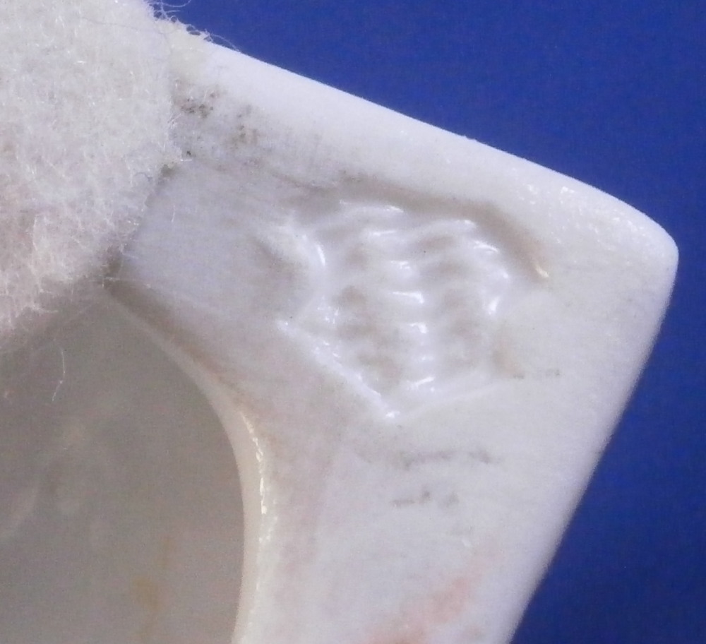This is a nice and fairly hard to find figurine of a Munich waitress first modeled by Neureuther around 1850. This here is the glazed version and sates to the late 19th or early 20th century. The figure is nicely modeled with good detail. It is of a lady holding three beer tankards in her left hand and a bowl with a roated ham hock in her right hand. She is wearing a traditional outfit and has an interesting hairstyle with a funky head covering in the back. The figure is standing on a square base. The piece is in perfect condition with one small black firing spot on the front of the bowl in her hand. The figurine is marked underneath with their impressed shield mark as well as an incised number 211 (I think) as shown. The piece is 5.625 inches tall, 2 inches wide and 2 inches deep. Please email me for more information or other pictures.