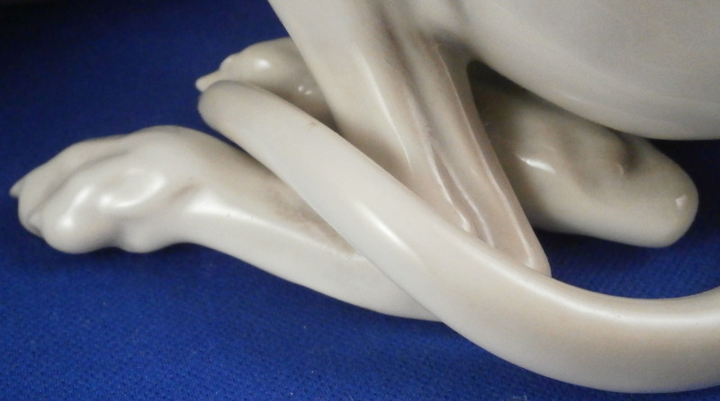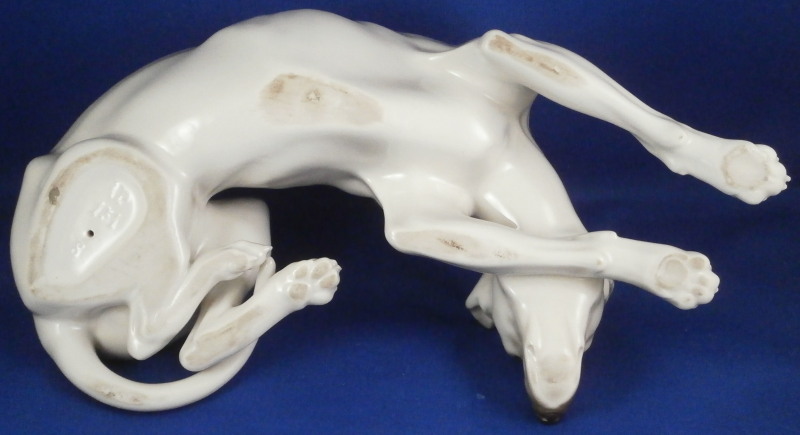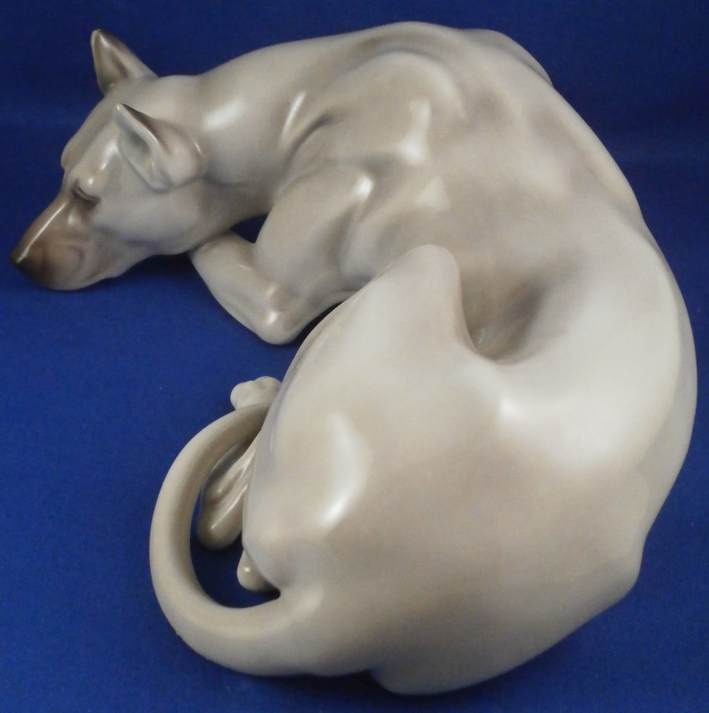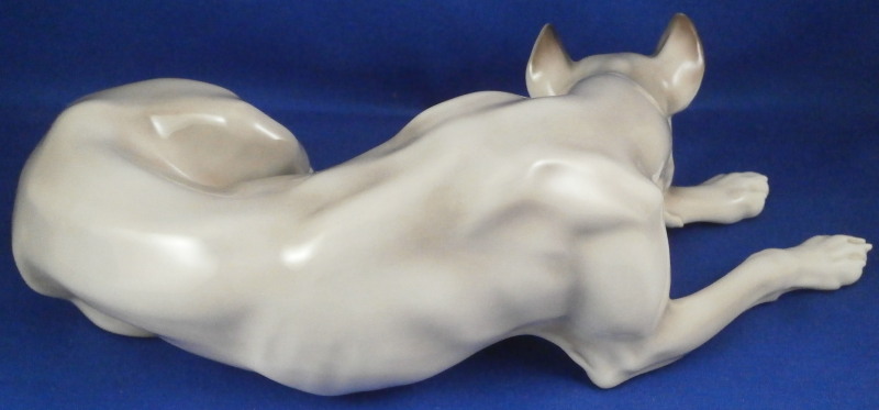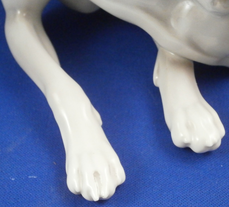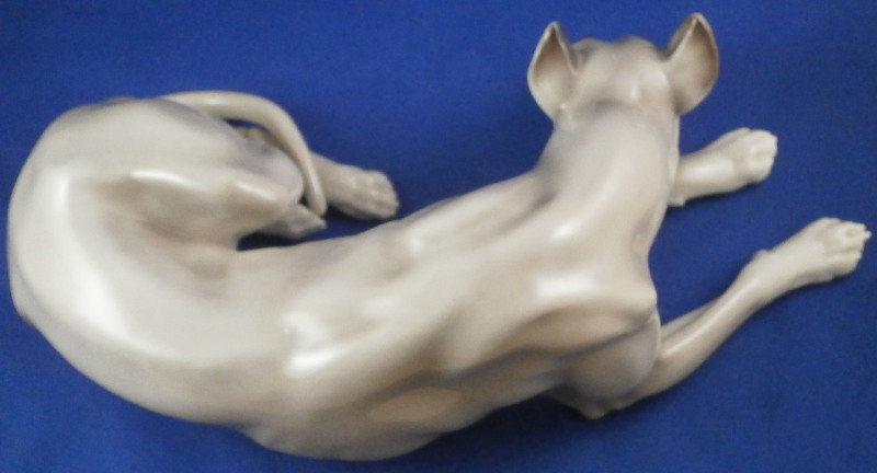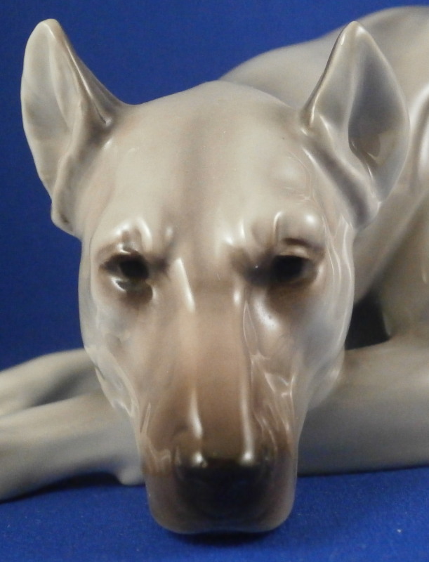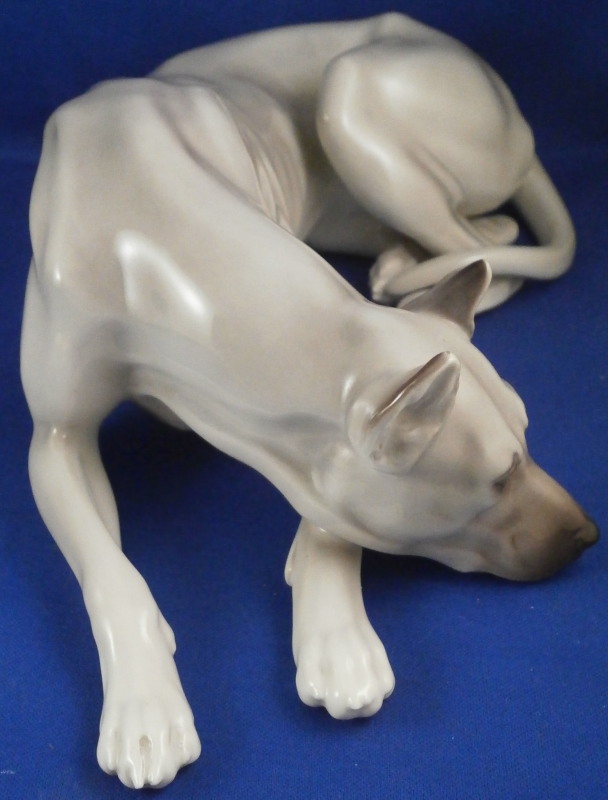 This is a figure of a dog made by Nymphenburg in the early 20th century. It is of a Great Dane lying down for his all day nap :) He is superbly modeled and painted to perfection. This one is grey in color. Nymphenburg dog figurines are the most impressive dog figurines one can own! The figurine is 3.125 inches tall, 4.75 inches deep and about 9.5 inches long. Marked with the impressed shield mark underneath with the number 151 over 8 underneath it. The piece is in perfect condition! Please email me for more information or other pictures.