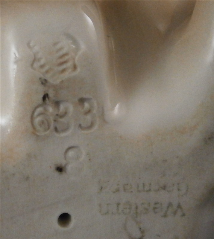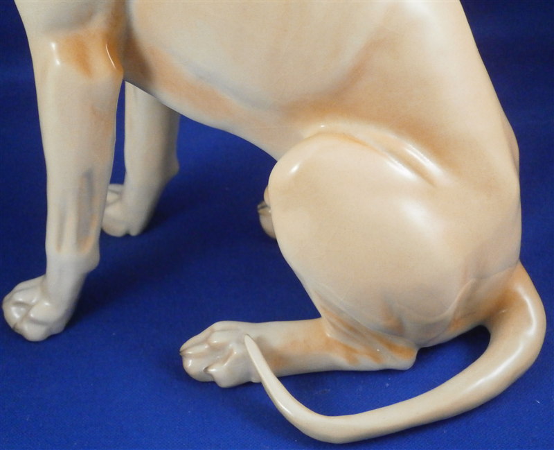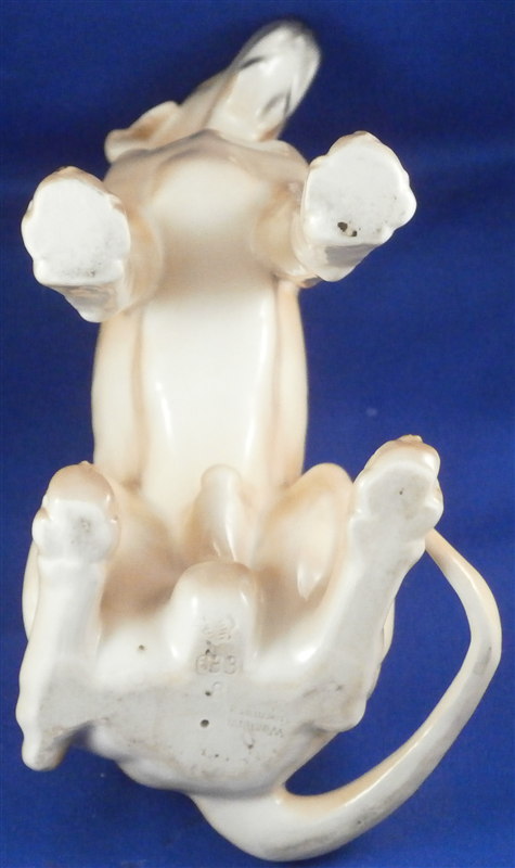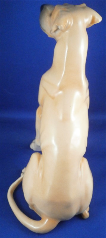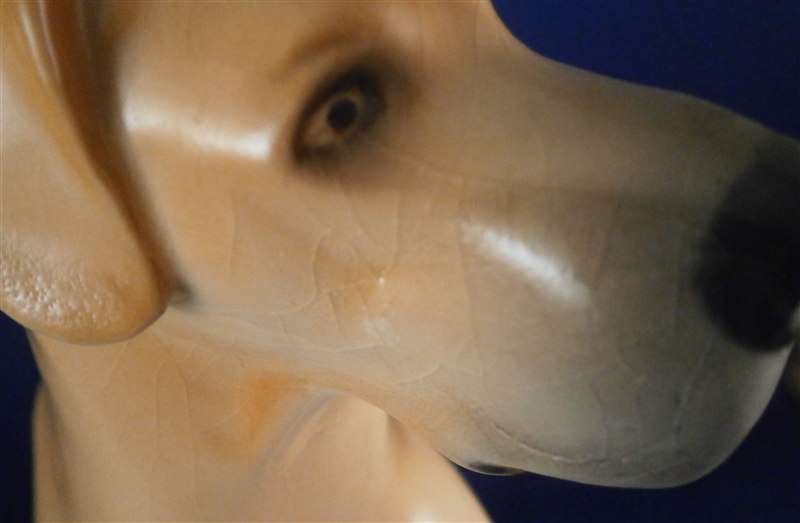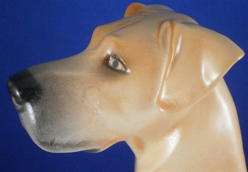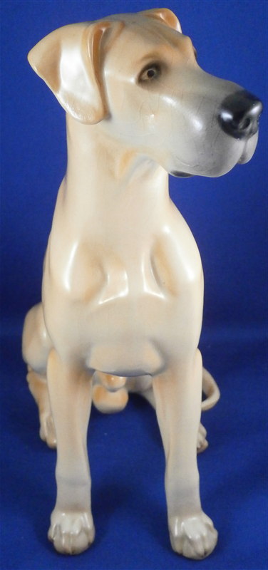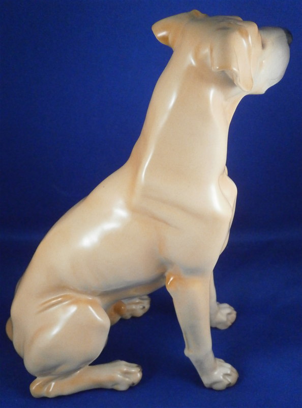 This is a figure of a dog made by Nymphenburg in the mid 20th century. It is a Great Dane and he is superbly modeled and painted to perfection. One of the most impressive dog figurines I own. The dog is 8.5 inches tall, 3.875 inches wide and about 6 inches long. Marked with the impressed shield mark underneath with the number 633 over 8 underneath it. Also marked with the Western Germany in greeen so he dates to just after WWII. The figurine displays perfectly but it has the usual glaze flaws and glaze crazing - not sure why this model always has glaze crazing while most others don't. Please email me for more information or other pictures.