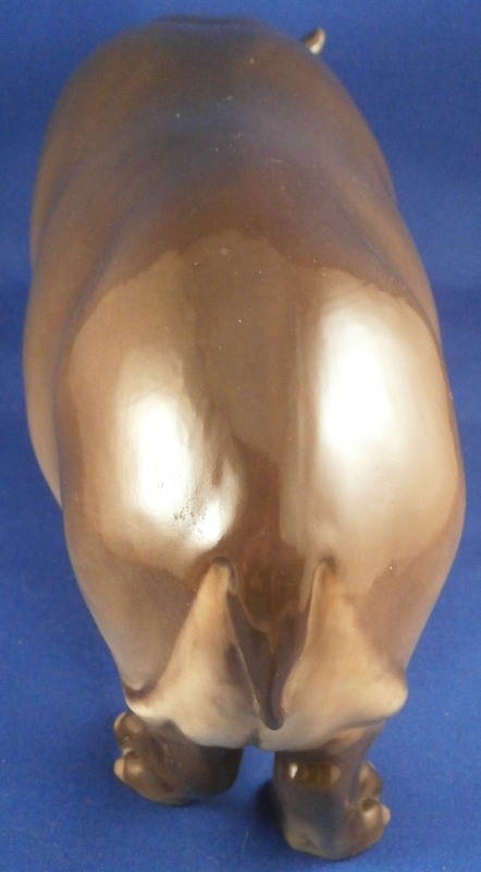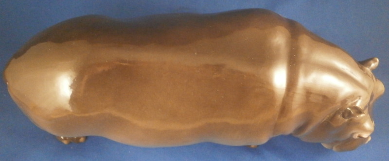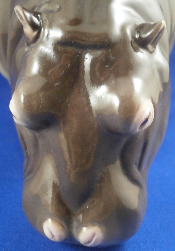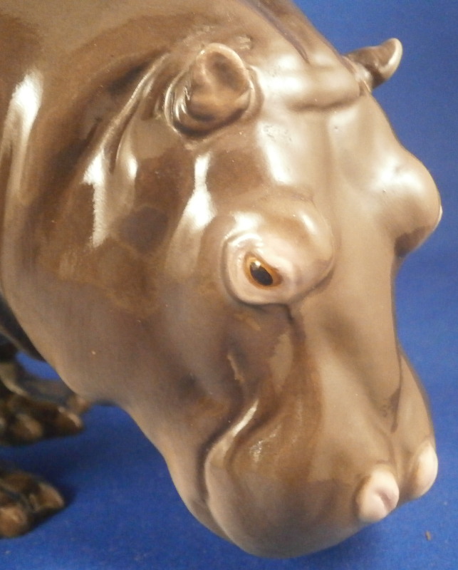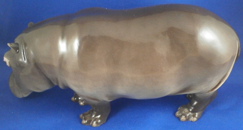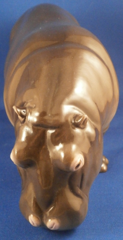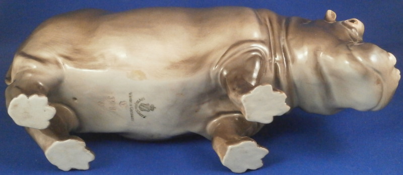 This is a superb and quite hard to find figurine of a hippopotamus made by Nymphenburg in the mid 20th century right after WWII. It was designed by Emil Manz in the early 20th century. The hippo was superbly modeled and painted to perfection. A very typical pose for these charming yet dangerous creatures with her head down looking calmly for some grasses to eat. The piece is 4.5 inches tall, about 3.25 inches wide and 9.5 inches long. The figure is marked with the impressed shield mark underneath with the model number 399 over 4 as well as the green shield mark with the name Nymphenburg and Western Germany underneath it. The hippo figure is in perfect condition. An amazing piece! Please email me for more information or other pictures.