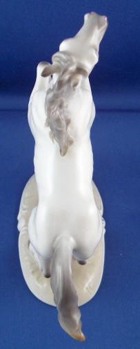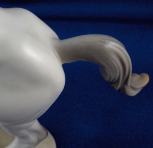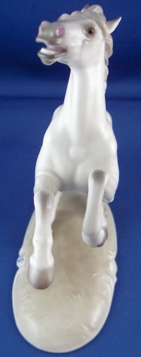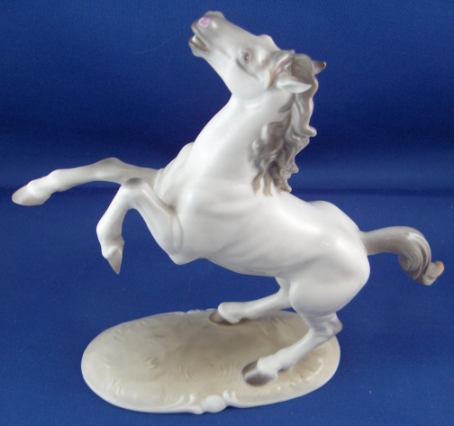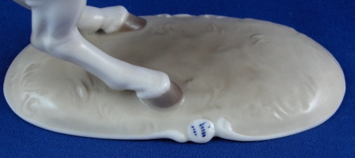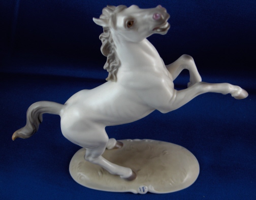 This is a horse made by Nymphenburg after 1950. It is entirely handpainted with great colors. It almost looks real. The horse is 6.5 inches tall, 2.375 inches wide and 7 inches deep. Marked with the impressed shield mark, the numbers 800 over 8, the letter a, as well as the green shield mark under a crown over the word Nymphenburg and Western Germany. It is in perfect condition. Please email me for more information or other pictures.