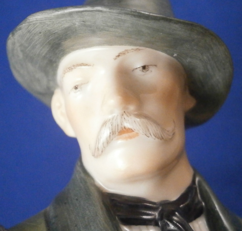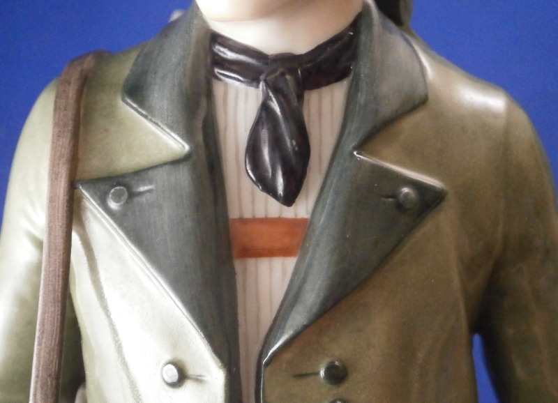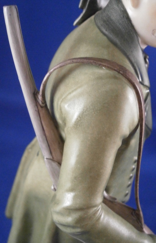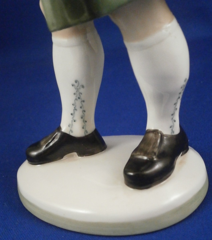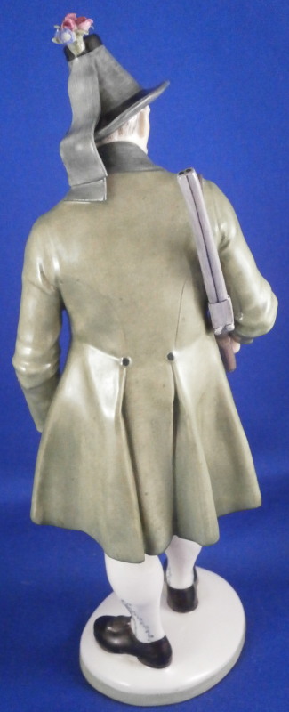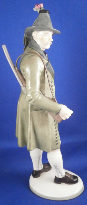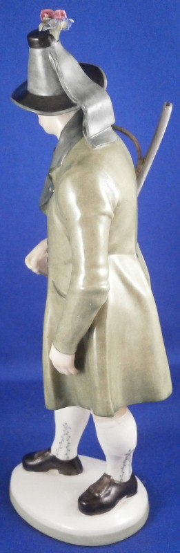 This is a figure of a hunter by Nymphenburg in the early 20th century. The hunter is wearing a traditional Southern Germany / Bavarian / Tyrolean outfit including a nice hat with a flower arrangement to the top, lederhosen, long socks and a long green coat with his rifle over his shoulder. He is really looking sharp and ready to go for a wild boar or such. The figure is 9.25 inches tall, 3.5 inches wide and 3.25 inches deep. Marked with the impressed shield mark, the impressed numbers 832 over 0 and the green shield mark with the word Nymphenburg underneath. Looks to be from the original period and much nicer than most one sees plus in perfect condition which is not easy to find at all. Please email me for more information or other pictures.