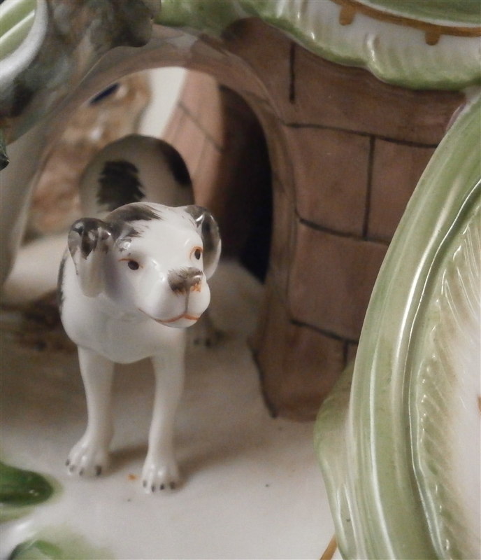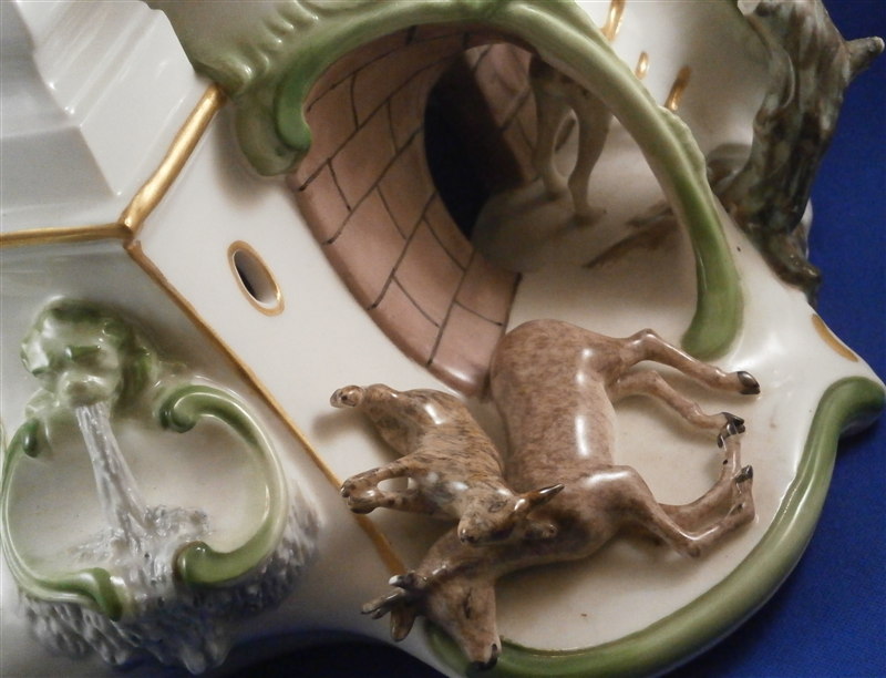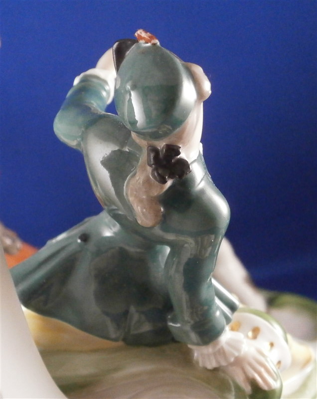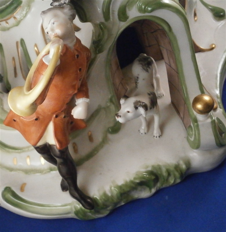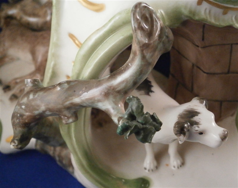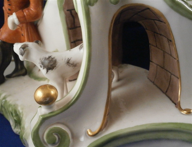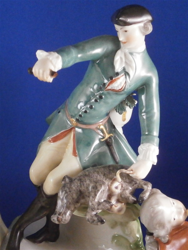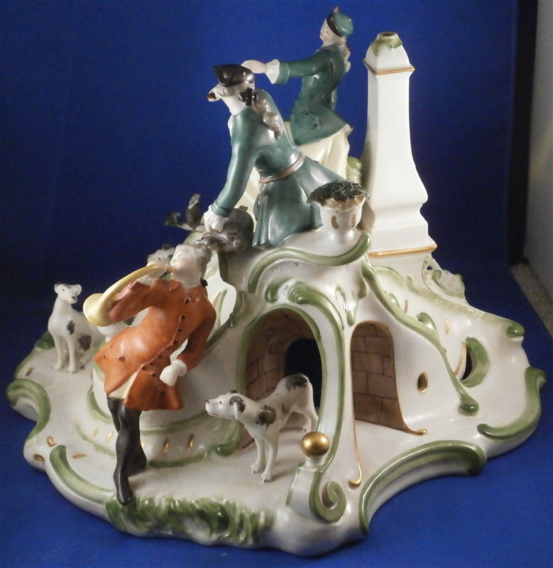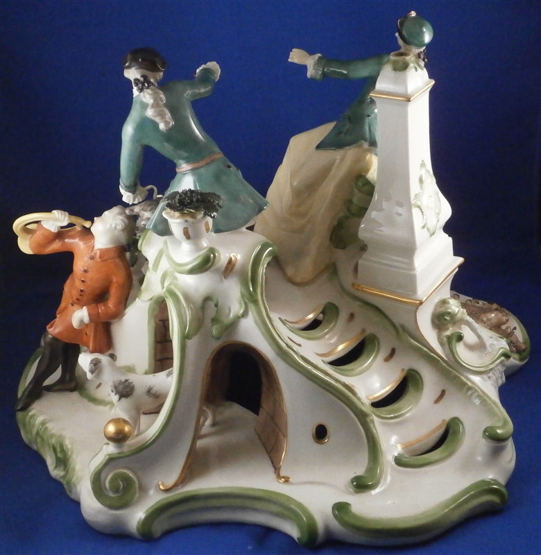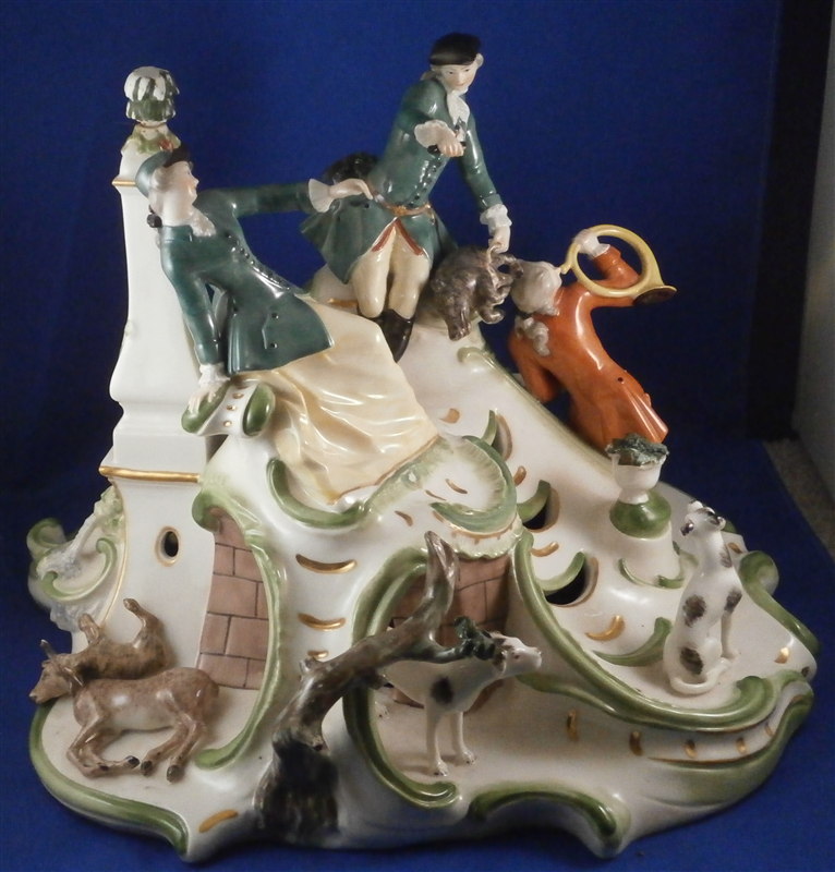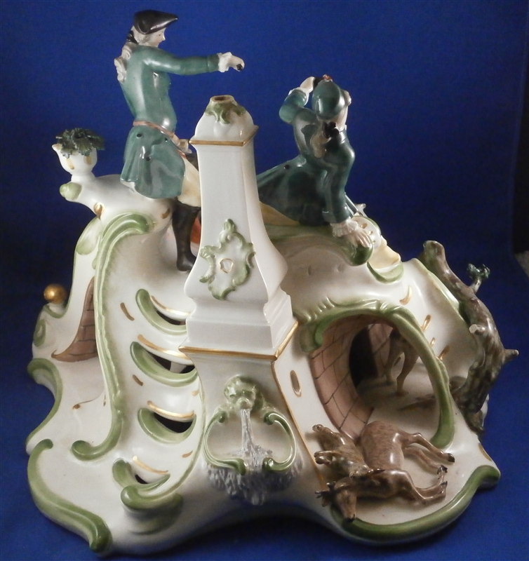 This is the rare center piece to the "Nymphenburger Jagd" group of figurines made by Nymphenburg in the early 20th century. There are quite a few figures to this hunting group but the center piece one never sees so I was excited to find it! The large figure includes a lady sitting in front of a column, a gentleman gutting a wild boar and a gentleman in a red coat blowing the hunting horn as well as multiple dogs. The base is superbly modeled including tunnels as well as a fountain. There is lots of scroll work as well as some urns with plants in them and even a dead dear and rabbit lying on the ground. Just an amazing amount of detail to this piece! The piece is marked with the impressed shield mark as well as the number 90 over 1 as shown. The figurine is about 8.75 inches tall, 12 inches wide and 13 inches deep. It displays very nicely but the column on the back has some odd greenery on top that I am sure does not belong, the tree that comes out of the side has lost some small branches and its leaves some of which has been painted to hide perfectly, The knife the gentleman is holding has the blade mostly missing, one of the antler tips on the dead deer has a tiny chip, the greenery in the pots is damaged and has been over painted which could be done better and the scroll in front of the lady has been overpainted as has a small spot in the grass. Considering the size and age of the piece it is in remarkable shape and displays perfectly. Please email me for more information or other pictures.