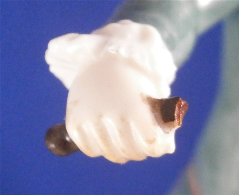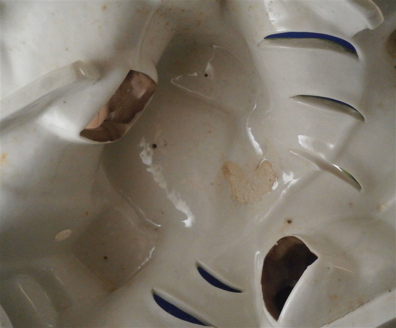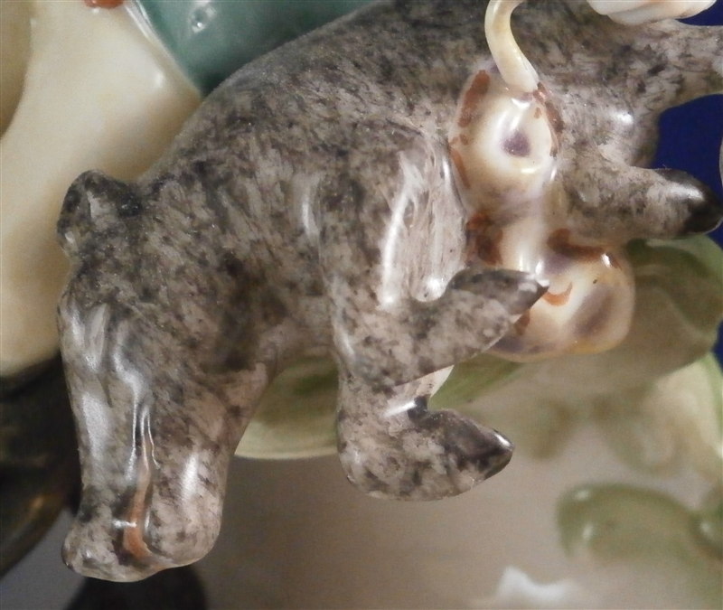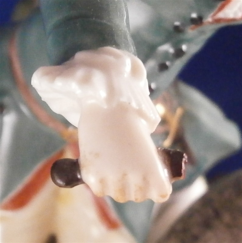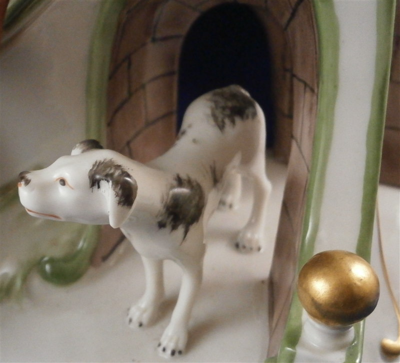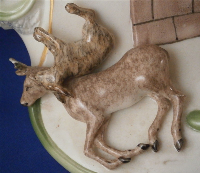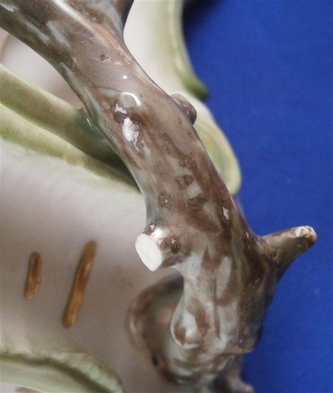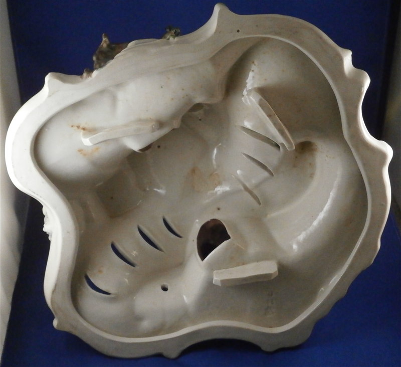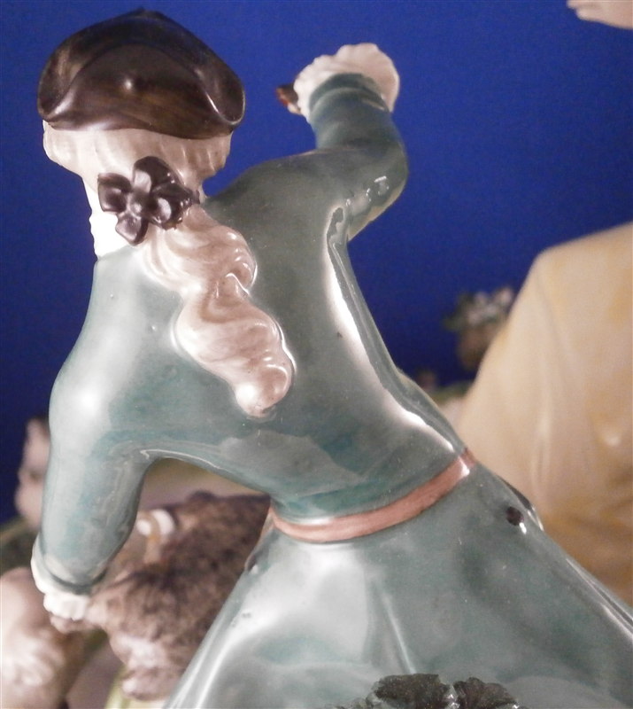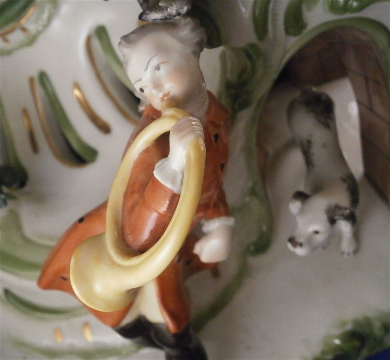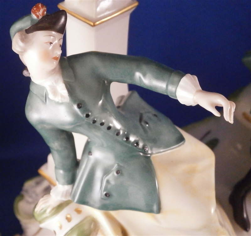 This is the rare center piece to the "Nymphenburger Jagd" group of figurines made by Nymphenburg in the early 20th century. There are quite a few figures to this hunting group but the center piece one never sees so I was excited to find it! The large figure includes a lady sitting in front of a column, a gentleman gutting a wild boar and a gentleman in a red coat blowing the hunting horn as well as multiple dogs. The base is superbly modeled including tunnels as well as a fountain. There is lots of scroll work as well as some urns with plants in them and even a dead dear and rabbit lying on the ground. Just an amazing amount of detail to this piece! The piece is marked with the impressed shield mark as well as the number 90 over 1 as shown. The figurine is about 8.75 inches tall, 12 inches wide and 13 inches deep. It displays very nicely but the column on the back has some odd greenery on top that I am sure does not belong, the tree that comes out of the side has lost some small branches and its leaves some of which has been painted to hide perfectly, The knife the gentleman is holding has the blade mostly missing, one of the antler tips on the dead deer has a tiny chip, the greenery in the pots is damaged and has been over painted which could be done better and the scroll in front of the lady has been overpainted as has a small spot in the grass. Considering the size and age of the piece it is in remarkable shape and displays perfectly. Please email me for more information or other pictures.