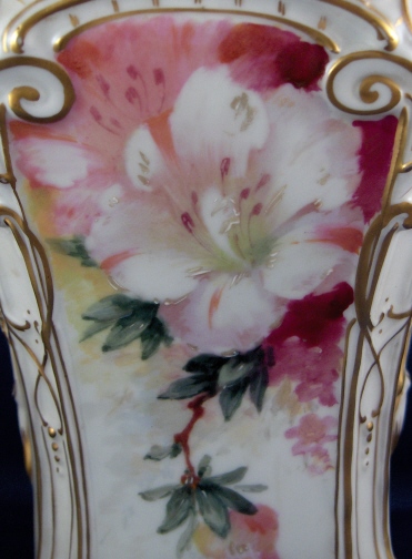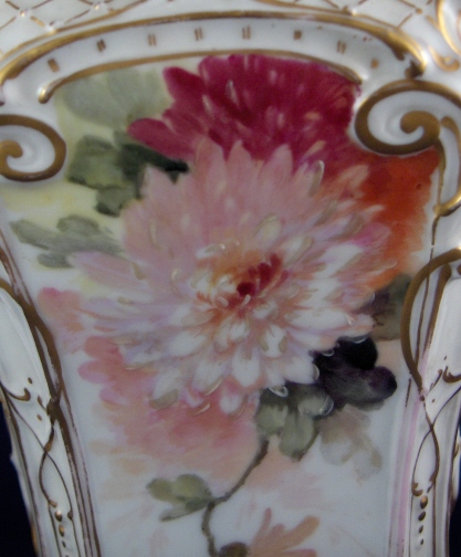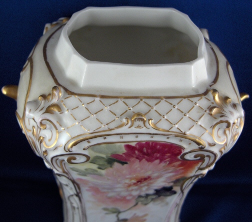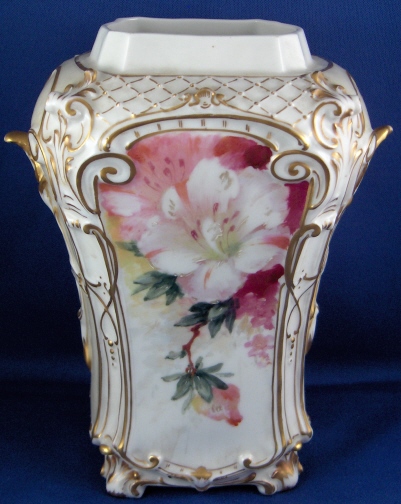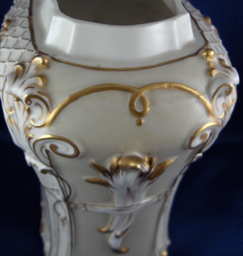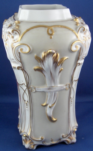 This is a fun vase made by Nymphenburg in the late 19th century. Very much in the Art Nouveau style of the period with lots of relief detail highlighted by gilding and two floral scenes - one on the front and one on the back. A really nice piece though the top rim makes me believe it might have had a lid - I am not sure on that at all though! The vase is 7 inches tall, 5.5 inches wide and 4 inches deep. It is in great condition with a little wear to the gilding. The piece is marked underneath with the underglaze blue shield mark under a crown as well as a red retailer's mark and incised numbers. Please email me for more information or other pictures.
