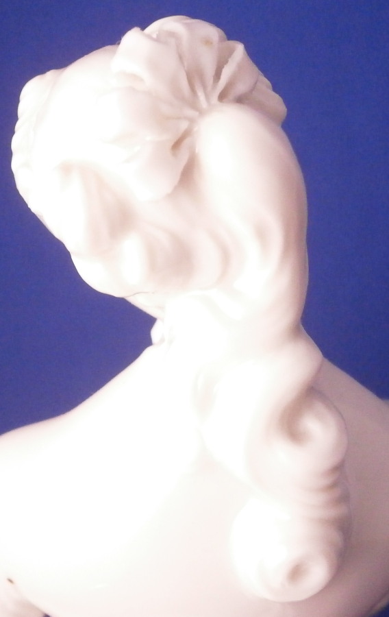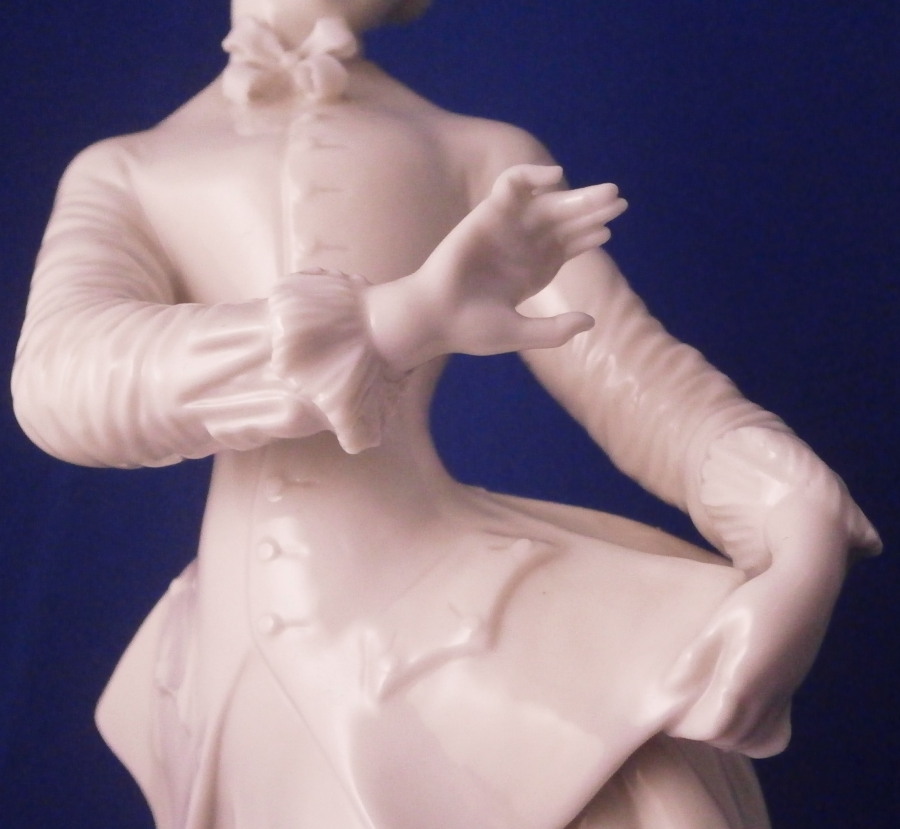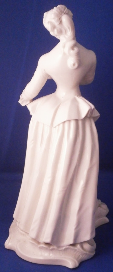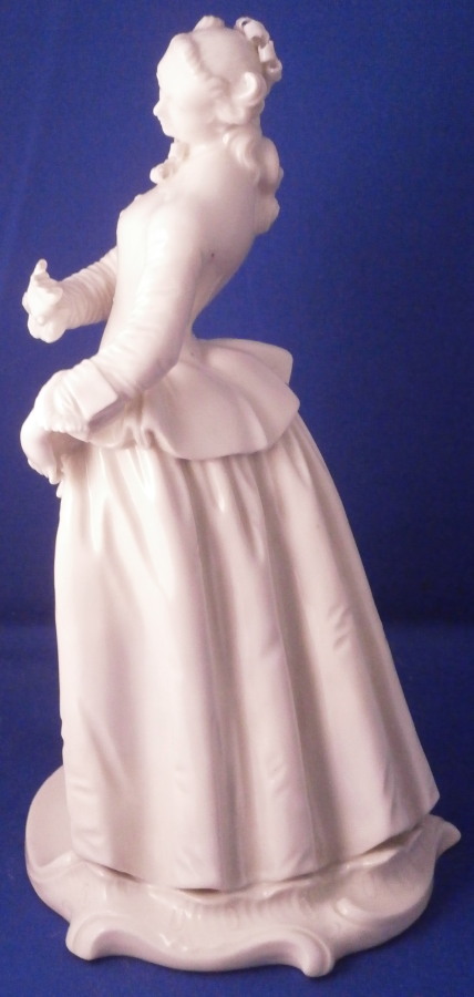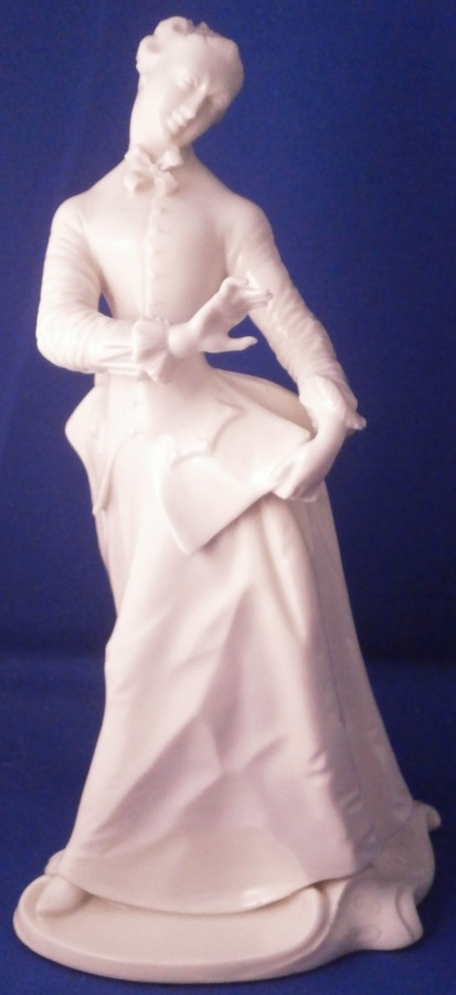 This is a figure of Julia made by Nymphenburg in the late 19th or very early 20th century right they were first remade after the original 18th century models. She is one of the commedia dell'arte figurines - one of the greatest set of figures ever designed by the famous Bustelli who made the best porcelain figurines ever! This figurine is quite hard to find - one of the hardest from this set! Superbly modeled with a nice pose and lots of detail left in the white to show it off perfectly! She is wearing nice skirt and top with a bow around her neck and in her hair. The delicate fingers are all intact as well! The figure has the impressed shield mark underneath and the impressed number 11 over 0. Another impressed shield mark to the top side of the base. She is in perfect condition - amazing after all this time and theose amazing details. The figurine is 8.125 inches tall, 3.875 inches wide and 4.5 inches deep. Please email me for more information or other pictures.