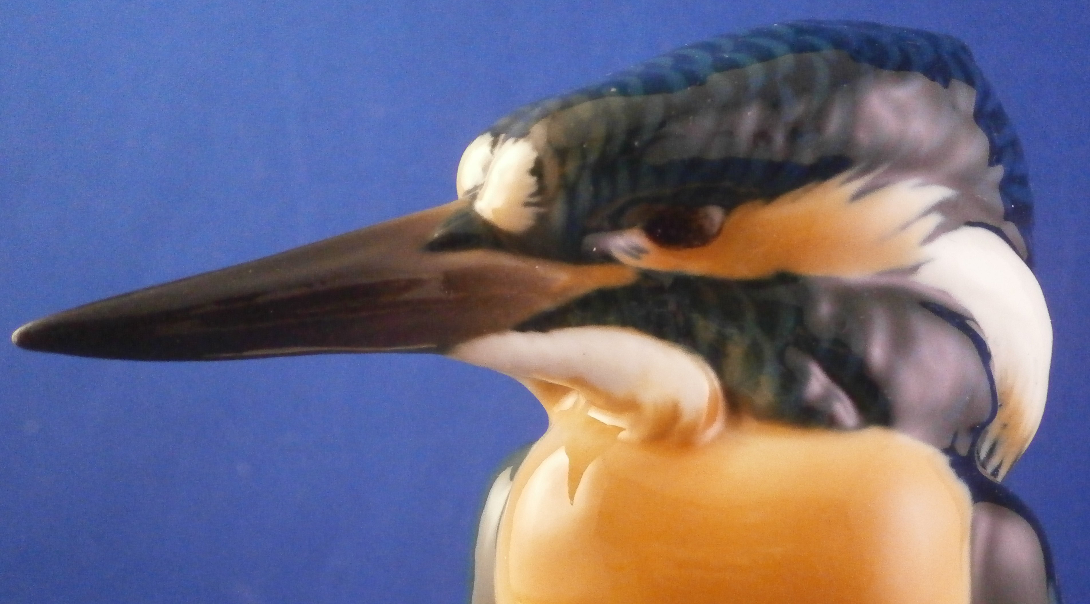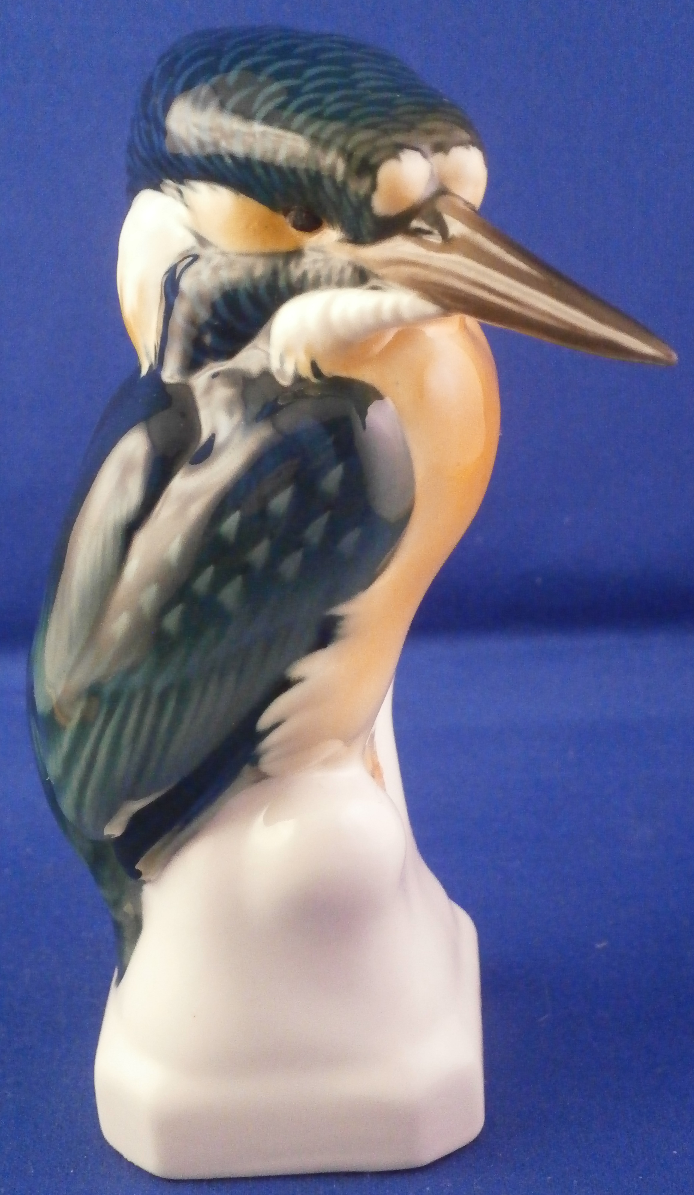 This is a really superb figurine of a Kingfisher bird made by Nymphenburg in the mid 20th century. One of my favorite birds anyway and this model by Nymphenburg is the best there is in porcelain! The modeling detaila nd colors are amazing. The bird is sitting on a white base - not sure what it is supposed to be. Some sort of ice probably and it makes the colors of the bird itself pop even more! The figure is 5.375 inches tall, 2.75 inches wide and 2.875 inches deep. The figure is marked with the impressed shield mark to the front that was colored blue as well as underneath with the model number 187 (?) and the number 9 impressed. Also the green shield markw ith the name Nymphenburg under it and Western Germany under that. The figure is in perfect condition. Please email me for more information or other pictures.