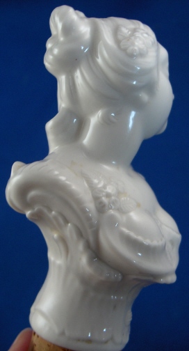 This is a rare figural bottle stopper made by Nymphenburg around 1900. Originally designed by Bustelli which can be seen easily. It is in the shape of a bust of a lady. The porcelain part is in excellent condition but the cork has seen better days which is no big deal since one could easily glue a new one on if need be. Marked underneath her bussom with the impressed shield mark. Probably more marks where the cork is but it is on there securely and I don't want to mess with it. The lady part is 3 inches tall, 1.75 inches wide and 1.5 inches deep. The cork part is an additional 1 inches long and it is 0.875 inches in diameter at the top. Please email me for more information or other pictures.