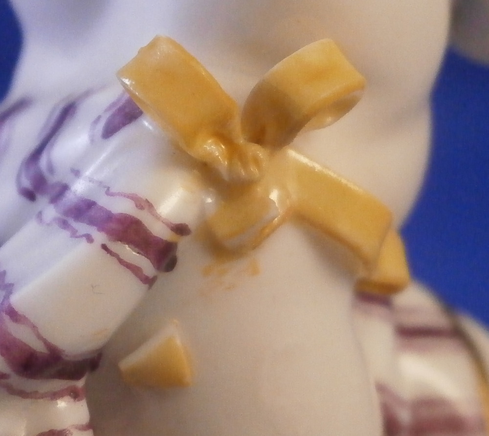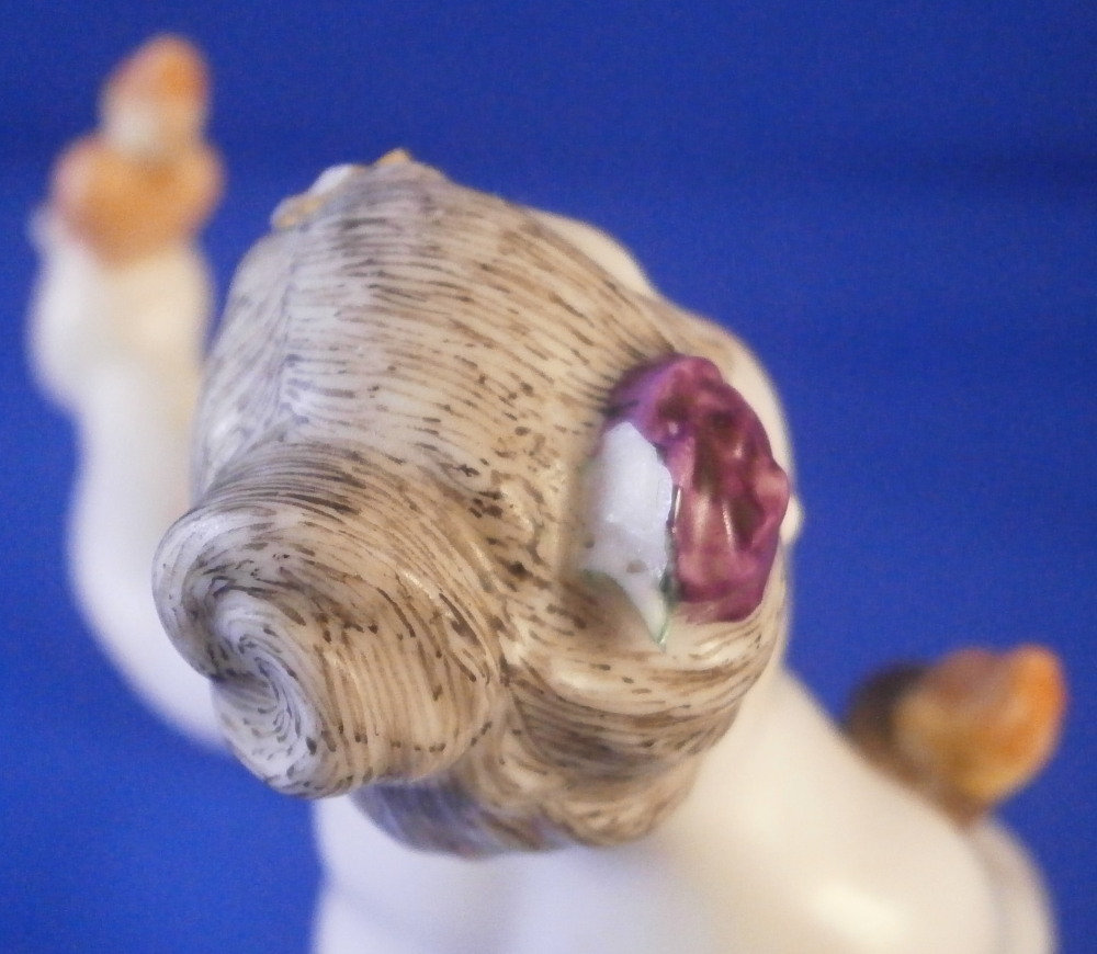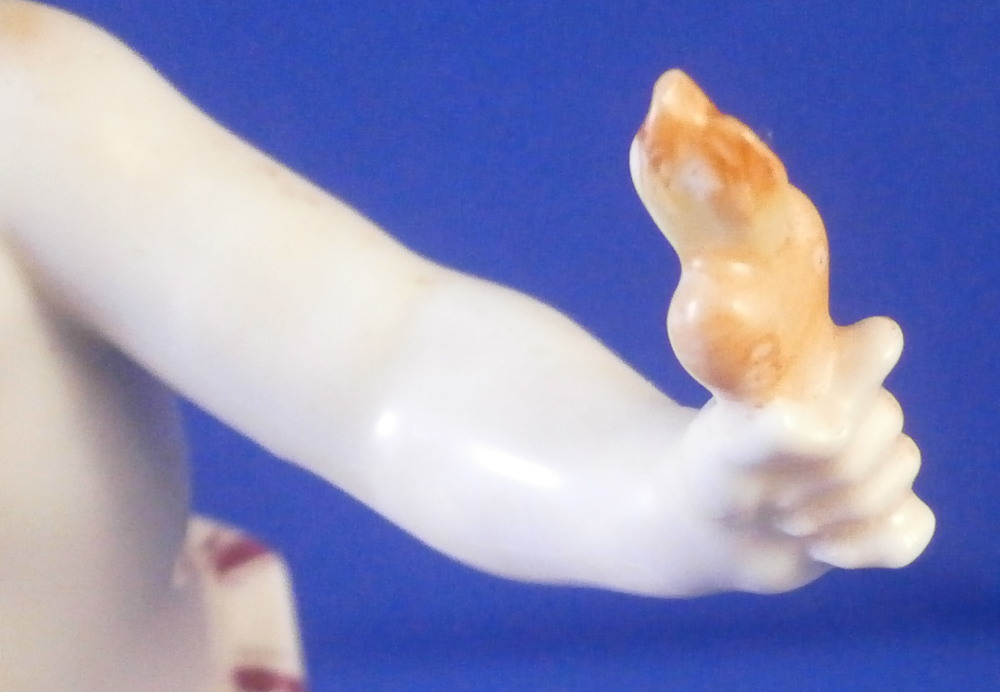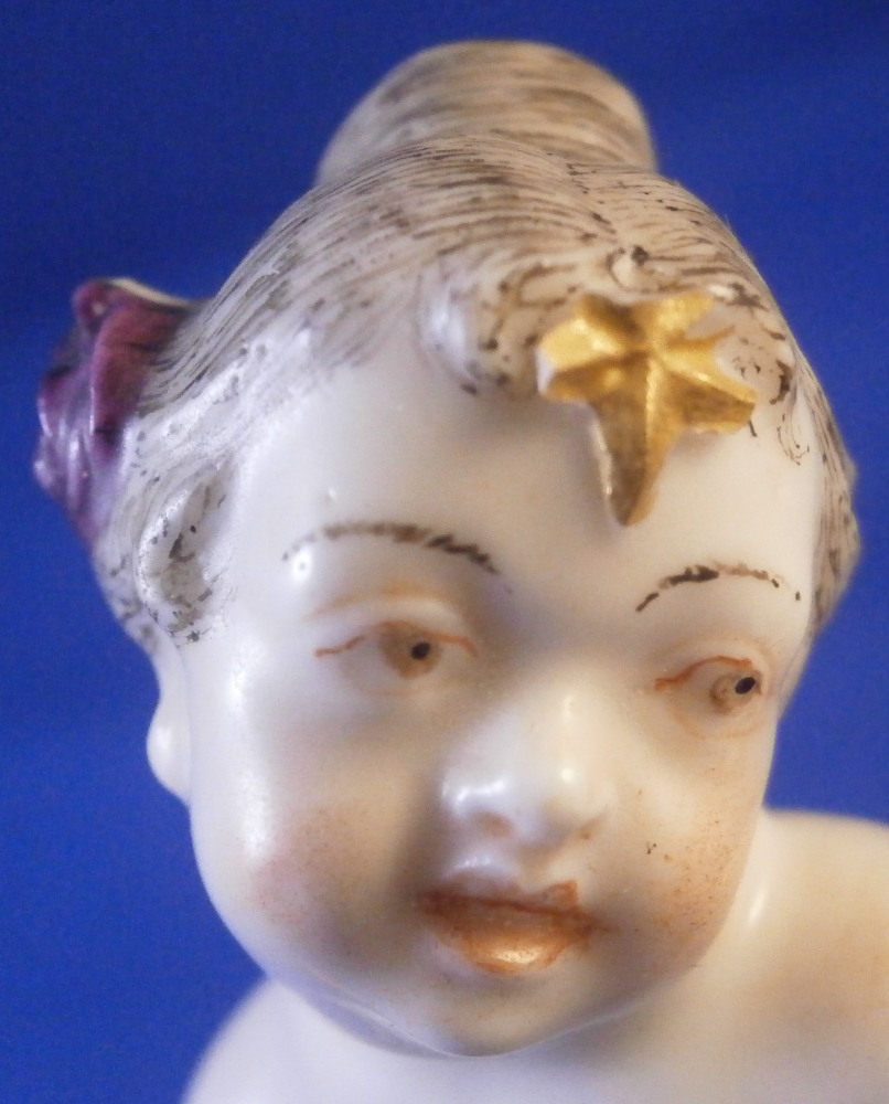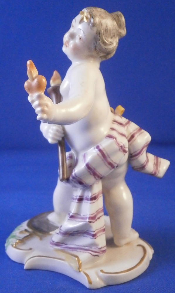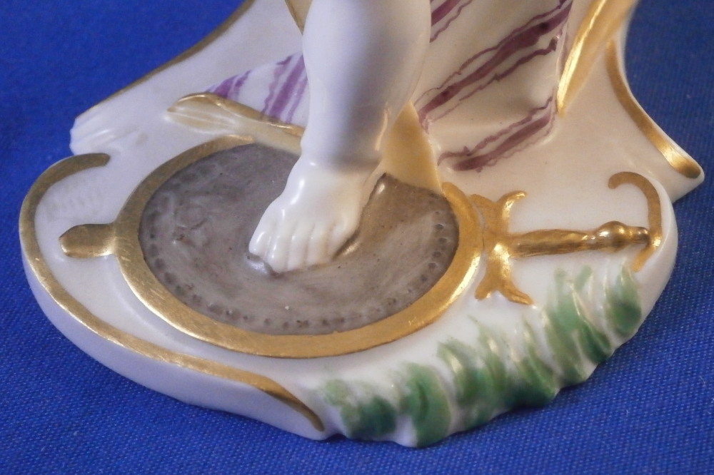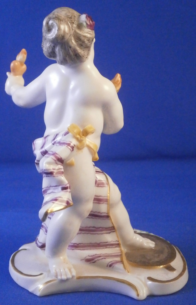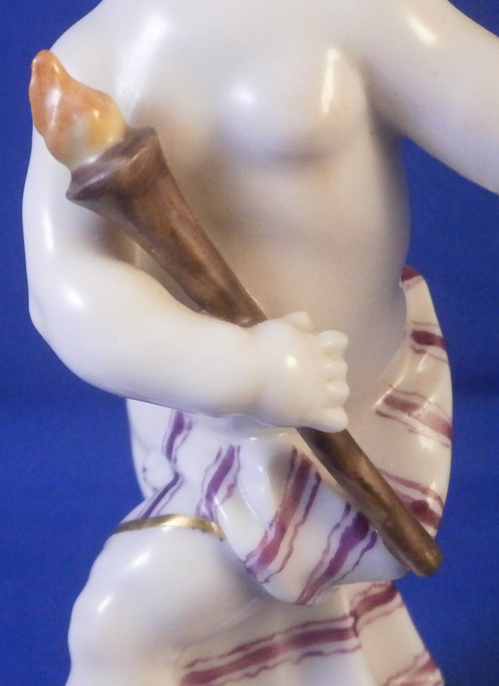 This is a hard to find polychrome version of this figurine of the goddess Venus made by Nymphenburg in the early 20th century. An easily identified goddess with a flaming heart in one hand and a torch in the other. Nicely modeled with lots of details - wearing a striped cloth covering her mid section. A shield and sword by her feet. Standing on a typical base. Hand painted to perfection. Originally modeled by the famous Bustelli and it is an incredible piece! The figurine is 4.125 inches tall, 2.875 inches wide and 2.5 inches deep. The figure displays nicely but has damage to it. The green leaves of the rose in her hair are gone and a part of the yellow bow that is holding the cloth in place is broken off as shown. The gold star in the front of her head is chipped as well. She displays perfectly since the damage is minor and not obvious at all when on display! The piece is marked underneath with the impressed numbers 491 over 0 and the shield mark as shown. There is also an impressed shield on top of the base by the shield as shown in the pictures. Please email me for more information or other pictures.
