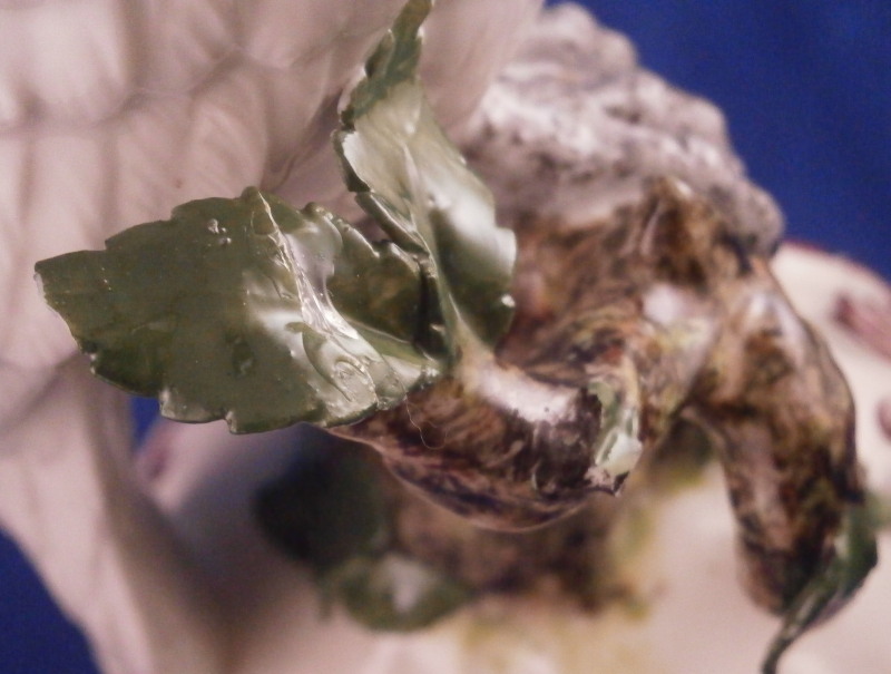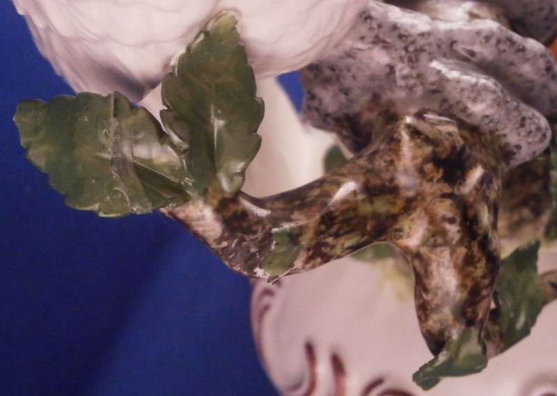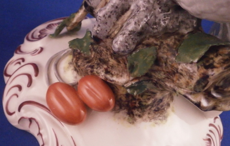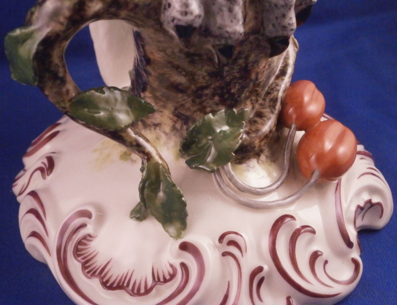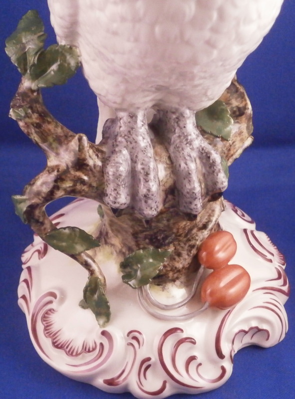 This is a really fun large figurine of a cockatoo made by Nymphenburg around the early to mid 20th century. The polychrome bird is perched on a cherry tree branch with some leaves and fruit as well all on a base with some scrolls all around highlighted in puce. This is the version with the yellow feathers which I prefer of the purple ones. I also have its mate on the site as well if anyone would like them as a pair. The figure is nicely modeled and hand painted to perfection. Lots of nice detail and large anough to look great on your mantle. One of those pieces that just make you happy when you look at it displayed in your house! The figurine is in great condition with damage to three leaves which are not obvious at all and it displays superbly! The piece is marked underneath with the impressed shield mark, the numbers 448 over 6 and the green shield mark under a crown with Nymphenburg underneath it as shown as. Also another impressed shield mark to the back of the base in the scrolls. The piece is 13 inches tall, 5.25 inches wide and about 5.5 inches deep. Please email me for more information or other pictures.