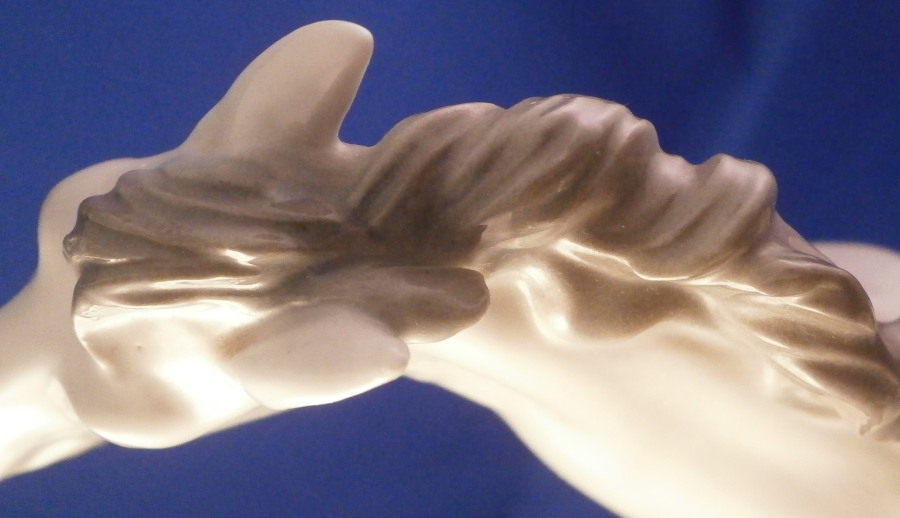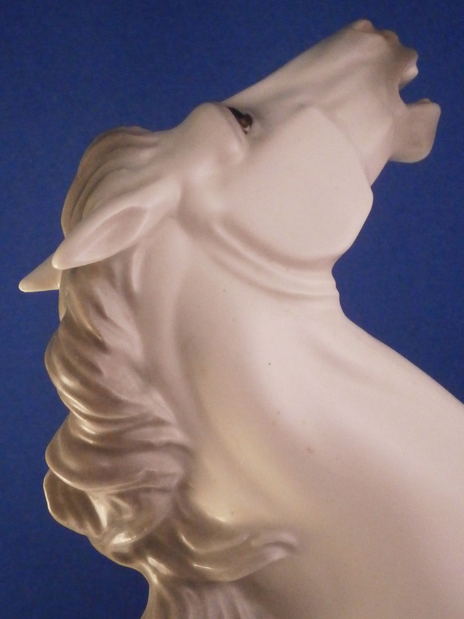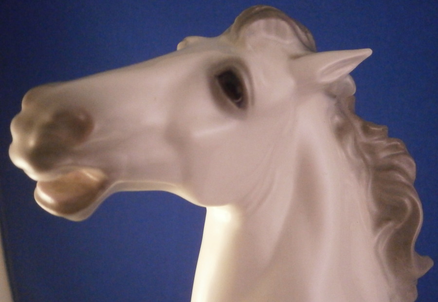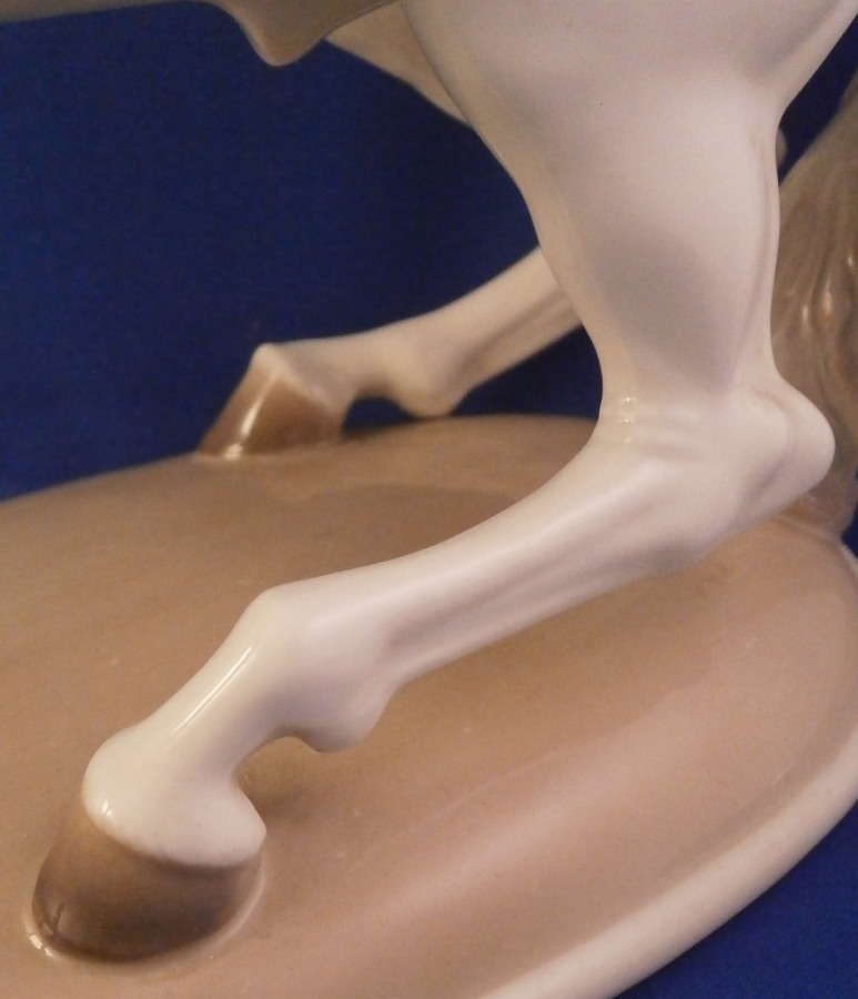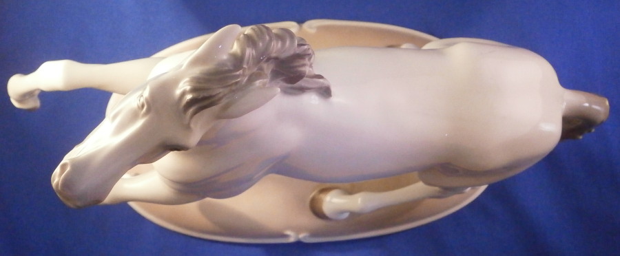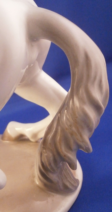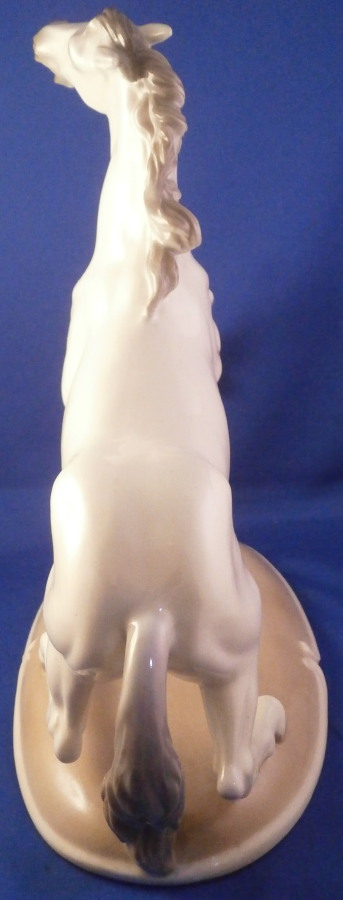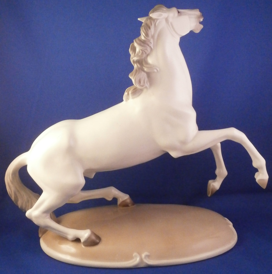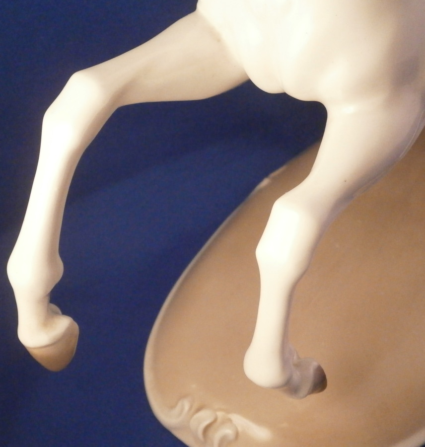This is a nice figurine of a rearing stallion made by Nymphenburg in the mid 20th century. Deisgned by Goebl in 1935 this figure here dates from around this time. It is superbly modeled and hand painted and one of the harder to find horse models they made. I really think that Nymphenburg animals figures are the best there are in the porcelain world. Stunning the way it stands on just the hind legs with the tail supporting it on the large oval base. The figure is 10.5 inches tall, 5 inches wide and about 11.5 inches long so a nice size. It is marked with the impressed and green shield mark with the name Nymphenburg under it as well as the model number 799 and 1 as shown. The figure is in greatt condition with a small mark from when it was made on his top right back side as well as a ground down flaw to the tailand some lighter marks to the top base both also from when the piece was made. Unglazed areas to the front legs underside where they attach to the body - there would ahve been firing supports attached here wheich were then removed after the firing process. That is normal! It displays perfectly! Please email me for more information or other pictures.