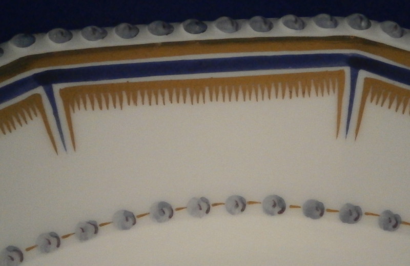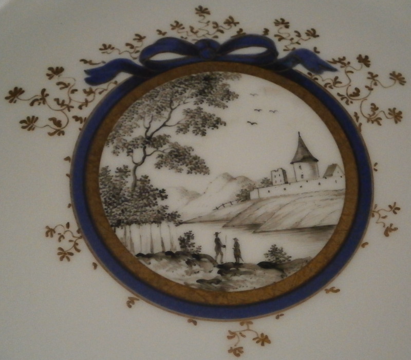 This is a nice large plate plate made by Nymphenburg in the 20th century. Not sure if this is a dinner plate size but it is slightly smaller than the other dinner size plates I own. It is from the King's or Perl service made for the electoral court around 1792-1795 designed originally by Dominikus Auliczek . The original set is still in the possession of the family and thus any pieces of this design are later copies. The plate is 12 sided and has the pearl design to the very edge (refers to the little blue raised pearls along the edge and painted ones along the edge of the well). It is hand painted with a scene in black in the center surrounded by a gold and blue trim with more blue and gold trim to the edge and another row or pearls along the edge of the well. The plate is 1.125 inches tall and 9.875 inches in diameter. It is marked with the underglaze printed shield mark with the word Nymphenburg underneath, the impressed shield mark and the usual numbers, etc. The piece is in perfect condition with some minor age / use marks to the gilding. Please email me for more information or other pictures.