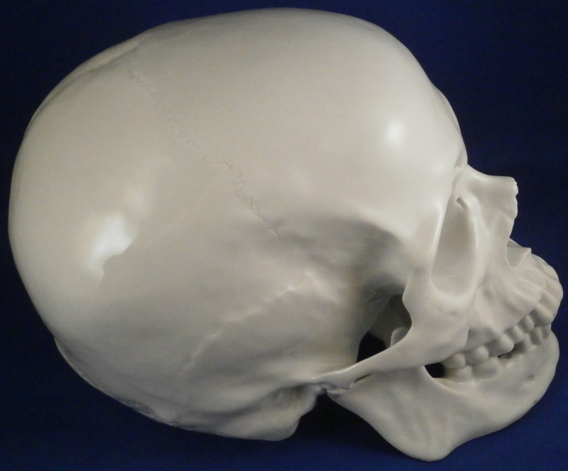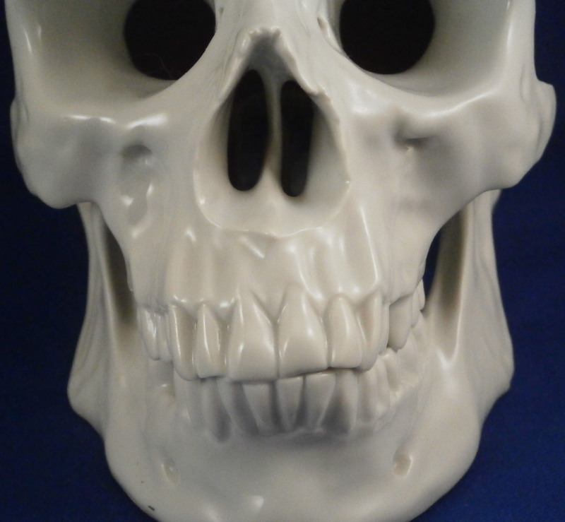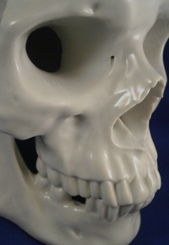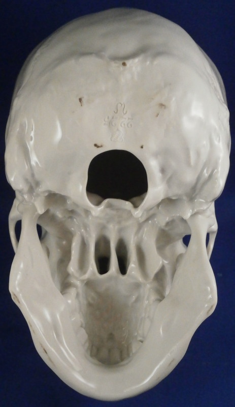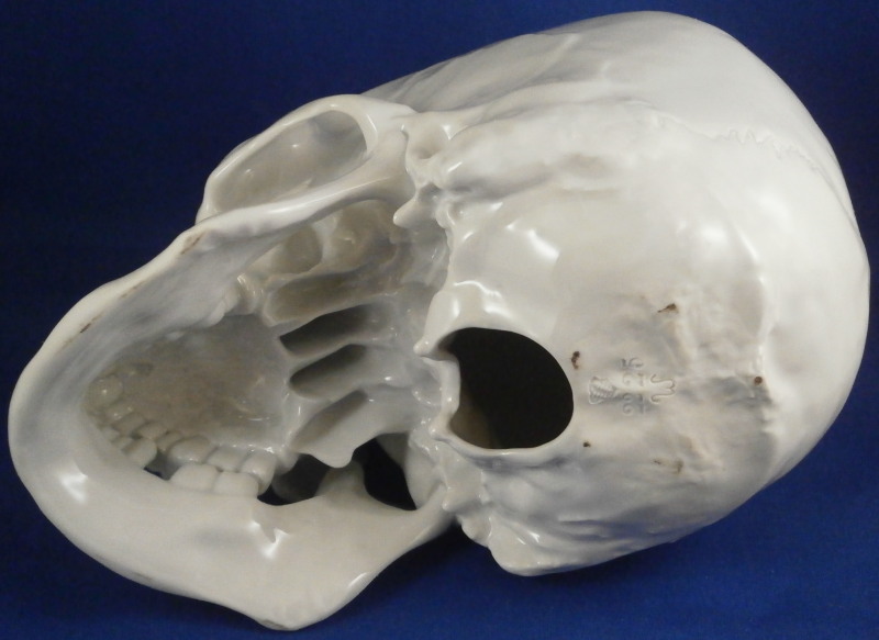 This is a piece I have always wanted to have - a more or less full sized version in porcelain of the human skull made by Nymphenburg in the 20th century. I ahve owned the miniature versions but have until now never come across the large size. I was super thrilled and even my kids love it :) These are really hard to find and just fun to have on your desk. You can play Shakespeare anytime you want - to be or not to be . Or just a memento mori to remind us to live life to the fullest. The detail of the modeling is amazing! It is marked underneath as shown with the impressed shield as well as the model number 2225 and a scipt W or something along those lines. Just the type of odditity that one has to see and own :) The piece is about 5.25 inches tall, 4 inches wide and 7 inches long. The piece is in perfect condition. Please email me for more information or other pictures.