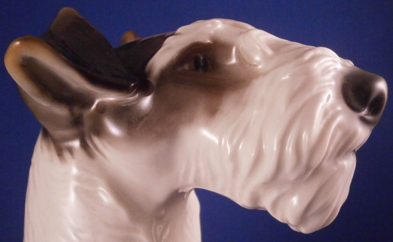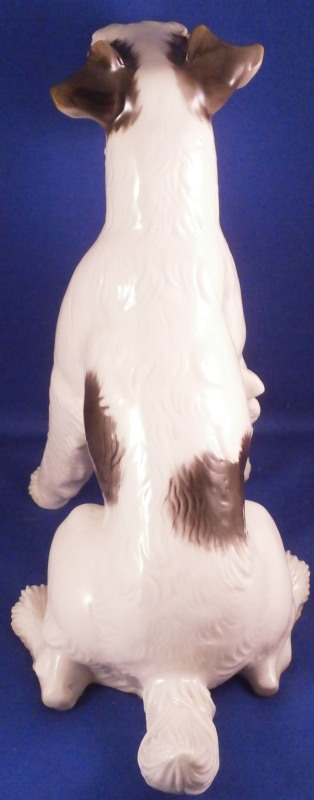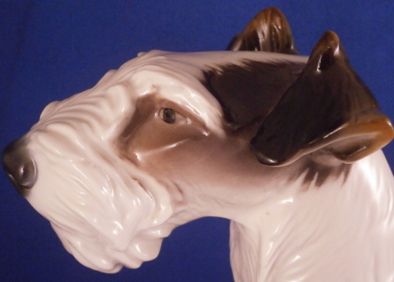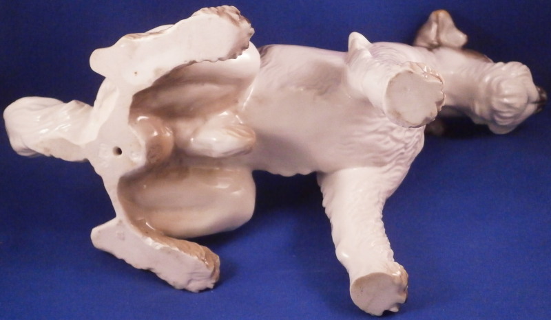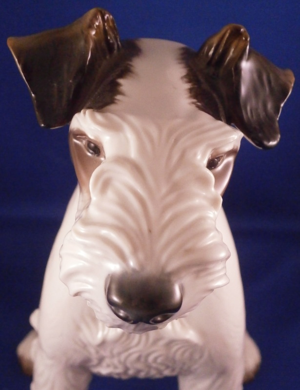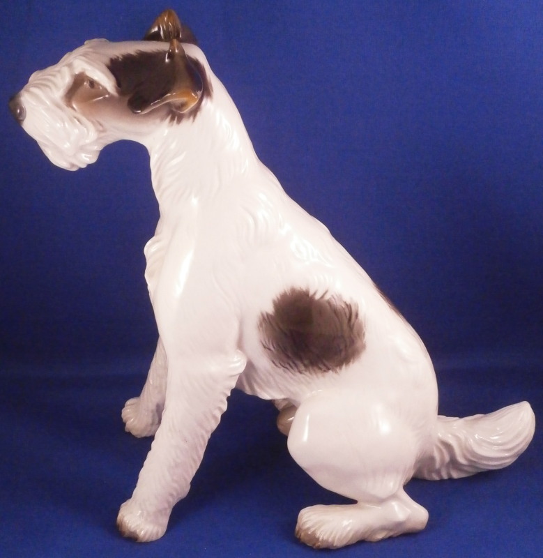 This is a nice large figure of a dog made by Nymphenburg in the early to mid 20th century. I do believe it is a terrier but am somewhat clueless in the dog department :) Either way he is superbly modeled (just look at the fur!) and painted just right to make him very elegant. Nice size as well so he looks great on display. The dog is 8.625 inches tall, 4.75 inches wide and 8.75 inches long. The figurine is marked with the impressed shield mark on the bottom front of his butt as well as with the impressed numbers 628 and 5. Artist initials in black on the back of his left back foot. He is in superb condition with a couple of tiny white spots in the back of his fur from when he was made and the color didn't quite cover them. He displays perfectly and I am jsut being my usual picky self. Please email me for more information or other pictures.