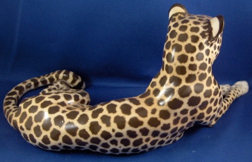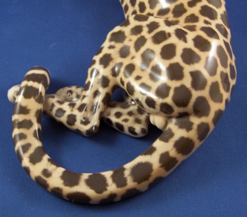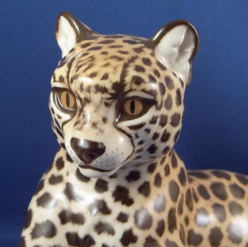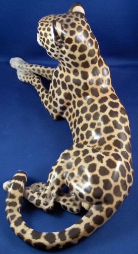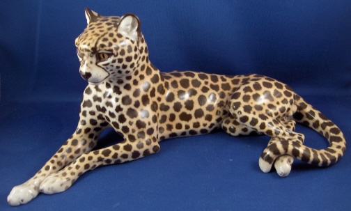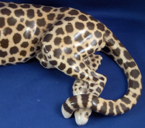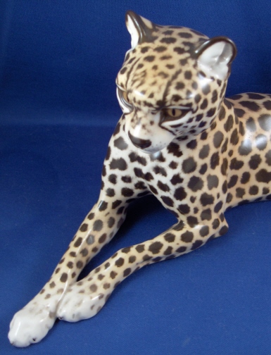 This is a superb figurine of a cheetah made by Nymphenburg around 1950. It was first designed by Kaerner around 1911 and is one superbly modeled and painted animal figurine! One of my new favorites! The leopard is 4.875 inches tall, 11.125 inches long and 5 inches deep so rather large. He ( and he is a He!) is marked with the impressed shield mark underneath with the model number 326 over 8 and the green shield mark with the word Nymphenburg and Western Germany which dates it to right after WWII. There is also an artist mark that looks to be ZL or LZ on his behind. The earlier pieces have this and are generally of better quality than the newer ones! He is in perfect condition same as the day he left the factory :) New this cost just under 5K and the quality is not nearly as good! Please email me for more information or other pictures.