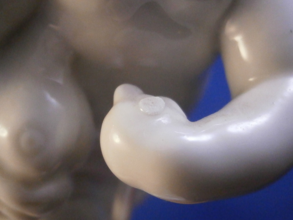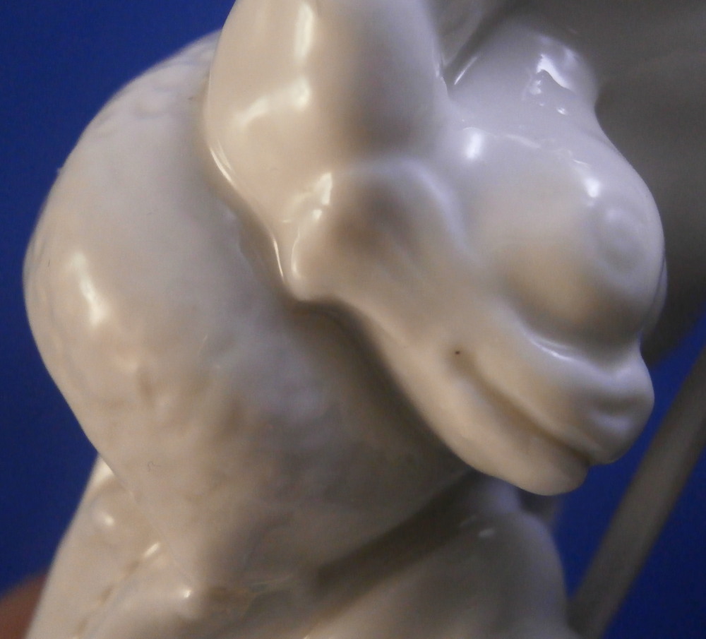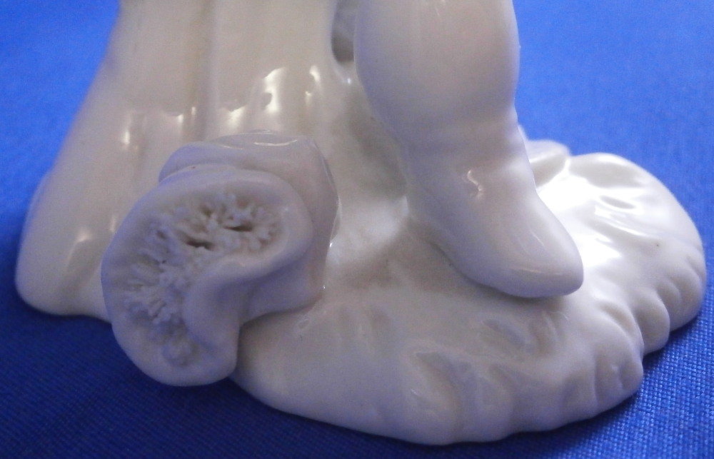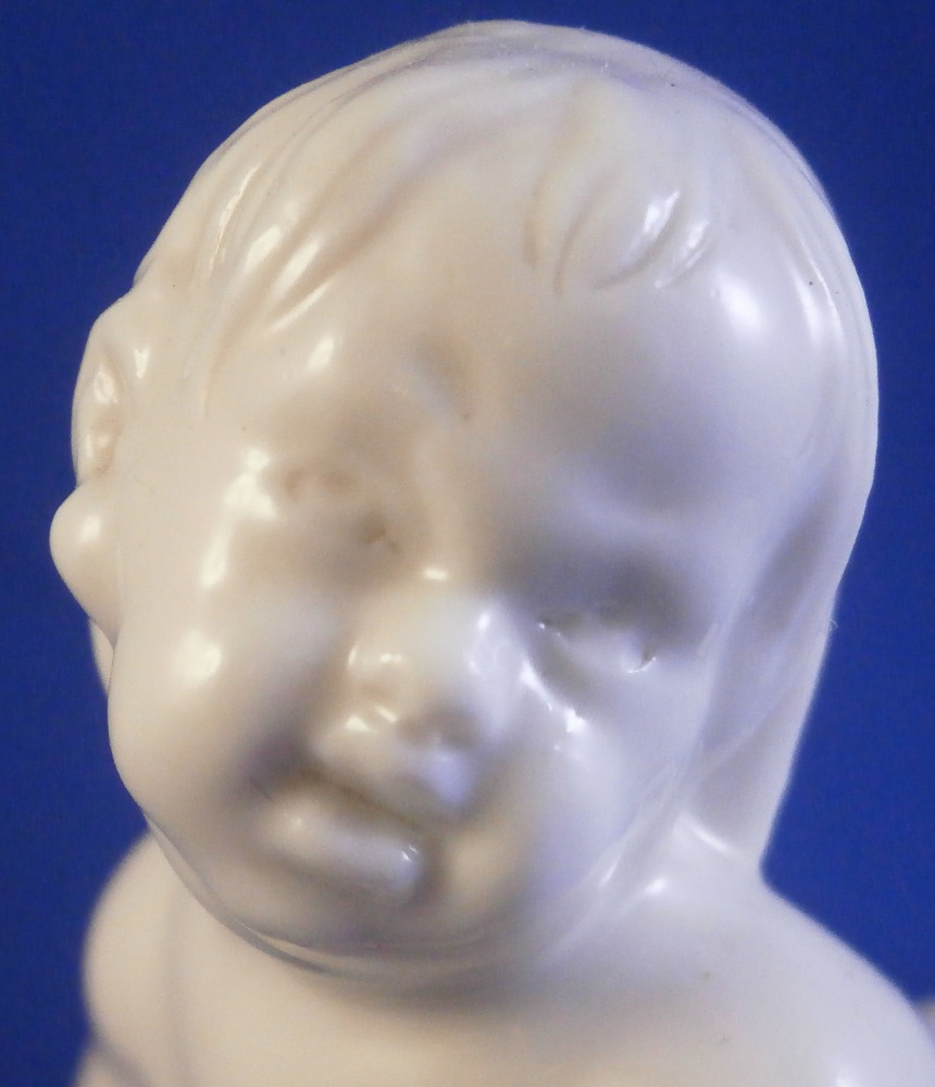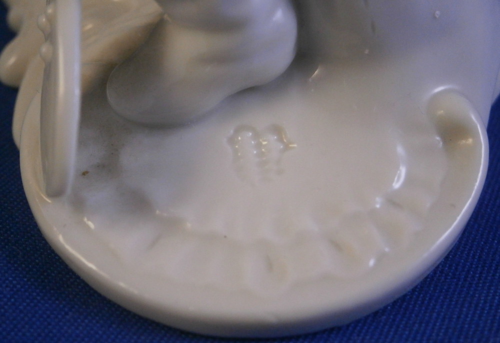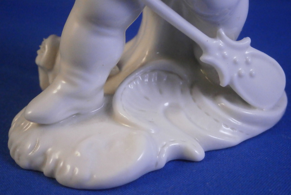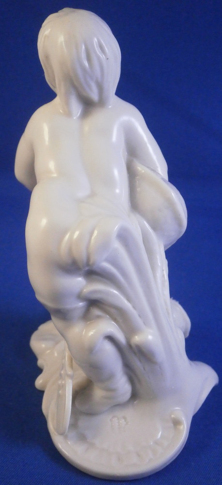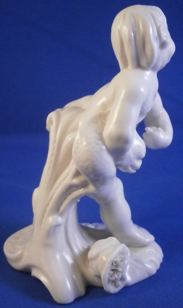This is a figurine made by Nymphenburg in the earlier 20th century.Originally made by Franz Anton Bustelli in the 18th century and I own that original version as well. I really only bought this little guy here to be able to show the difference in quality between the 18th century version and the more modern redo. Quite interesting to see the differences. The figure is of the god Neptune who is holding a rudder in his left hand and a fish in his right hand that covers his private section with its tail. There are some reeds to the back and a seashell or something along those lines on the base. It's a great looking piece! The figure is in great condition with just the very tip of the handle in his hand broken off the top. Not obvious since it is flush with the hand. The figure is marked underneath with an impressed shield mark as well as the model number 245 over 3. The figurine is 3.875 inches tall, 2 inches wide and 2.625 inches deep. Please email me for more information or other pictures.