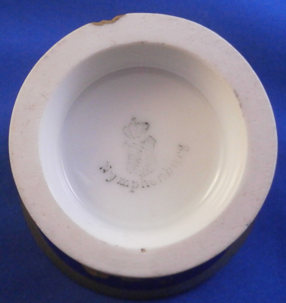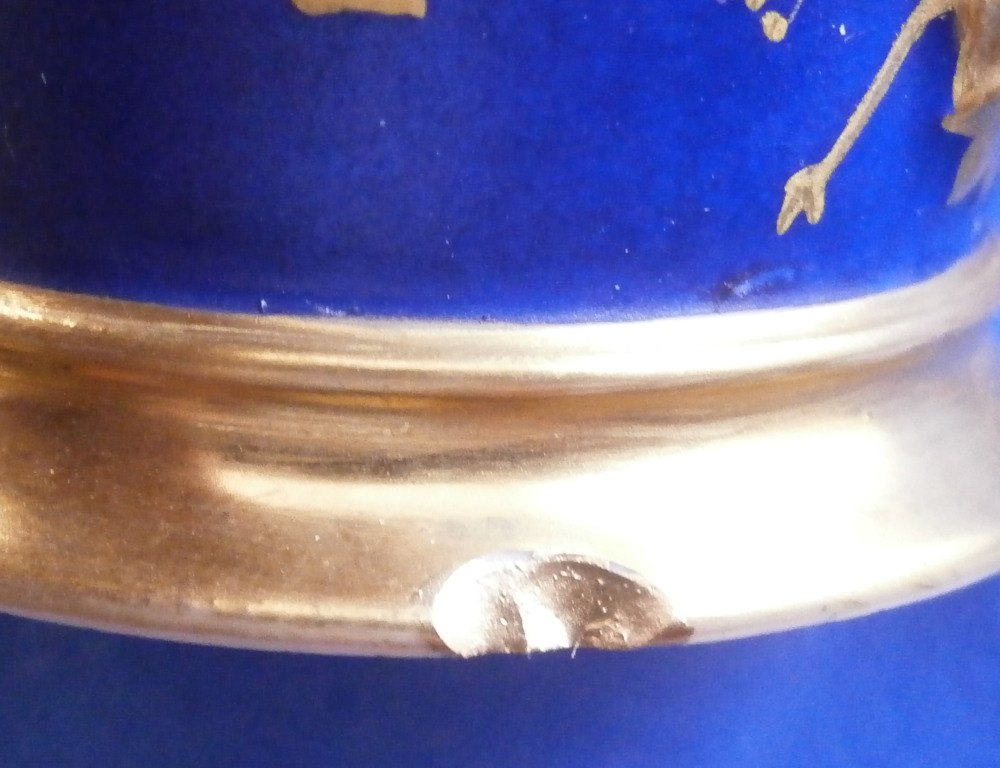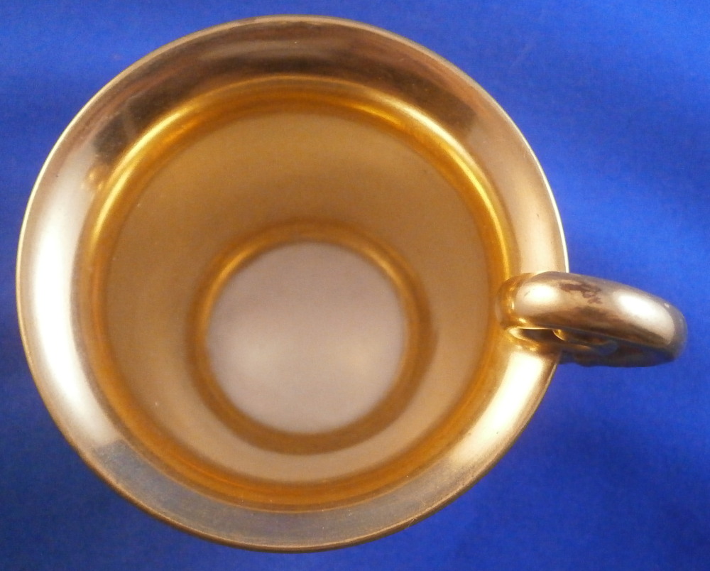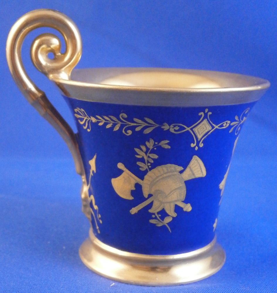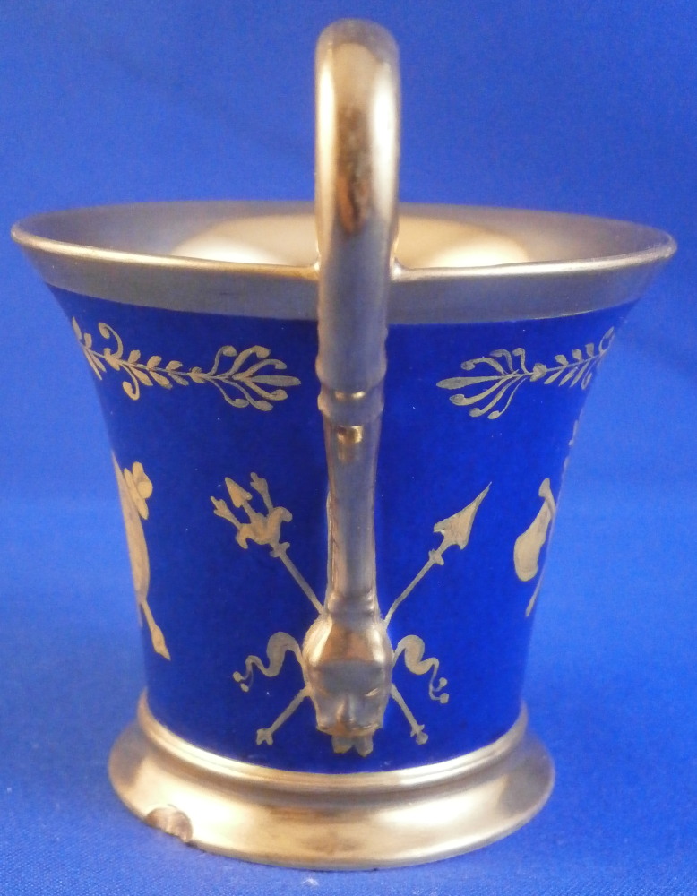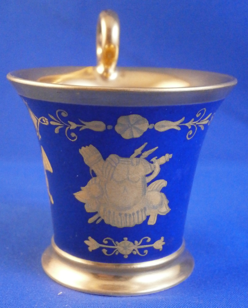 This is a nice little demitasse cup made by Nymphenburg in the early 20th century. A really nice piece from this period with a perfect blend of a superb shape with a matte blue ground color and lots of superb tooled gilding. Fully gilded handle and inside. A nice color combo for sure! I always really like the matte ground colors but they are so rare that one does not see them often. I think they look much better with the nice gilding than a shiny ground color. The handle has a nice shape to it. The piece is 2.75 inches tall including the handle and 2.375 in diiameter. It is marked with the under glaze green shield mark with the word Nymphenburg underneath as well as a hard to see impressed shield mark. The cup displays nicely but does have a chip to the foot as shown that was gilded in to hide it a bit better. Worthy of having it properly restored for sure. No saucer! It's a great example that one really never sees anymore. I also own a few other pieces from this set I will add to the site. Please email me for more information or other pictures.