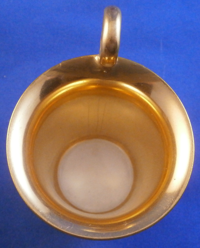 This is a nice little demitasse cup made by Nymphenburg in the early 20th century. A really nice piece from this period with a perfect blend of a superb shape with a matte blue ground color and lots of superb tooled gilding. Fully gilded handle and inside. A nice color combo for sure! I always really like the matte ground colors but they are so rare that one does not see them often. I think they look much better with the nice gilding than a shiny ground color. The handle has a nice shape to it. The piece is just under 2.75 inches tall including the handle and 2.375 in diiameter. It is marked with the under glaze green shield mark with the word Nymphenburg underneath as well as a hard to see impressed partial shield mark. The cup displays nicely but the handle was broken and repaired along with the edge where it attaches as shown. Could be done a bit better but works as is. Worthy of having it properly restored for sure. No saucer! It's a great example that one really never sees anymore. I also own a few other pieces from this set I will add to the site. Please email me for more information or other pictures.
