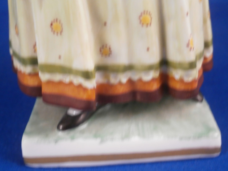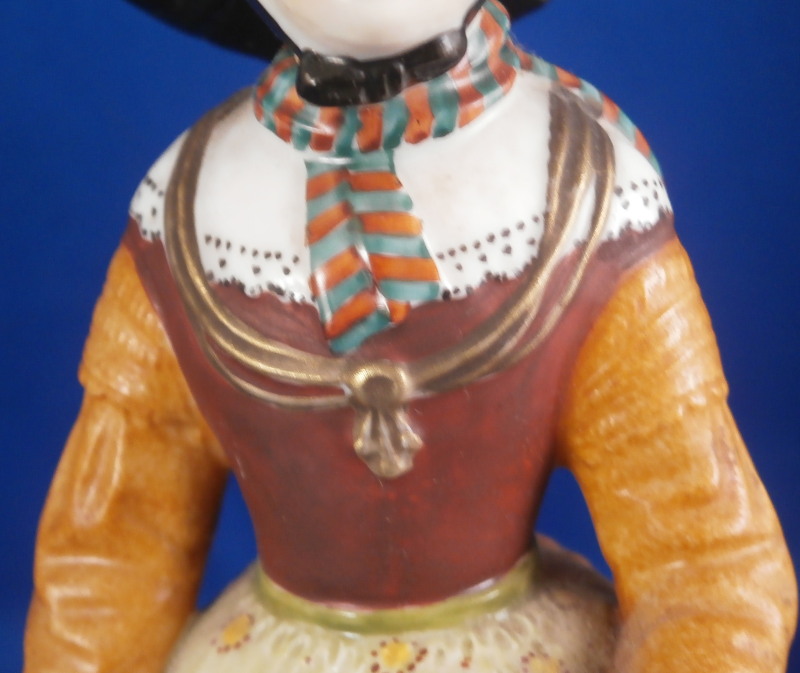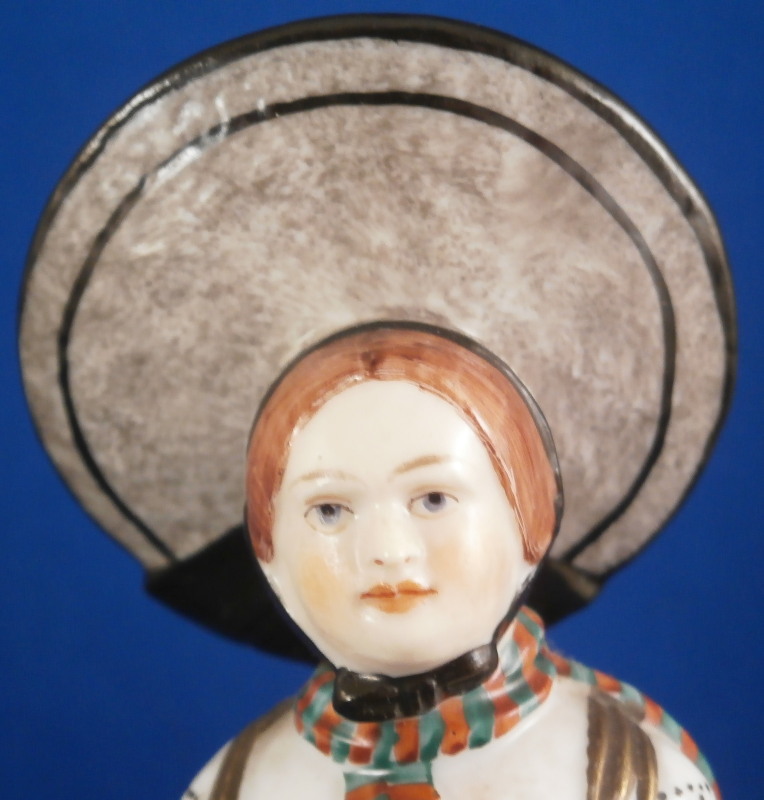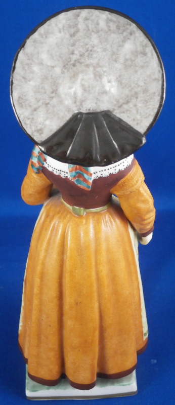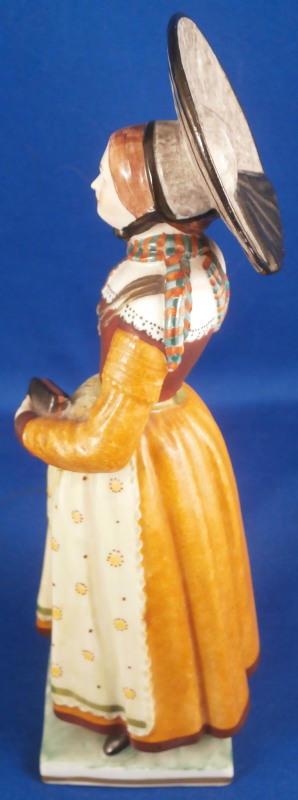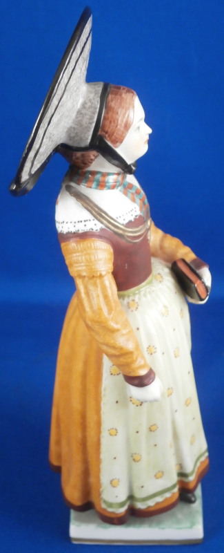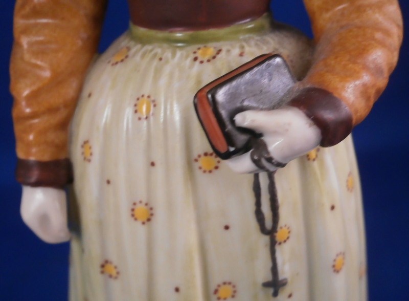 This is a figurine of a lady in traditional dress made by Nymphenburg around 1880. She is called the Milchmaedchen in German which I assume translates to milk maid and is a model I have not seen before and had a tough time finding in my books, etc. She is very well modeled and hand painted with extreme attention to detail as all Nymphenburg pieces are. The lady is wearing a huge hat, dressed in a nice outfit and holding a book (presumably a bible) in her left hand as well as a necklace with a cross on it. She is marked with the impressed shield mark as well as an incised model number 208. I am unsure when this model was first designed but she is likely from the original period. The figure is 6.5 inches tall, 2.375 inches wide and 2.25 inches deep. She is in perfect condition. Please email me for more information or other pictures.