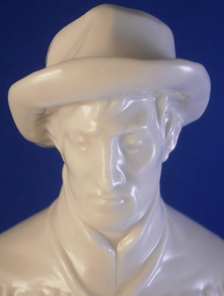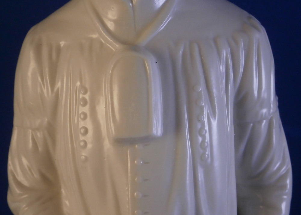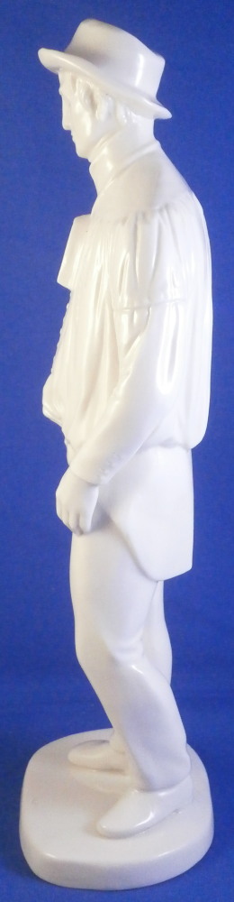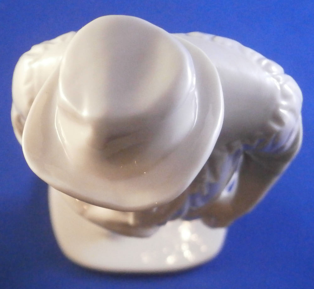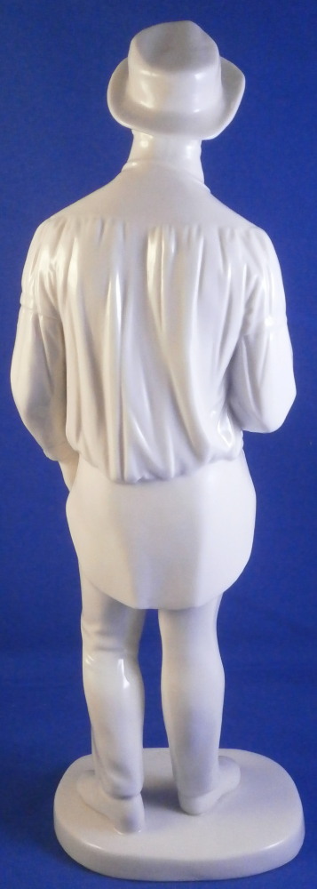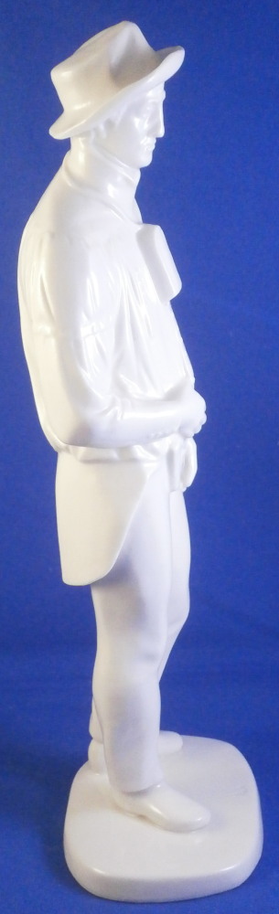This is a hard to find figurine of a Miner made by Nymphenburg in the early 20th century. The figure is of a miner wearing his work outfit - with a leather piece covering his rear end, a hat, a Tscherpertasche which is either a leather pouch or box used by German miners (Bergleute) for carrying tools, tobacco, or valuables and a Freiberger Blende which is a type of mining lamp. He is standing on a simple base. These miner figurines are very hard to find and this one here is really nice and in perfect condition. The figurine is 9.5 inches tall, 3.125 inches wide and 2.375 inches deep. He is marked with the impressed shield mark on top of the base in the front as well as underneath plus the impressed numbers 959 over 0 plus the green shield mark with the crown above and Nymphenburg below it as shown. Please email me for more information or other pictures.