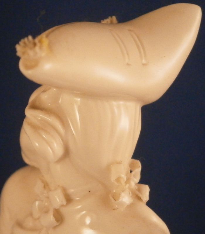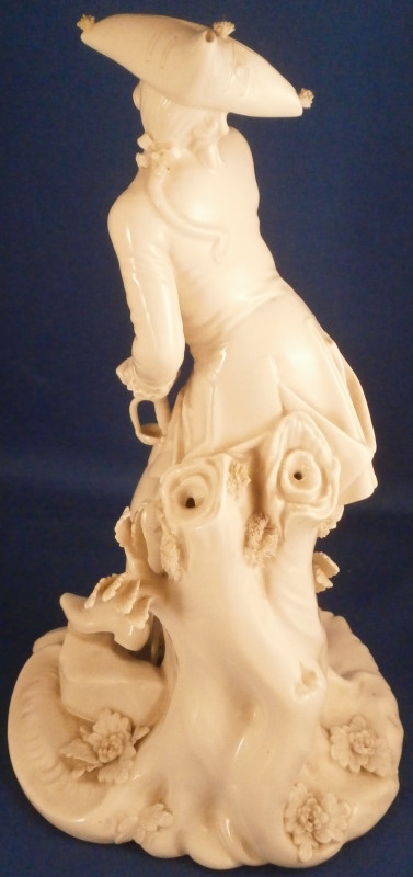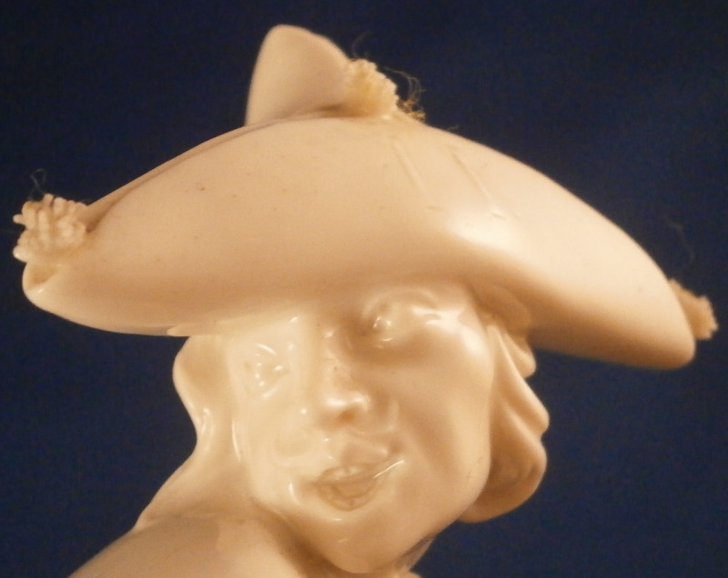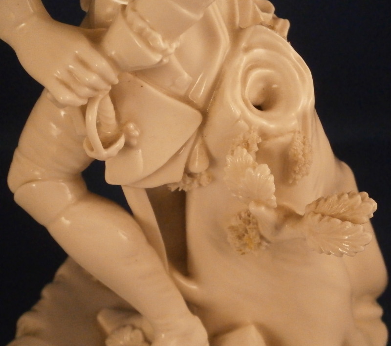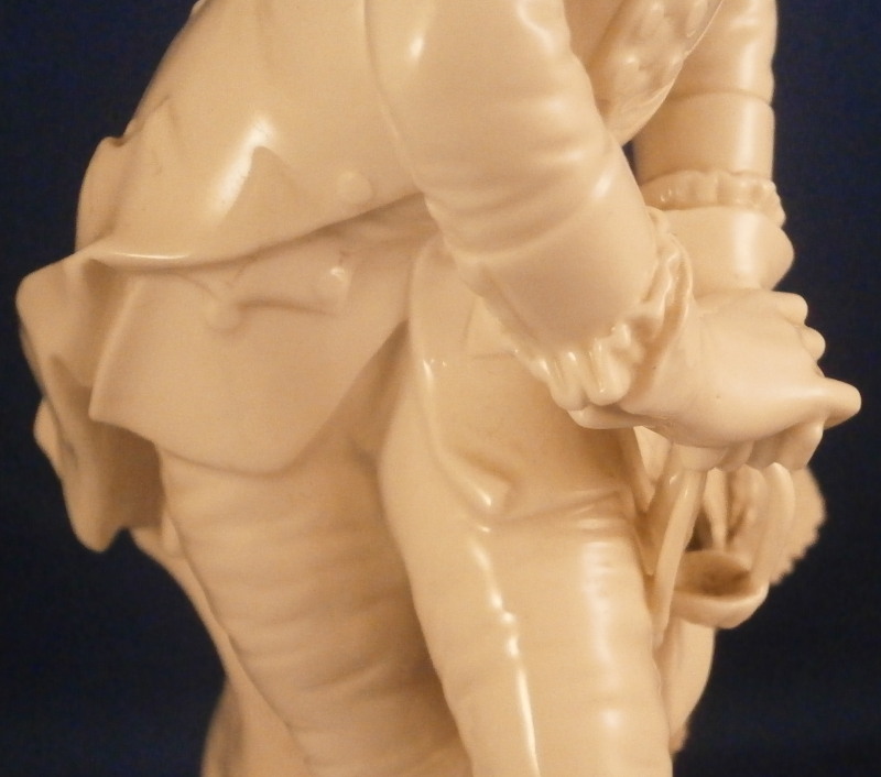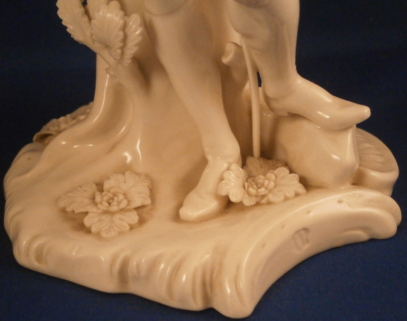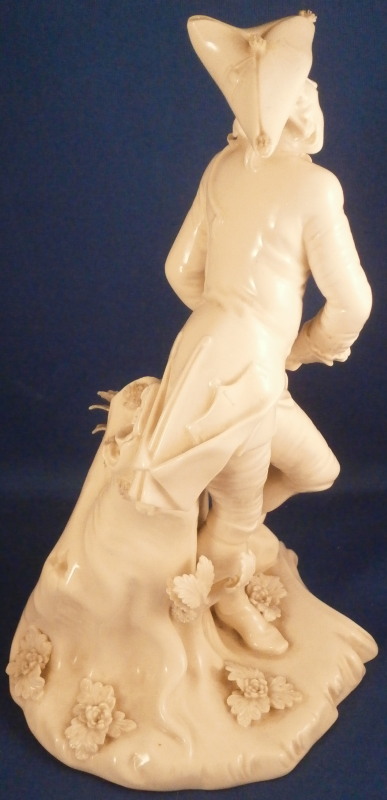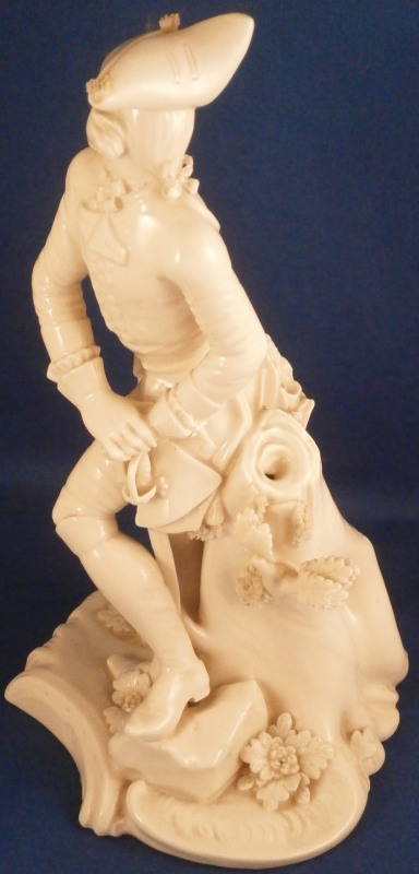 This is a fun figure of mischievous soldier made by Nymphenburg in the early 20th century. Originally modeled by the famous Franz Anton Bsutelli in the mid 18th century they remade these figures in the late 19th and early 20th century and some of them are still made today. The soldier is laughing at someone else with his head pointed sideway. He is dressed in uniform with both hands on the swords by his side with some greenery on the base and a tree trunk in the back. An early version of this model with the flat base and holes in the tree trunk rather than the underside of the base. The figurine is nicely modeled and left in the white (pure white not off white as the photos show) to show off all that superb detail. The figure has the impressed shield mark to the front of the base as well as underneath with the impressed numbers 169 over 0 as shown. The piece is amazing in perfect condition even the leaves and the bows! Not a figure one sees often at all. The figurine is 8.25 inches tall, 4.75 inches wide and 4.5 inches deep. Please email me for more information or other pictures.