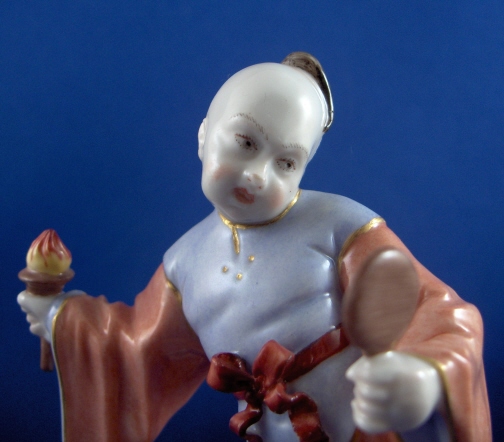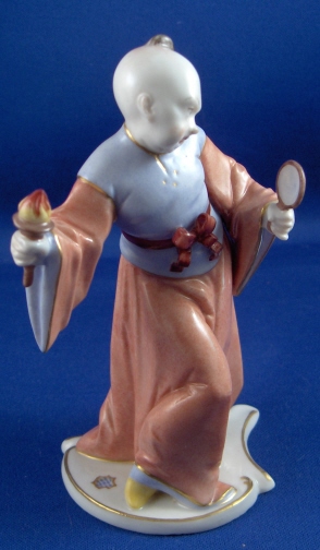 This is a little monk figurine made by Nymphenburg in the beginning of the 20th century. He is holding a torch in one hand and a mirror in the other. Superbly painted as is typical for Nymphenburg. Simple yet full of movement and elegance. He was originally designed by Bustelli in the 18th century. The figurine is 4.75 inches tall, 2.75 inches wide and 2.125 inches deep. He is in great condition with two small and unimportant paint wear marks to the orange part. The piece is marked with the impressed shield mark highlighted in blue on top of the base and underneath with an impressed 6 as well as Western Germany, Germany and the letter E. Also a very faint impressed shield mark underneath. Please email me for more information or other pictures.
