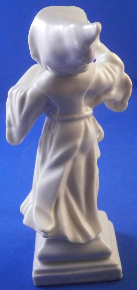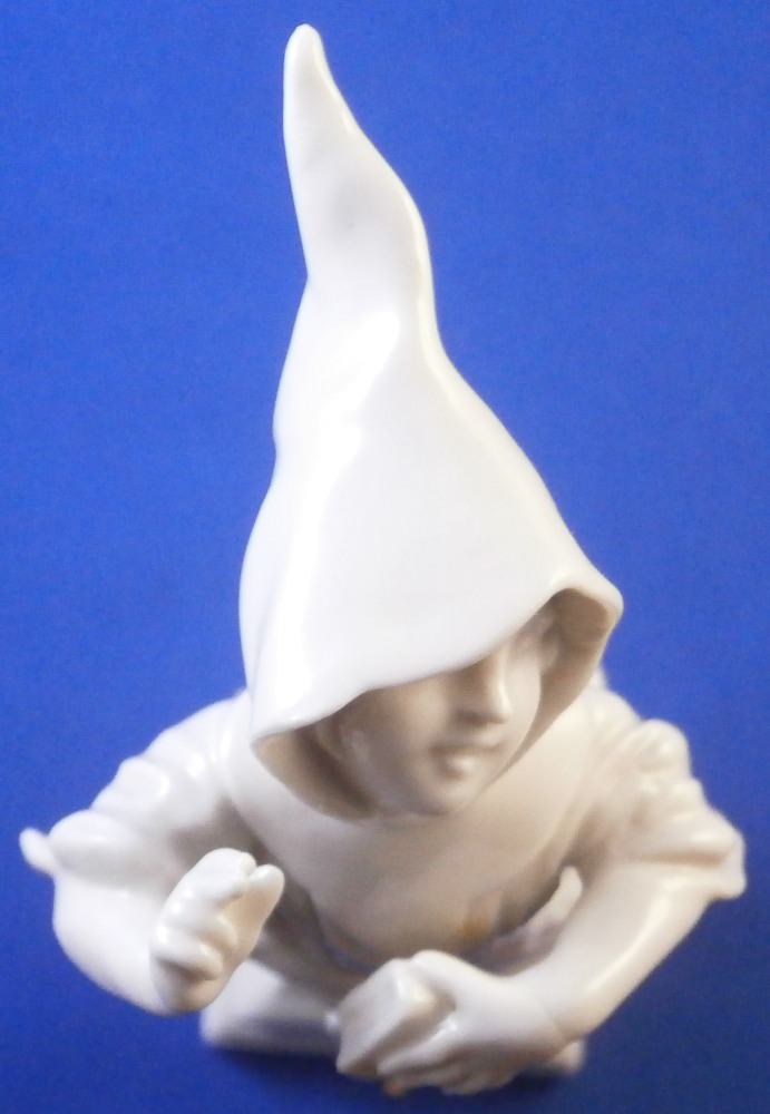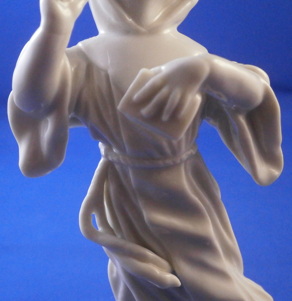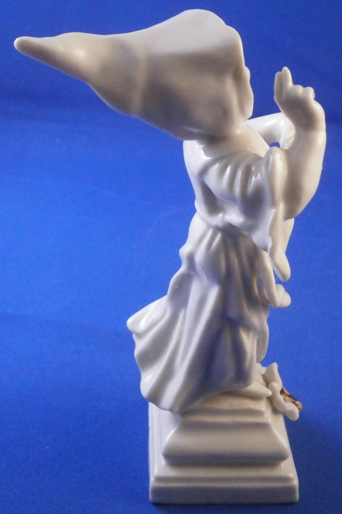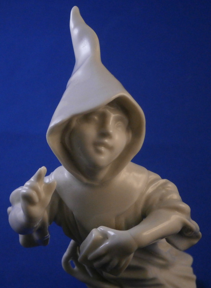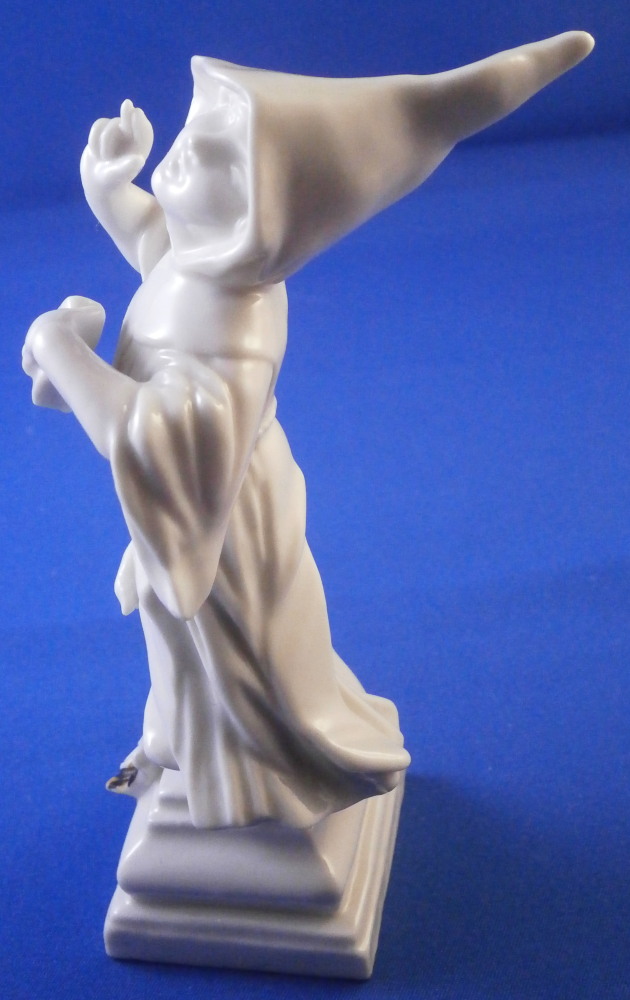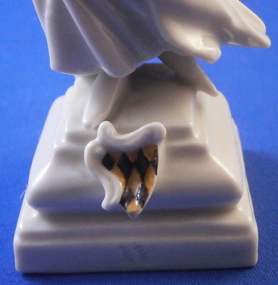 This is a figure of the Münchner Kindl made by Nymphenburg in the early to mid 20th century. The Muenchner Kindl (Munich child) has been depicted on the Bavarian coat of arms since the 13th century. The figurine is of a young child (originally it was a monk) wearing a pointy hat and flowing robe and holding a book in the left hand presumably a bible. The figurine is standing on a nice base with a small black and yellow checkered shield to the front. Not an easy to find piece and it's always sought after by collectors. A nice token to remember a trip to Munich by as well! The figurine has the impressed shield mark on the front bottom edge of the base as well as to the underside though that was partially ground away to make the figurine sit flat. Same with the model number which is now hard to read but should be 905. The piece is in great condition with a hard to spot small chip to the edge of the right sleeve. It displays perfectly! The figurine is 4.75 inches tall, 2.25 inches wide and 2.625 inches deep. Please email me for more information or other pictures.