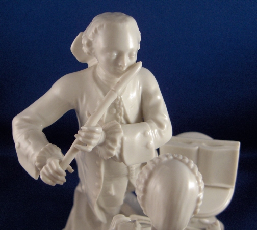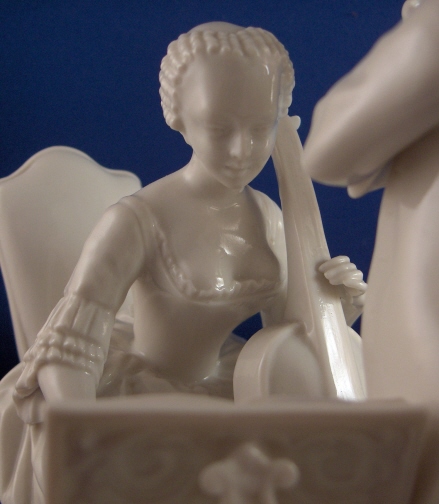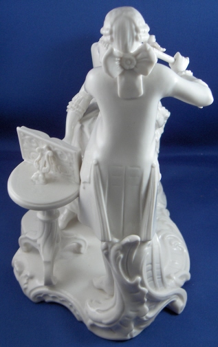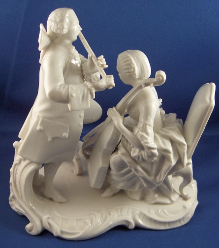 This is a figure of a pair of musicians made by Nymphenburg in the mid 20th century. It is of a lady playing the string bass and a gentleman playing a flute. A small table by their side is holding the music. The figurine 8.25 inches tall, 5.25 inches wide and 8 inches long. Marked with the impressed shield mark and impressed numbers 165 over 11. Also the underglaze blue Frankenthal CT mark with a crown above and the year mark 1968. Also another impressed shield mark to the top of the base in the front. The figurine is almost in perfect condition with just one bow on the back of her dress being chipped. Please email me for more information or other pictures.