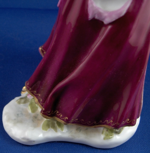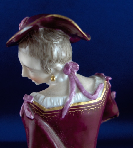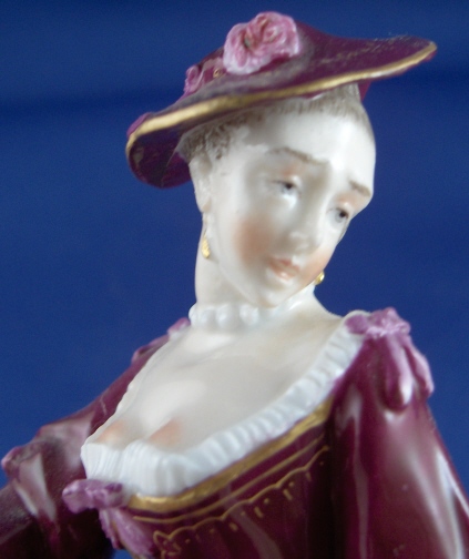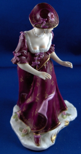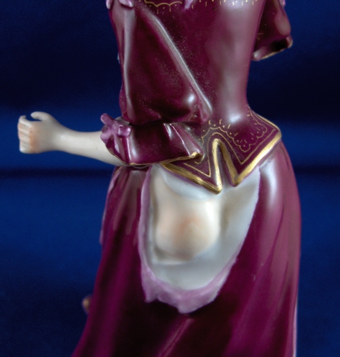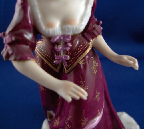 This is a figure of a lady that was attacked by a dog made by Nymphenburg around 1880 or when Baeuml first took over as director of Nymphenburg and copied the old models. This particular model does not have a dog with it which is less common. She is painted with the rarest design for this model in puce and gold. She has the impressed shield mark with the star on top as well as the impressed number 9. Actually she is marked a few times underneath. The lady is in good condition with four fingers missing a bit, a chip to the hat and a reglued section (impossible to see) to the hat. She is almost 7 inches tall, 4 inches wide and 3.75 inches deep. My favorite feature is her butt showing through the rip in the skirt. Please email me for more information or other pictures.