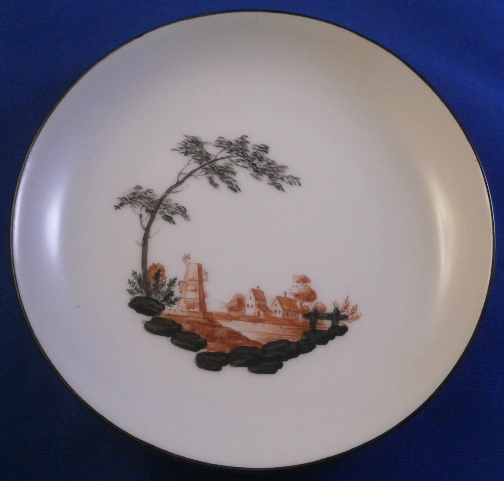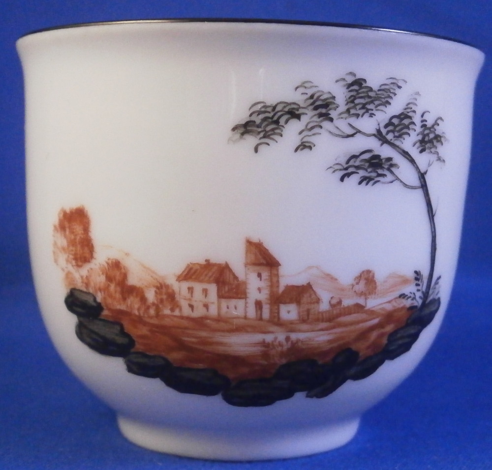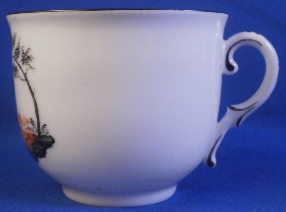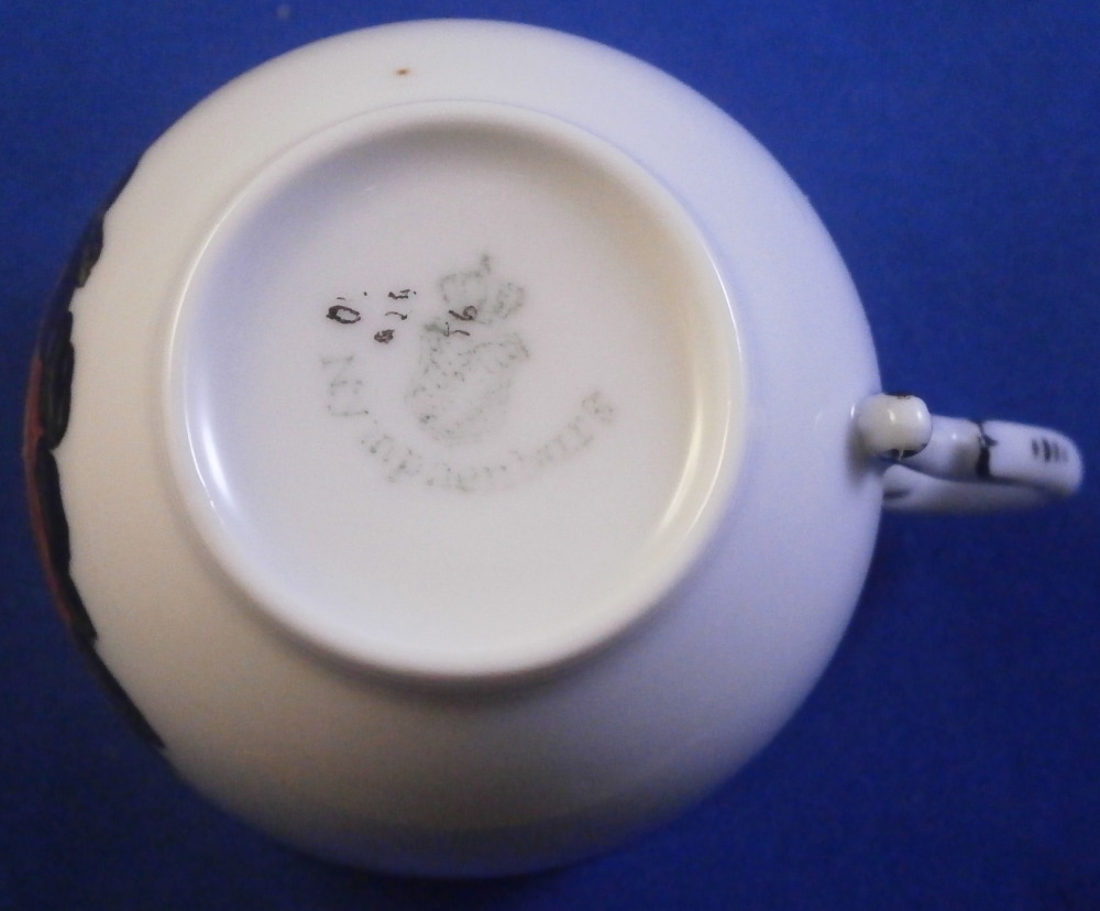 This is a very cute small cup and saucer made by Nymphenburg in the 20th century. The saucer has a superb hand painted orange and black scene in the center as well as a black trim to the edge while the cup has a matching scene to the front and black trim to the top edge and handle. That orange and black combo looks really nice! The set is marked with the green shield mark with Nymphenburg underneath as well as some black numbers and letters under the cup, orange letters and numbers under the saucer and some impressed numbers under the saucer as well. The set is in perfect condition with a brown firing spot under the saucer inside the foot ring as shown. The cup is 1.875 inches tall and 2.25 inches in diameter. The saucer is 0.75 inches tall and has a diameter of 4.5 inches. I have a couple more sets of this design if anyone is interested in a pair or more just let me know. Please email me for more information or other pictures.