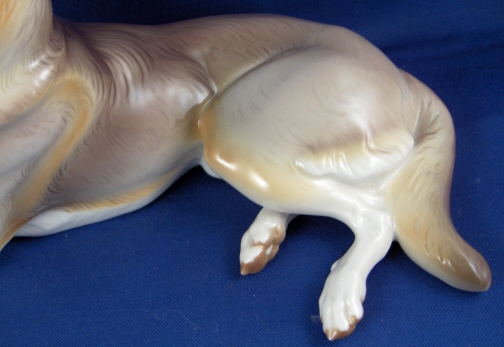This is a figurine of a German Shepherd made by Nymphenburg in the early 20th century. It is the painted version and from the original period which is hard to find! The dog is superbly modeled and painted and one of my favorites from Nymphenburg. He is in the same condition as the day he was made :) The figurine is marked underneath with the impressed shield mark and the numbers 5 and 398 as well as the modelers name Th. Kaerner one of the top animal designers to ever have lived! He also has the painter's initials on his behind J.H. The piece is 5.375 inches tall, 9.75 inches long and 4.75 inches deep. Please email me for more information or other pictures.
