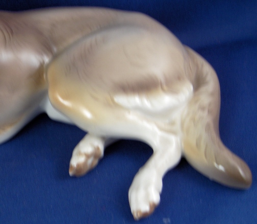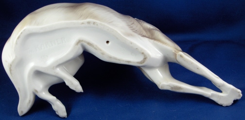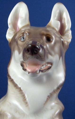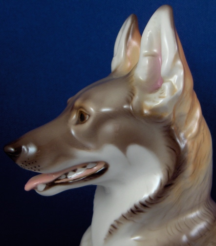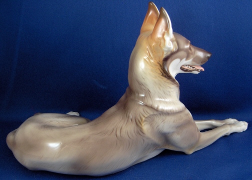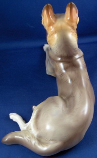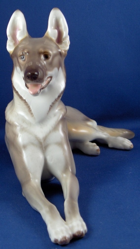 This is a figurine of a German Shepherd made by Nymphenburg in the early 20th century. It is the painted version and from the original period which is hard to find! The dog is superbly modeled and painted and one of my favorites from Nymphenburg. He is in the same condition as the day he was made :) The figurine is marked underneath with the impressed shield mark and the numbers 5 and incised 398 as well as the modelers name Th. Kaerner one of the top animal designers to ever have lived! He also has the painter's initials on his behind J.H. The piece is 5.25 inches tall, 9.75 inches long and 4.75 inches deep. Please email me for more information or other pictures.