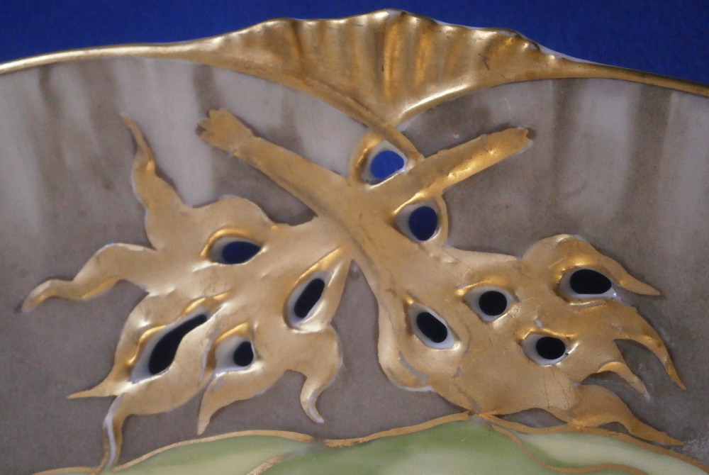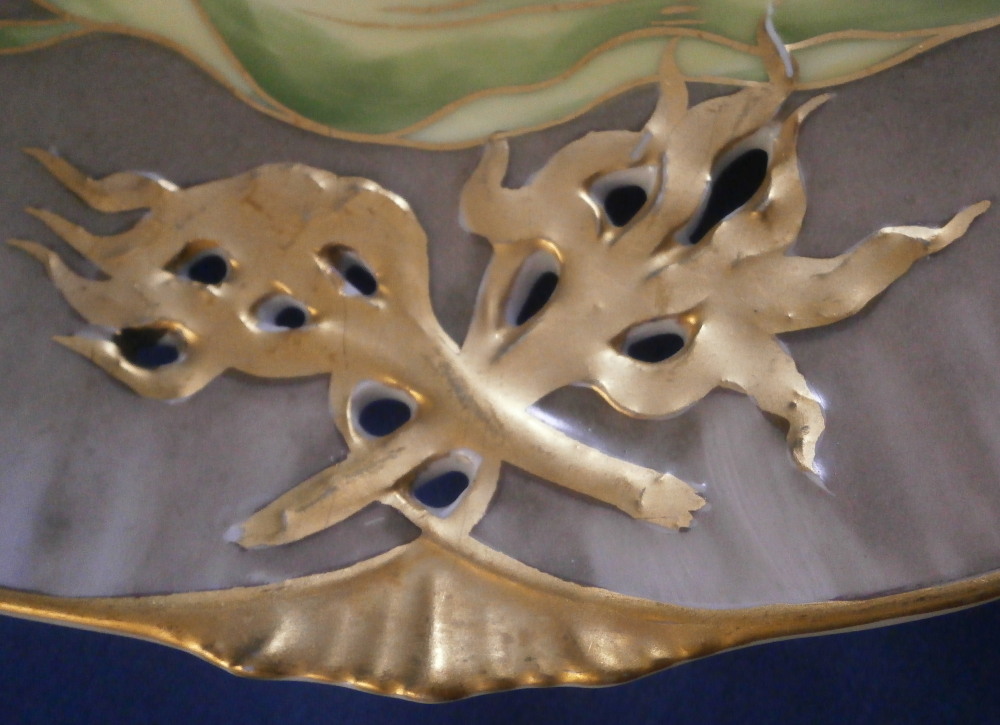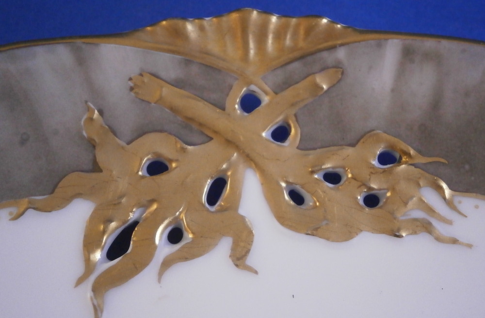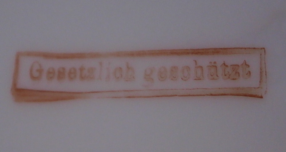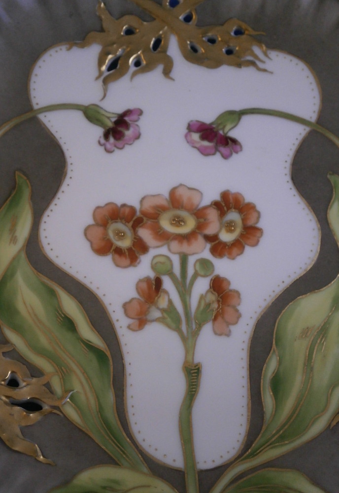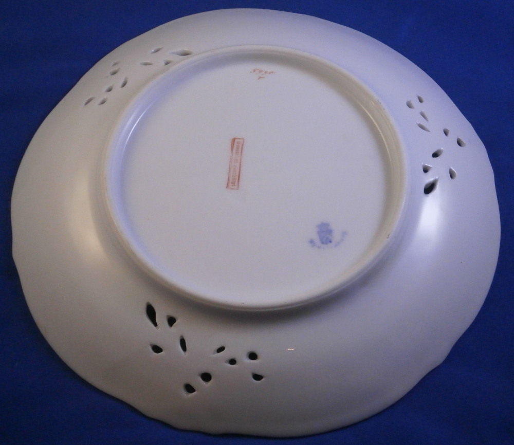 This is a superb plate made by Nymphenburg in the late 19th century during the original period for this design. It is hand painted with a very stunning Art Nouveau design that reminds me of a Georgia O'Keeffe painting but this dates to right about when she was born. The center is white with an orange and purple blossom design with the leaves of the flowers forming the sides of the design. The rim is painted with a nice grey ground color with streaks going in from the edge and three reticulated sections highlighted with gold trim with three smaller gold designs near the edge. Gold trim to the edge. These pieces are not easy to find and I really enjoy them. I have a set of five of them in different colors all from the original period with the 19th century blue shield and crown mark. The plate is 1.125 inches tall and 8.25 inches in diameter. It is in superb condition with just a touch of wear/use marks to the gilding. As nice as they come! The dish is marked underneath with the blue shield mark under a crown as well as the word Nymphenburg under that used around 1894, some red numbers and a letter as well as Gesetzlich geschuetzt (copyright) in a red rectangle as shown. It also has the impressed shield mark with the star above it used from 1890 until 1905. Please email me for more information or other pictures.
