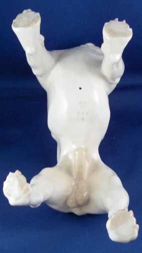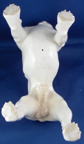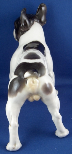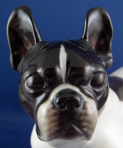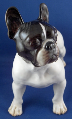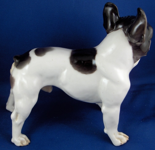This is a figure of a french bulldog made by Nymphenburg in the early 20th century. I recently sold the sitting version and was excited to replace him with this piece. A superbly modelled piece that is painted to perfection! A truly elegant dog and not one you see often at all and almost never from the original period! He is 6.375 inches tall, 7.25 inches long and 3.5 inches wide. The dog is in perfect condition, same as the day he was made. He (and it is a he!) is marked with the impressed shield mark as well as the incised numbers 648 over 9 underneath. Also marked with the artist initials hidden on his right back paw as shown. Please email me for more information or other pictures.